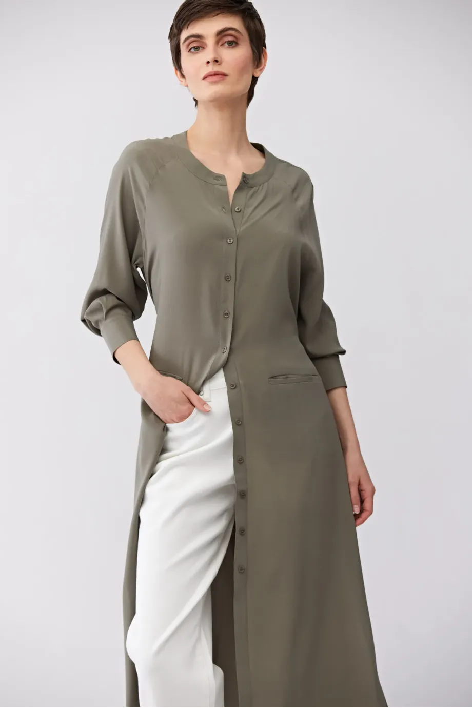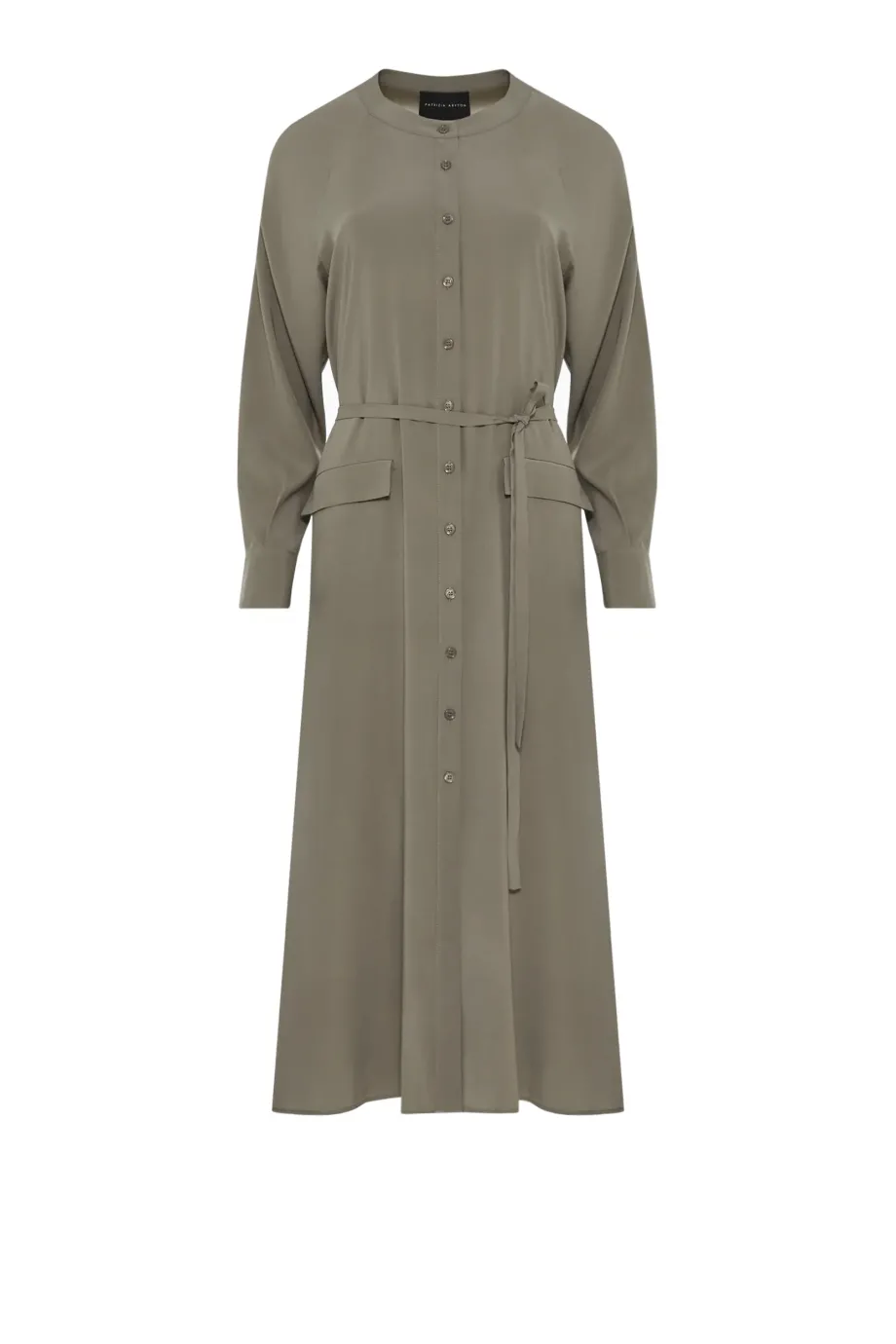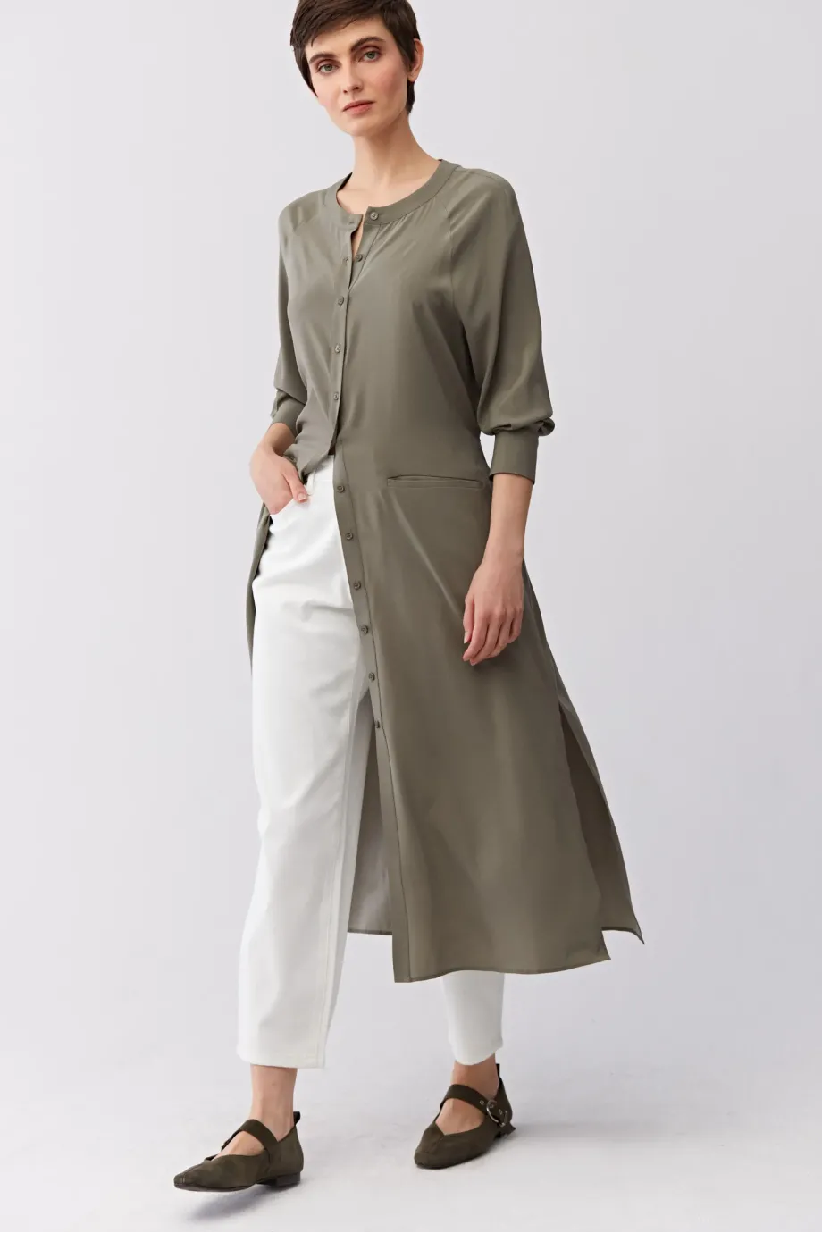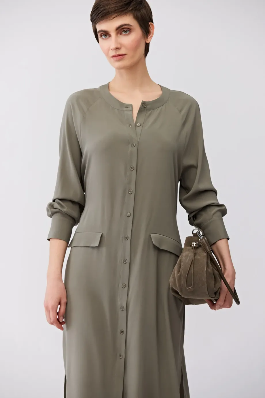 Zielona sukienka z jedwabiu. Prosta forma, z rozcięciami po bokach, długi rękaw. Pasek. Zapięcie na guziki. Długość midi.