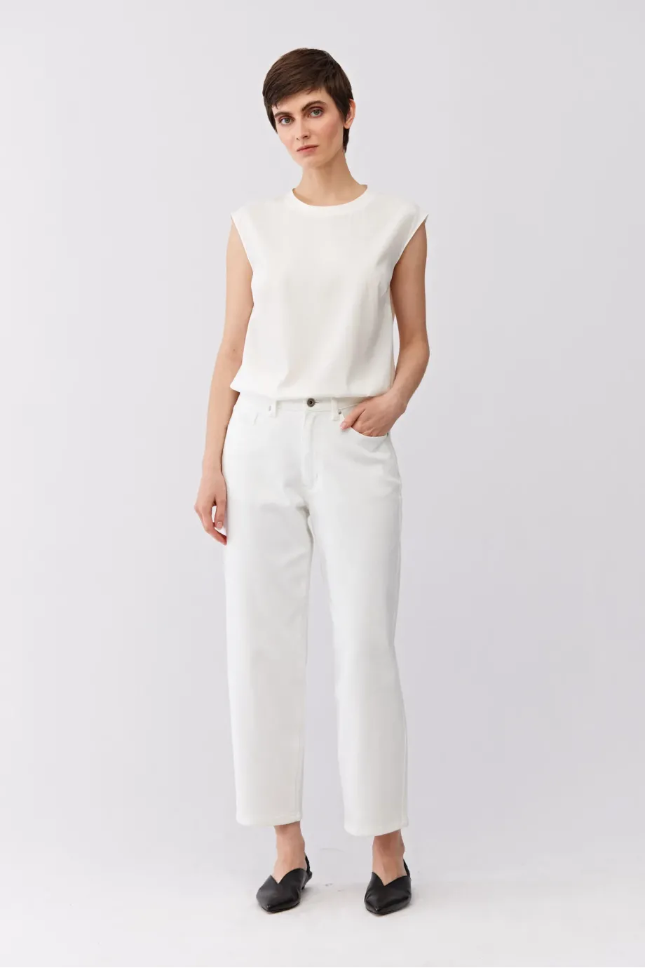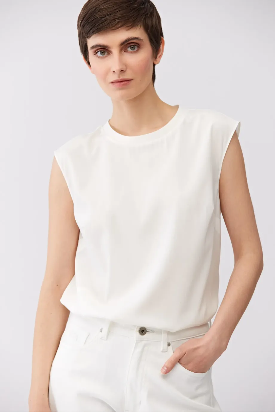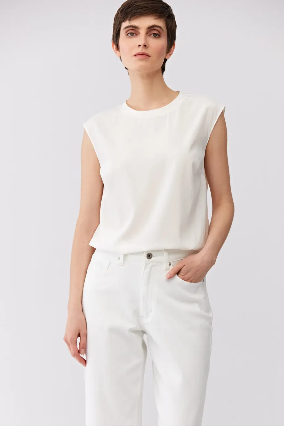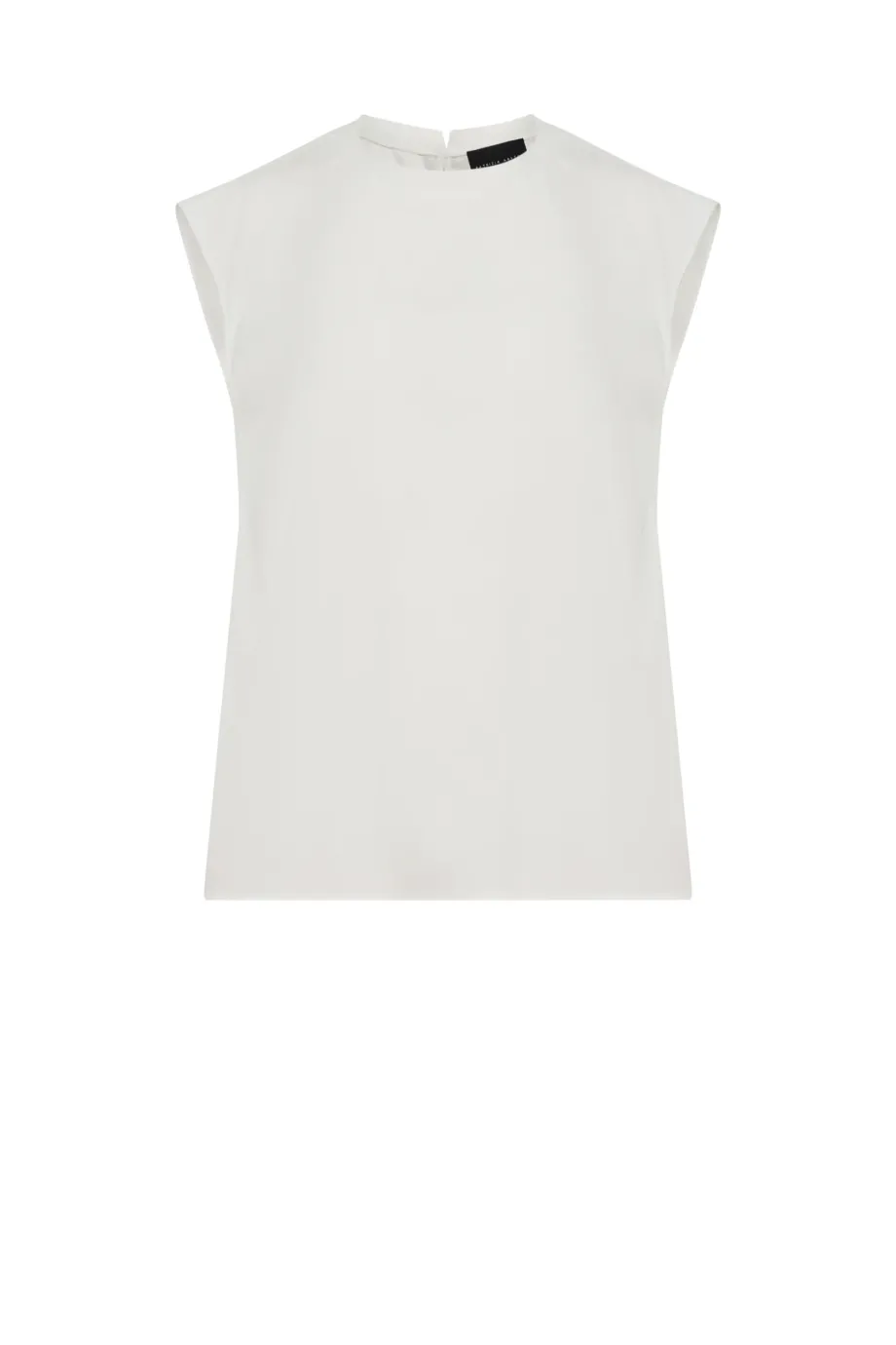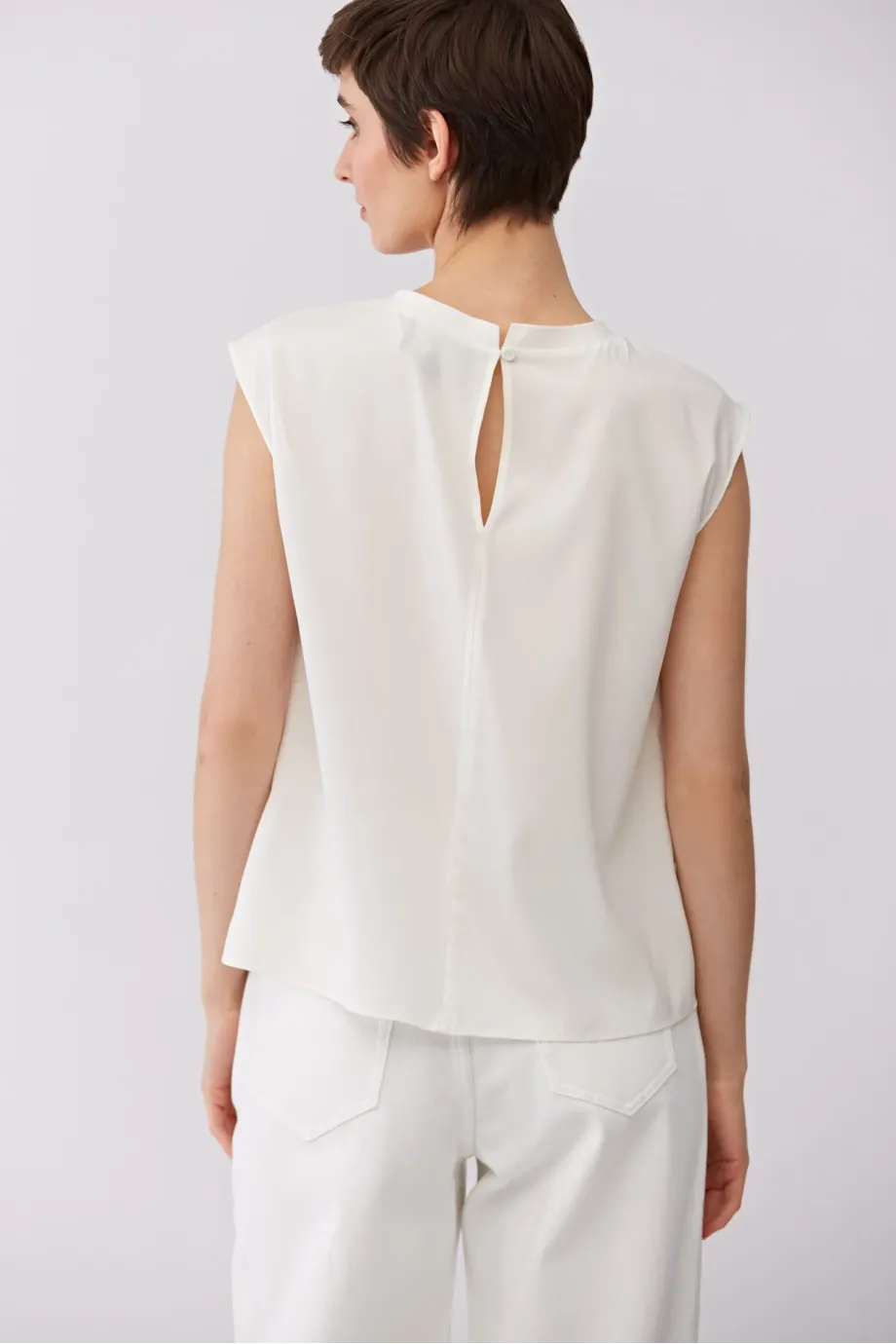 Biała bluzka z jedwabiem i dzianiną z tyłu. Okrągły dekolt. Prosta, luźna forma, bez rękawów. Z tyłu zapięcie na guzik.