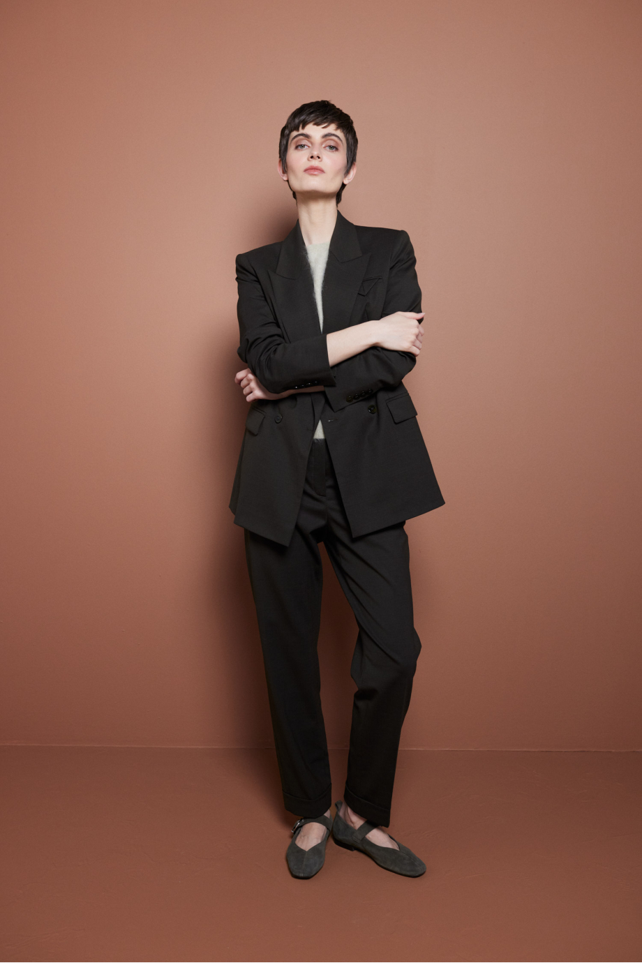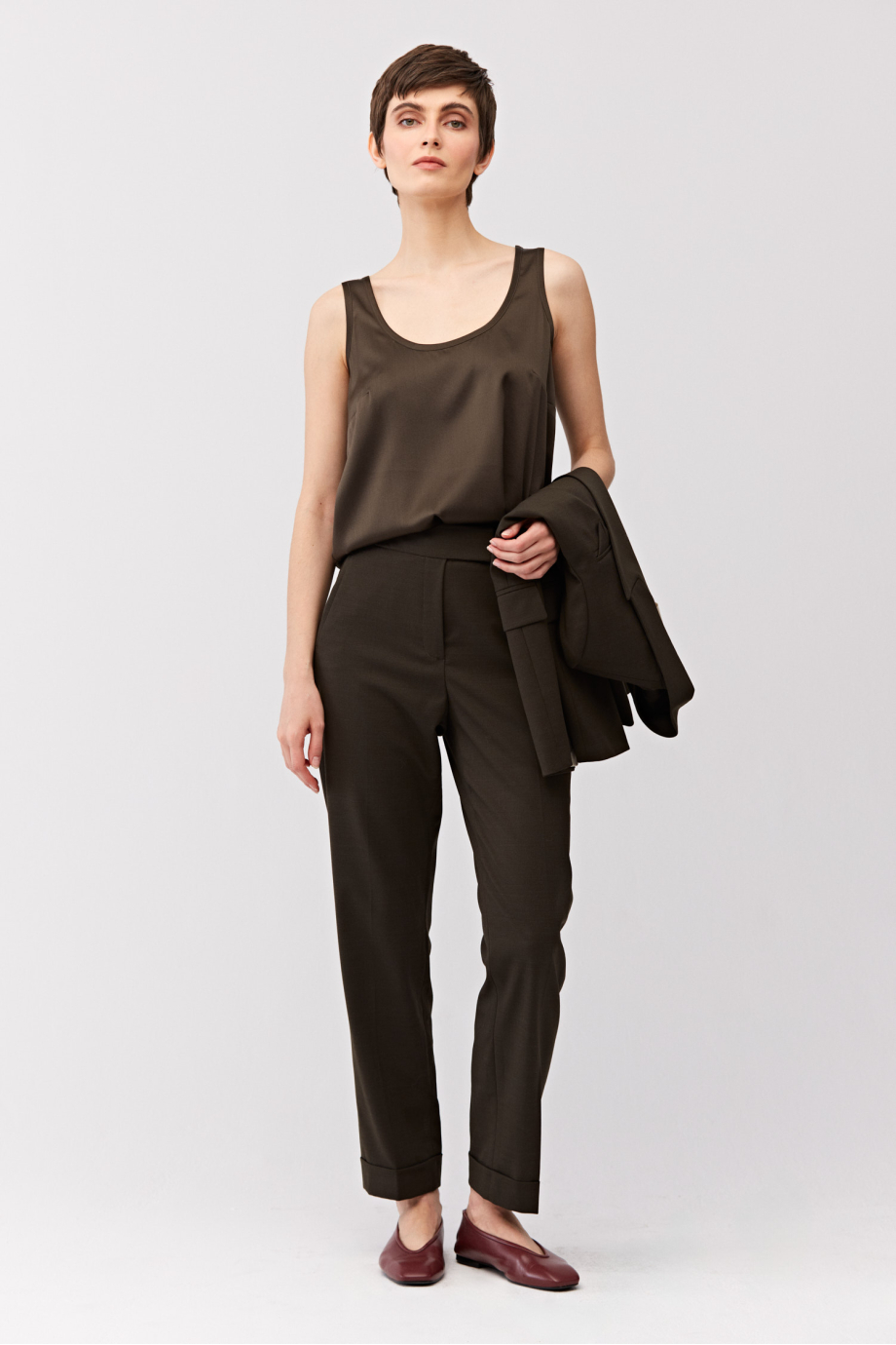 Wełniane spodnie do garnituru. Lekko zwężana nogawka, z zapięciem na suwak, haczyk i guzik corozo od środka. Wnętrze z ozdobną lamówką. Kieszenie. Kolor militarna zieleń. Do uzupełninia zestawu żakiet z tej samej tkaniny.