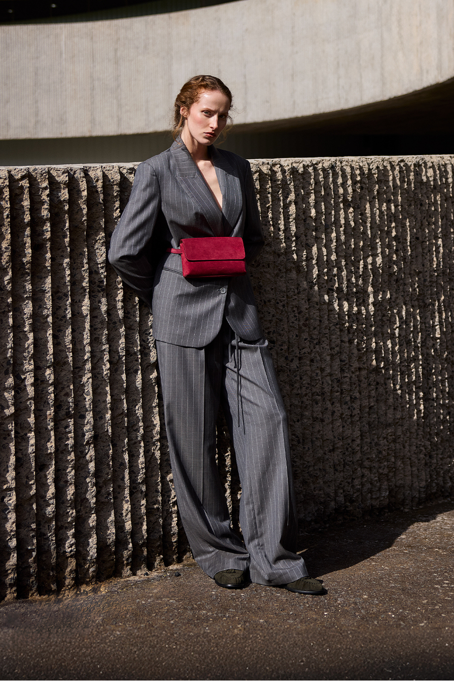 Wełniane spodnie w paski. Szeroka nogawka, zapięcie na suwak, haczyk i guzik corozo od środka. Wnętrze z ozdobną lamówką. Kieszenie i szlufki. Do uzupełninia zestawu marynarka z tej samej tkaniny.