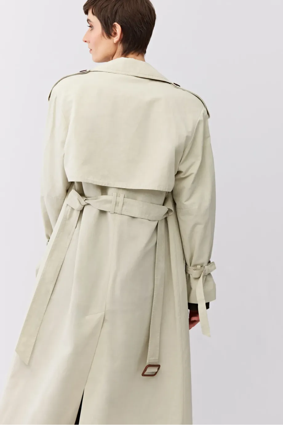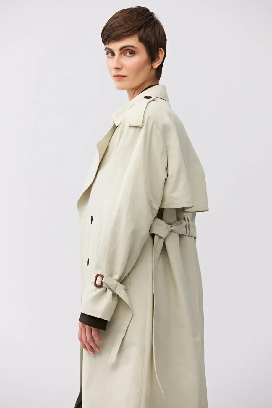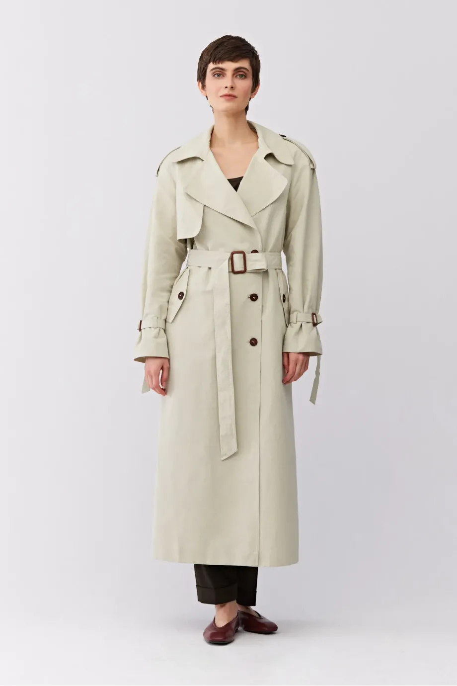 Długi trencz z paskiem. Reglanowe rękawy. Uszyty z mieszanki bawełny i lnu. Pasek w talii. Kołnierz, pagony na rękawach. Guziki z naturalne. Kieszenie.
