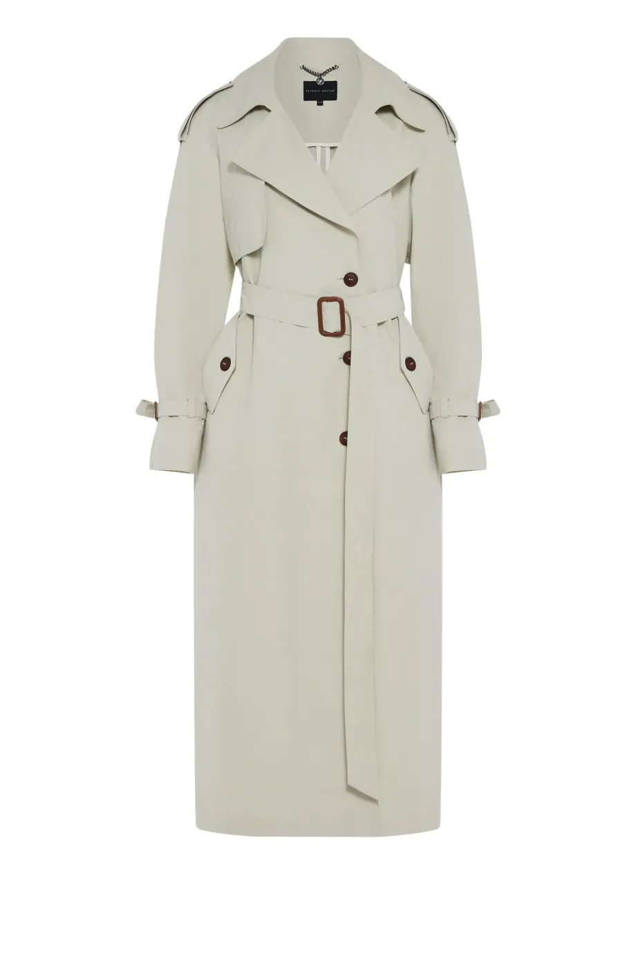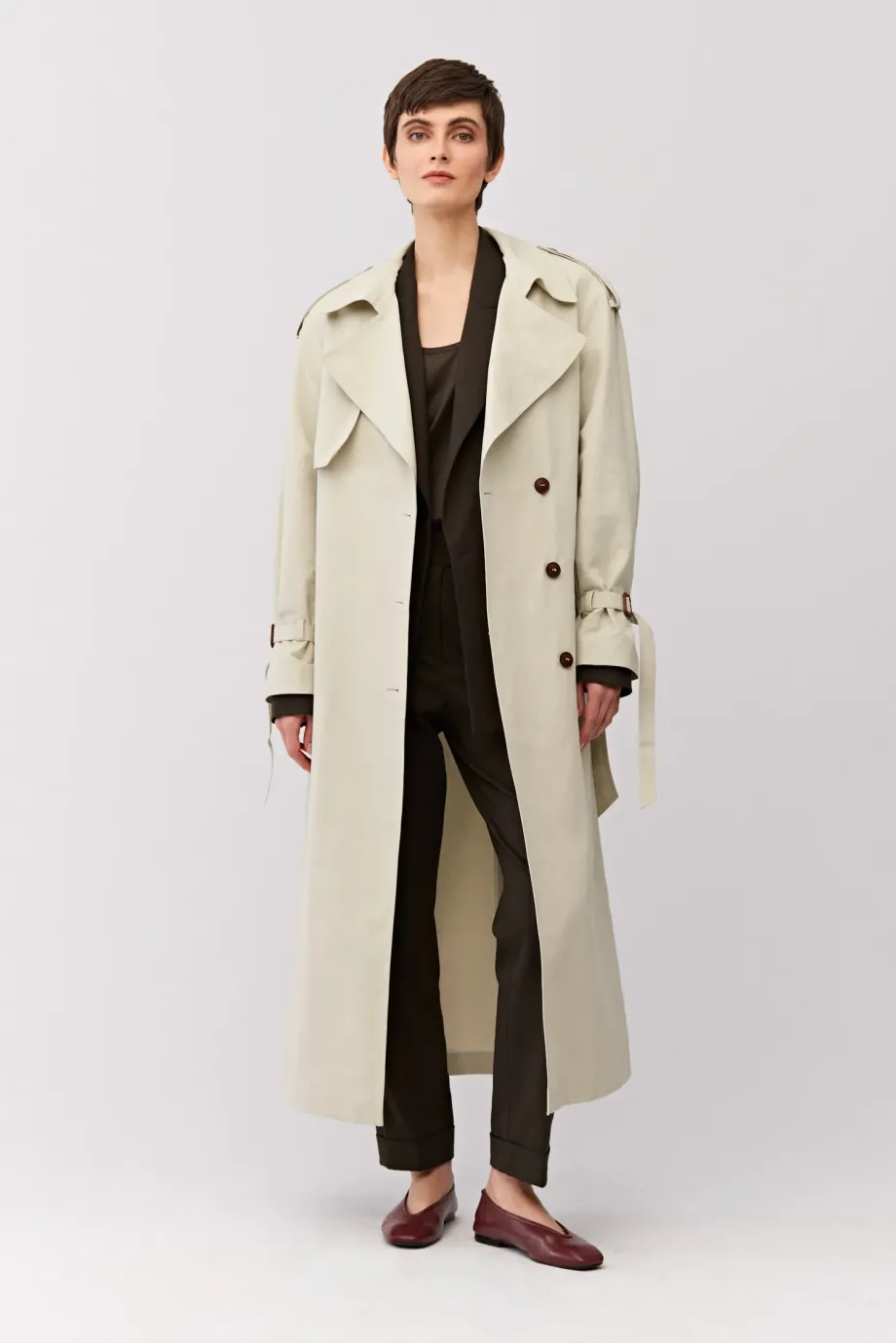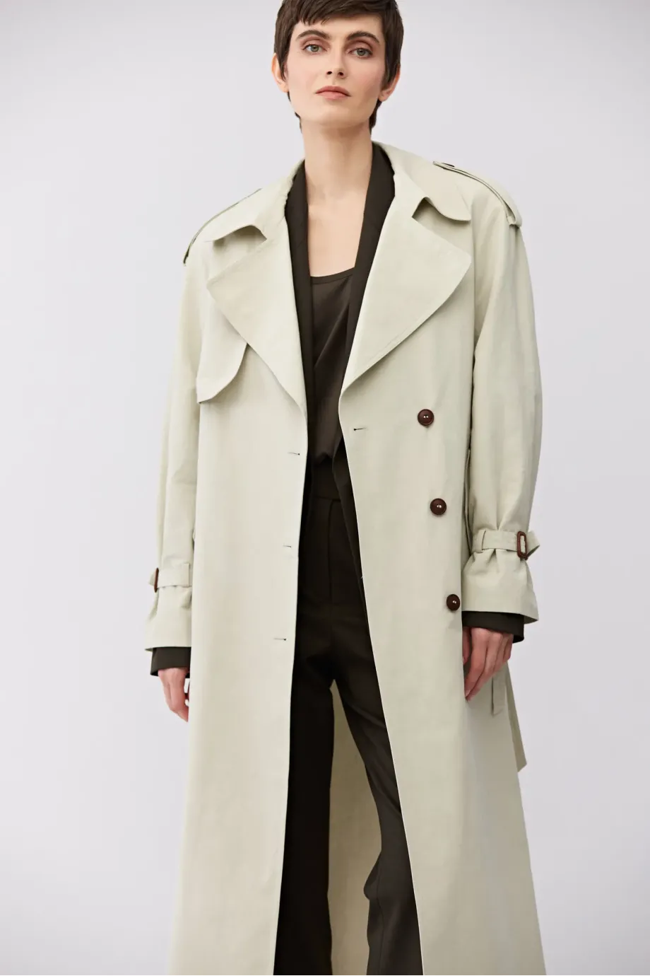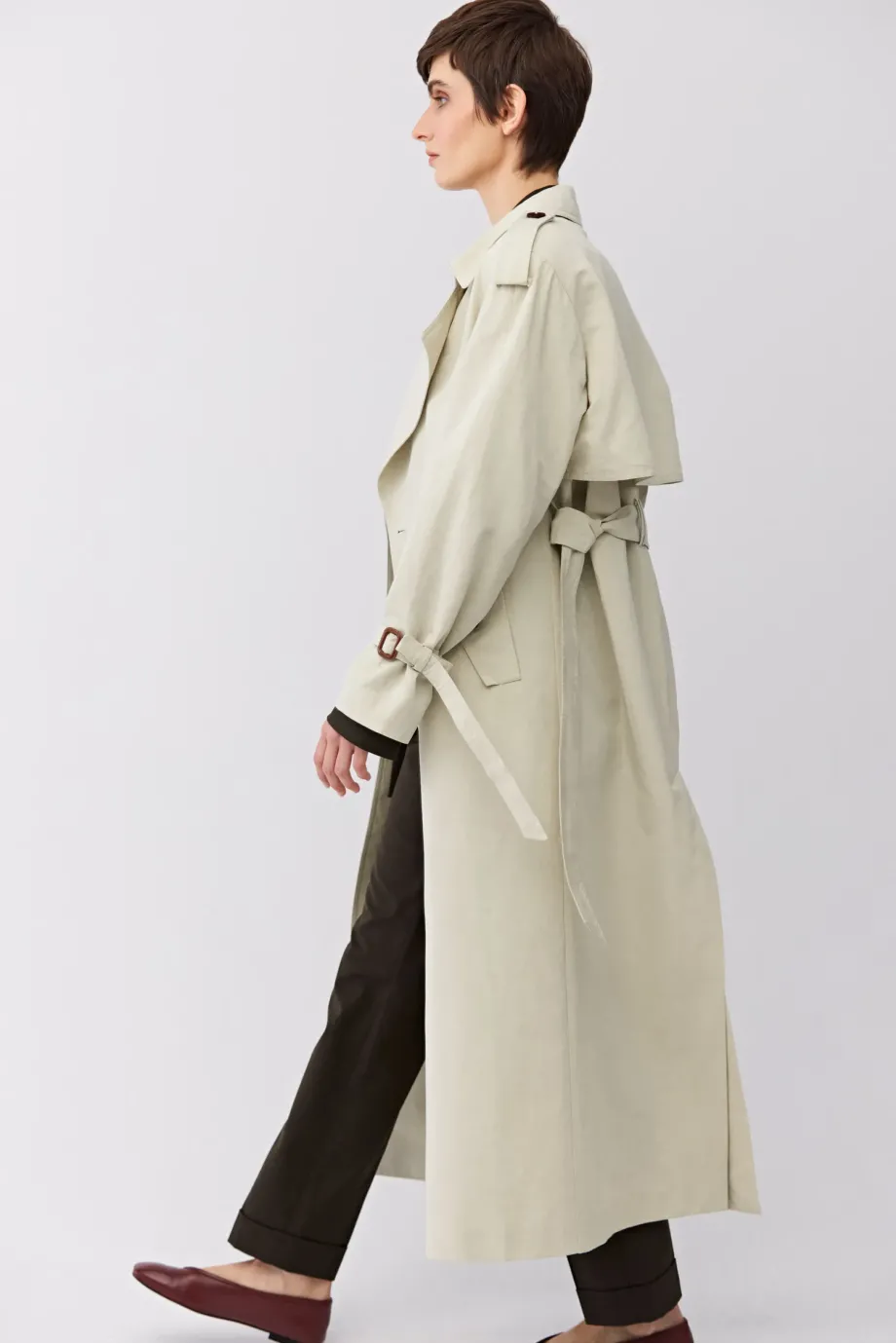 Długi trencz z paskiem. Reglanowe rękawy. Uszyty z mieszanki bawełny i lnu. Pasek w talii. Kołnierz, pagony na rękawach. Guziki z naturalne. Kieszenie.