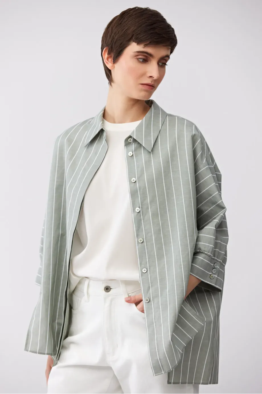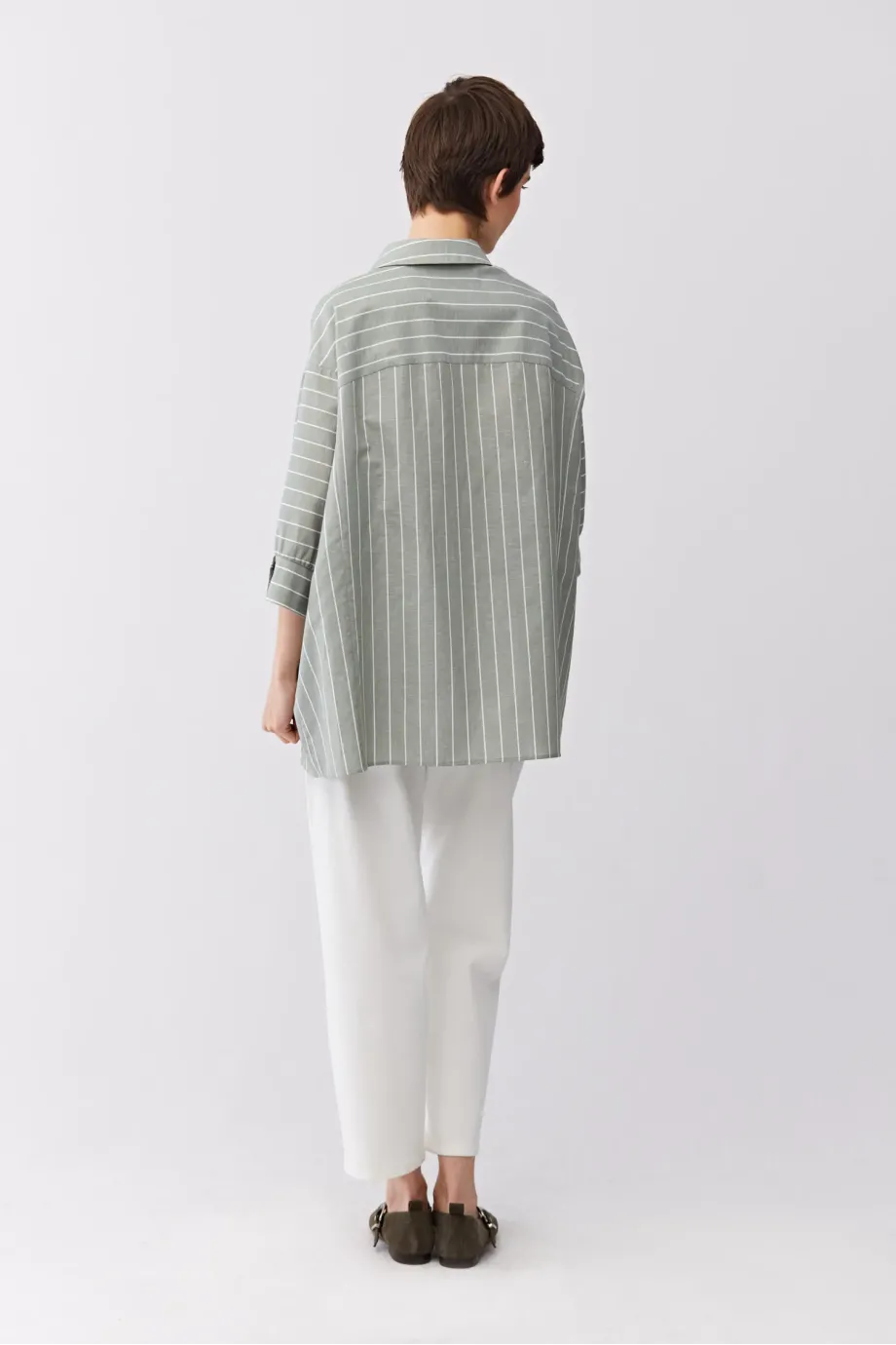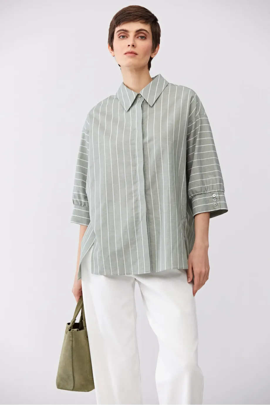 Luźna koszula z mieszanki bawełny i lnu. Prosta forma. Zapięcie na guziki. Kołnierz. Rękaw o długości 3/4. Kolor jasna zieleń