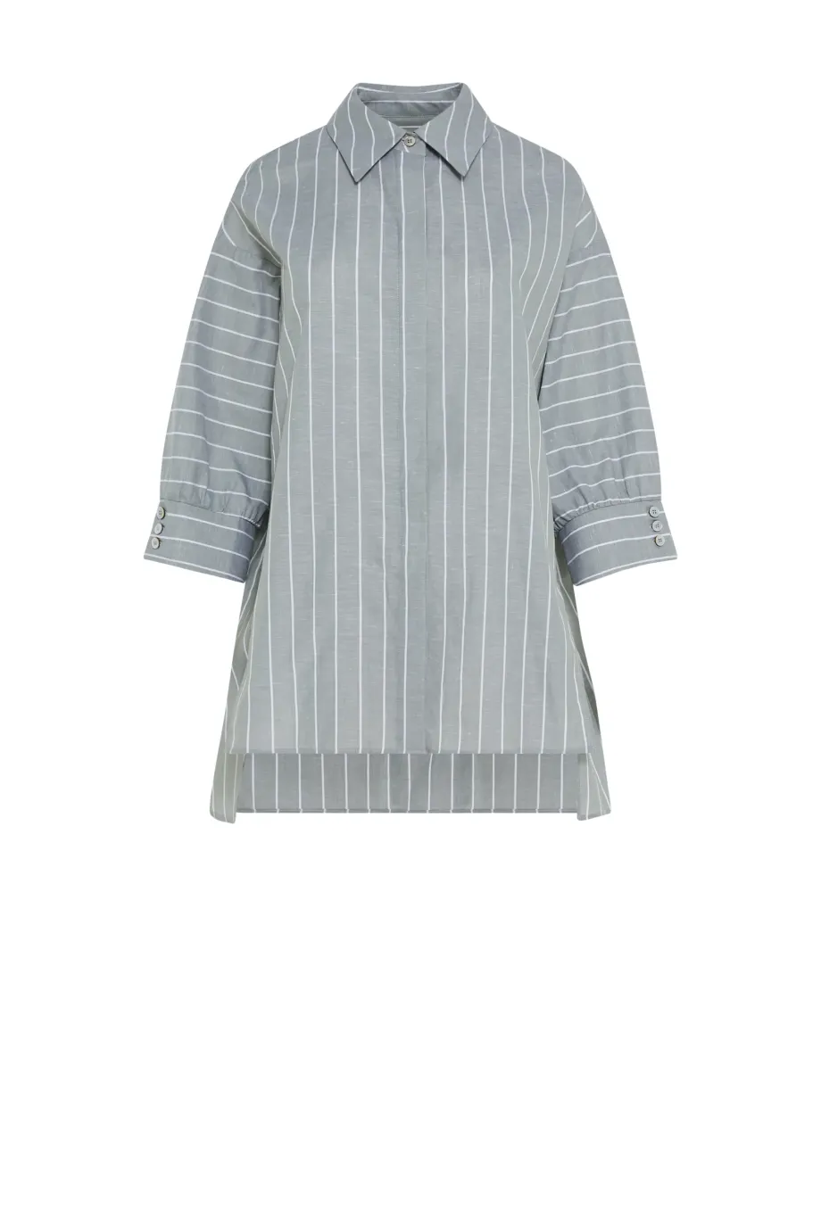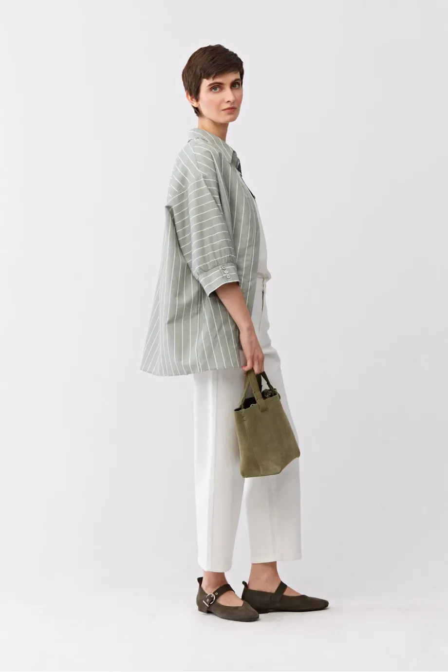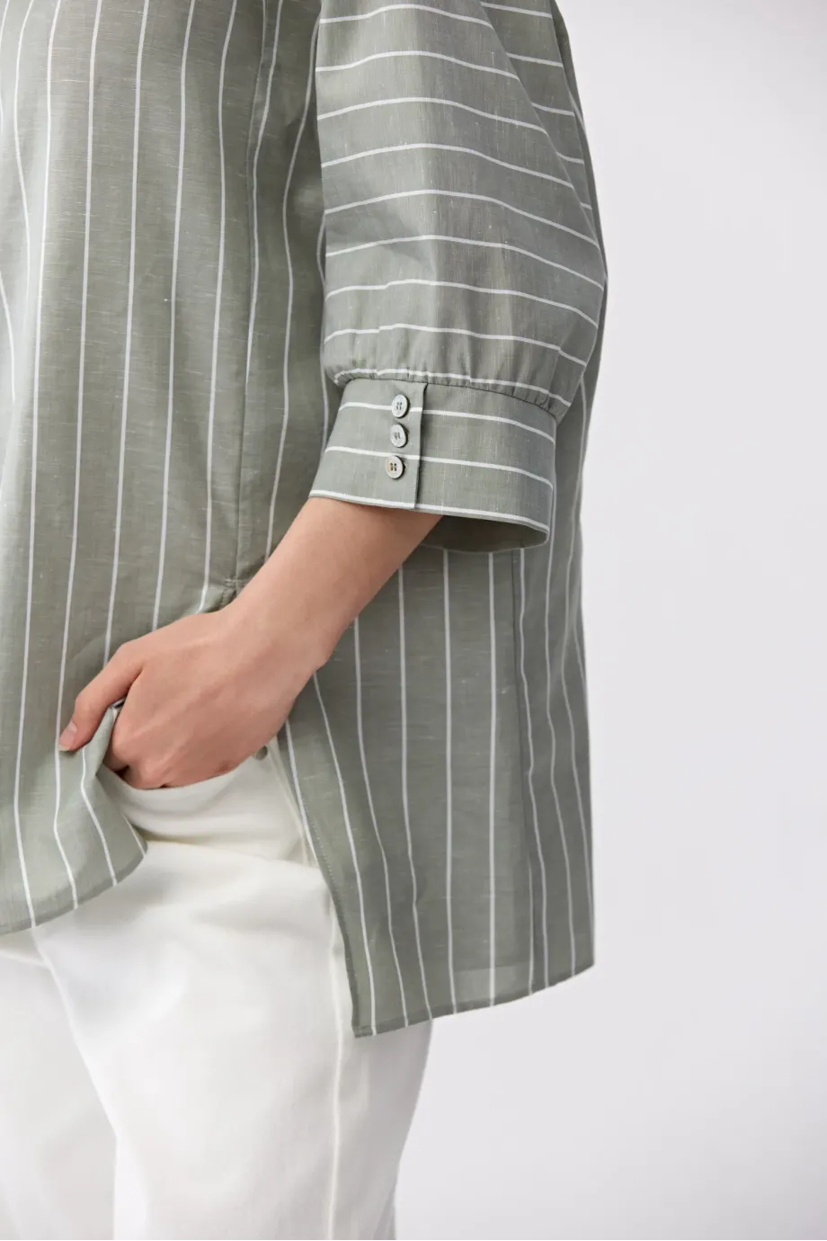 Luźna koszula z mieszanki bawełny i lnu. Prosta forma. Zapięcie na guziki. Kołnierz. Rękaw o długości 3/4. Kolor jasna zieleń