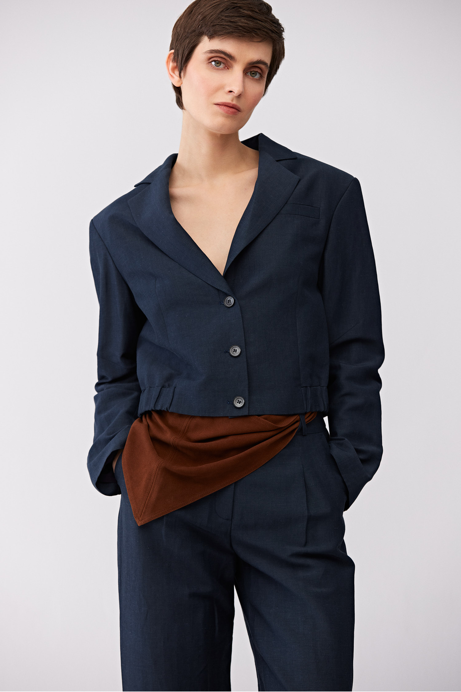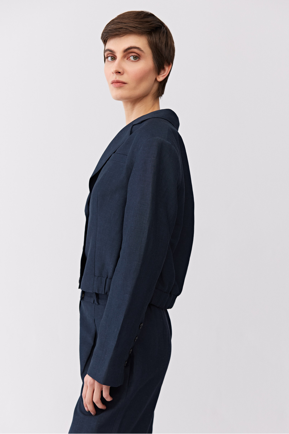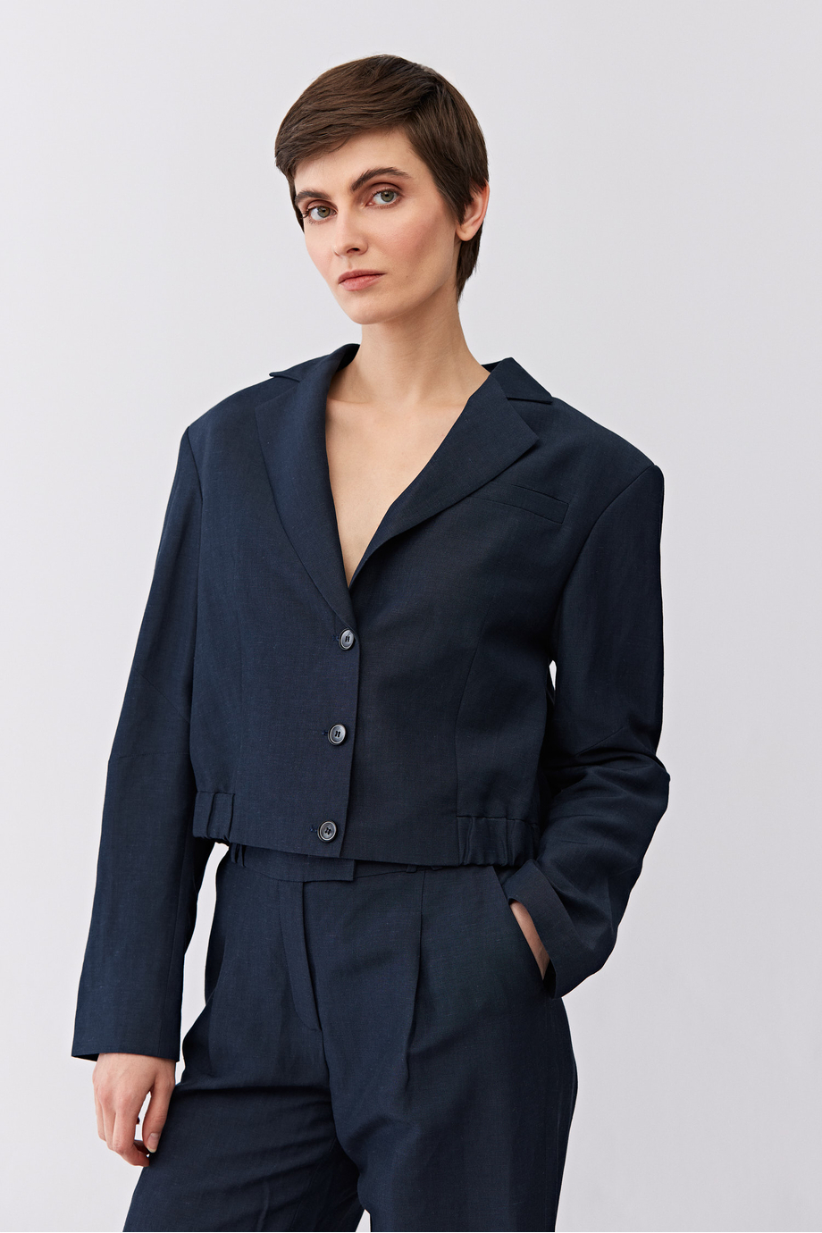 Żakiet jednorzędowy uszyty z wełny dziewiczej i lnu. Fason pudełkowy, długi rękaw, zapięcie na guziki. Kieszenie. Model na podszewce, z ozdobnym stebnowaniem i pipingiem od środka. Kolor granatowy. Do uzupełninia zestawu spodnie z tej samej tkaniny.