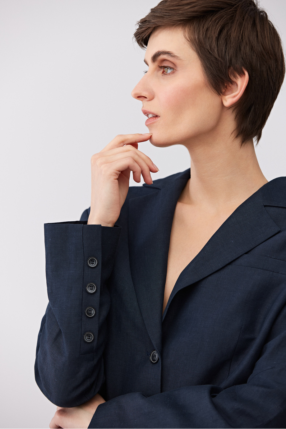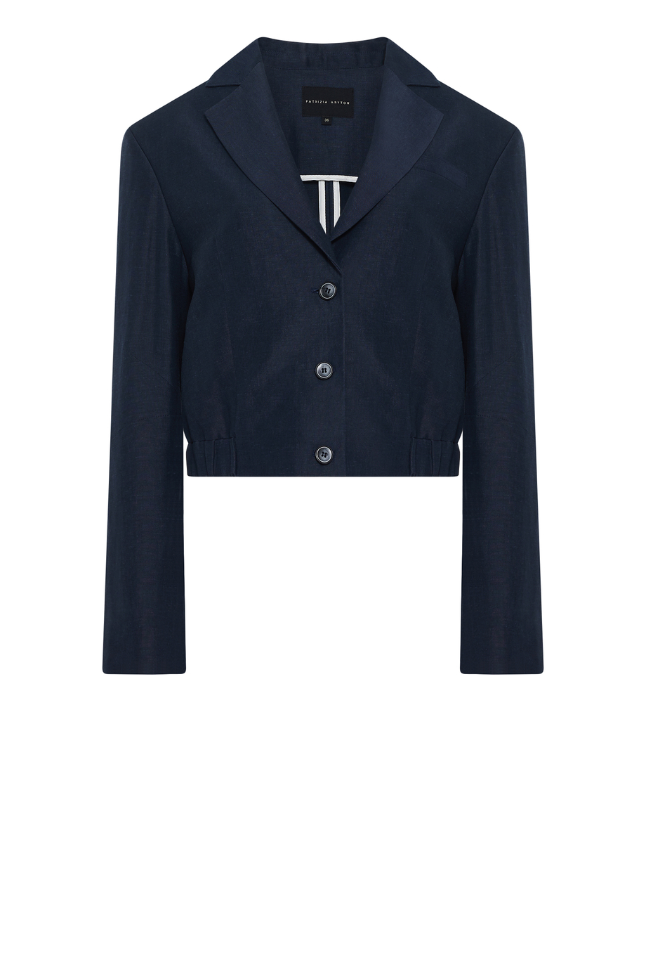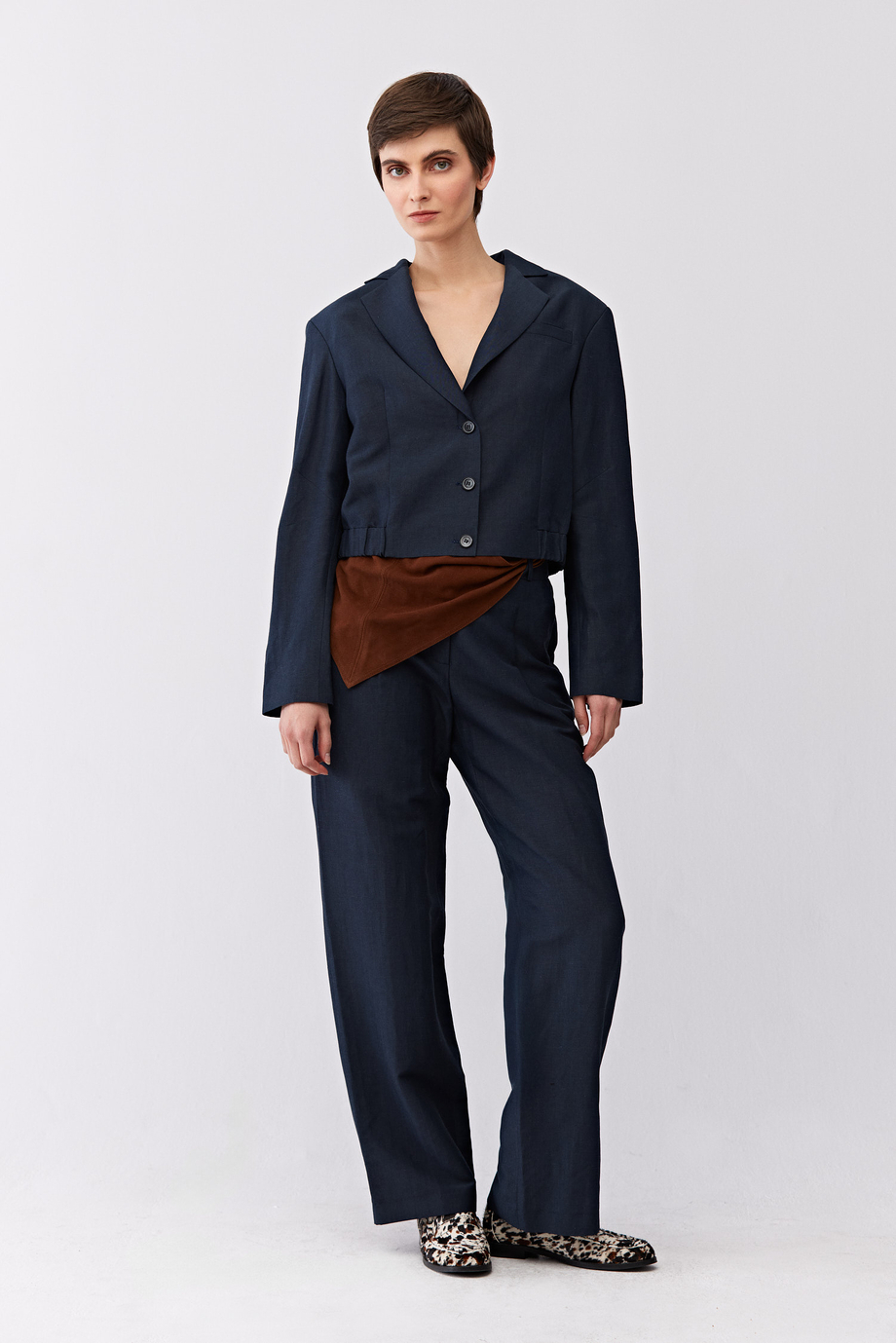 Żakiet jednorzędowy uszyty z wełny dziewiczej i lnu. Fason pudełkowy, długi rękaw, zapięcie na guziki. Kieszenie. Model na podszewce, z ozdobnym stebnowaniem i pipingiem od środka. Kolor granatowy. Do uzupełninia zestawu spodnie z tej samej tkaniny.