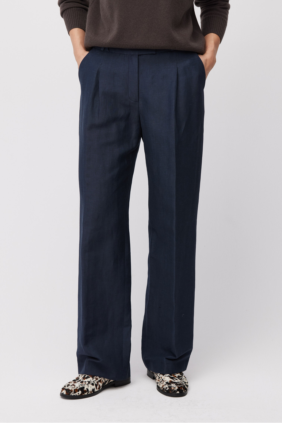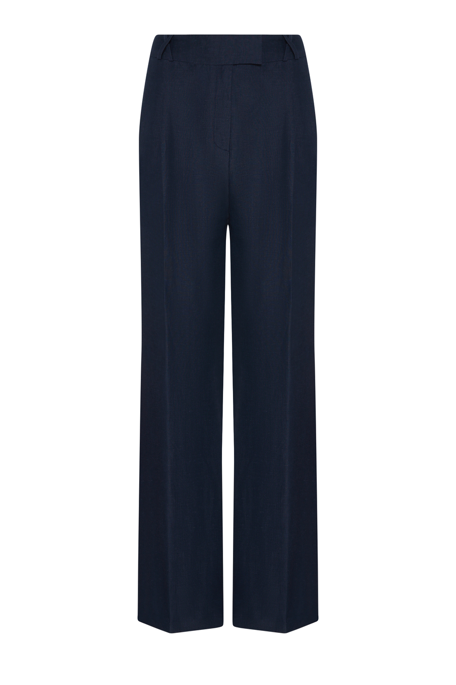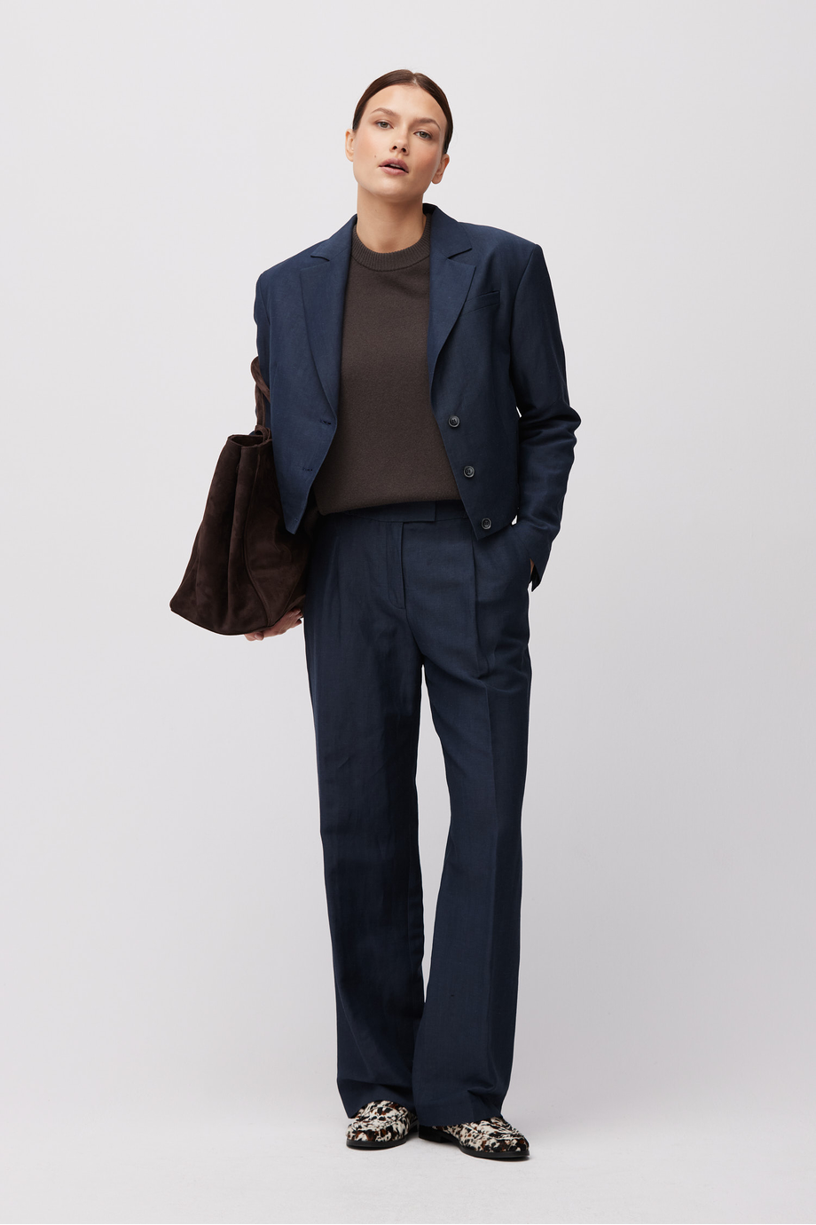 Spodnie z wysokim stanem uszyte z mieszanki wełny i lnu. Szeroka nogawka, zakładki, zapięcie na suwak, haczyk i guzik corozo od środka. Wnętrze z ozdobną lamówką. Kieszenie i szlufki. Kolor granatowy. Do uzupełninia zestawu żakiet z tej samej tkaniny.