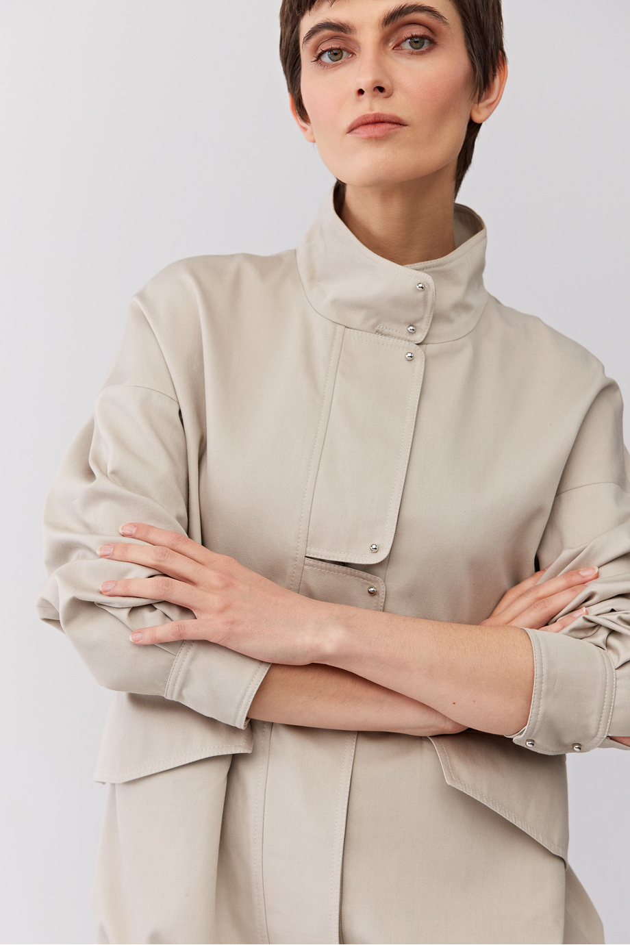 Bawełniana beżowa kurtka ze stójką to projekt, w którym łączymy funkcjonalność z wyraźnym, modowym komunikatem. Wpisuje się on w silny trend future minimalizm, czyli nurt oparty na uproszczonych formach, stonowanej palecie i nowoczesnej konstrukcji. To właśnie tutaj klasyka spotyka się z architektoniczną linią, a komfort z dopracowanym detalem. Nasza bawełniana kurtka damska została zaprojektowana tak, by stała się kluczowym elementem kapsułowej garderoby - neutralny beż doskonale współgra z odcieniami szarości, pastelami i monochromatycznymi zestawami, dominującymi w aktualnych kolekcjach. To model, który buduje styl bez nadmiaru, ale z wyraźną świadomością trendów.