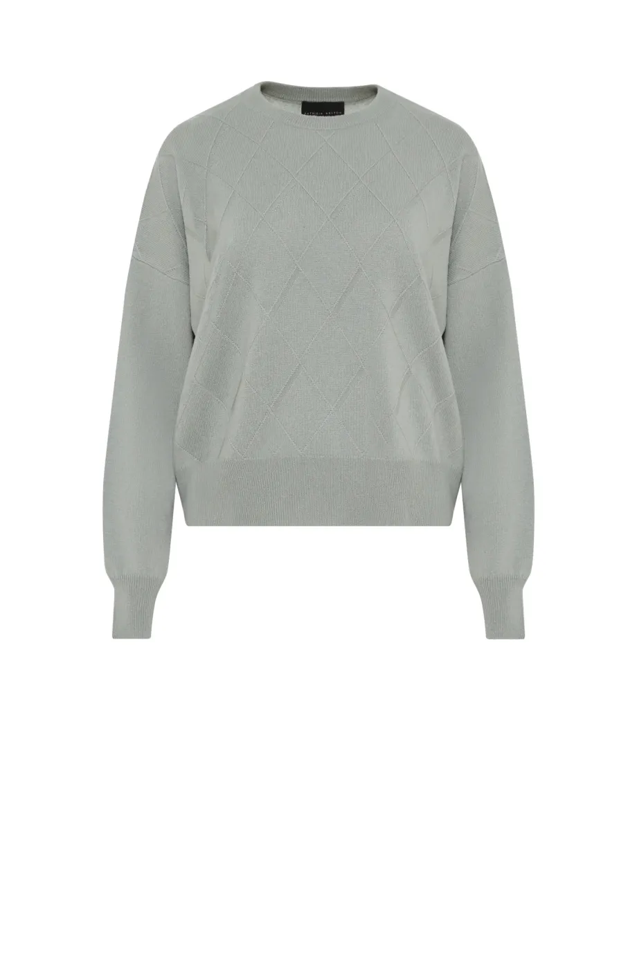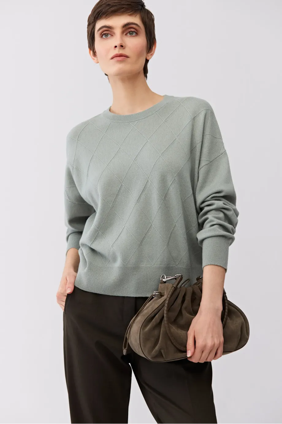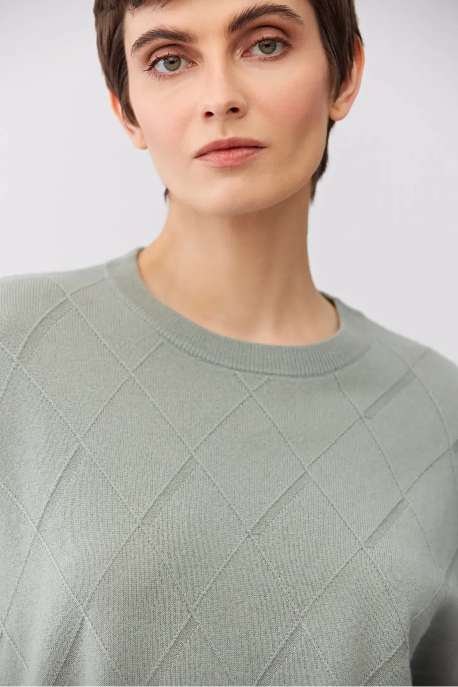 Bluzka z wełny merynosowej i kaszmiru. Krótka forma. Długi rękaw. Miękka dzianina o splocie single jersey, wykonana na maszynie o splocie 12 GG. Kolor jasna zieleń.