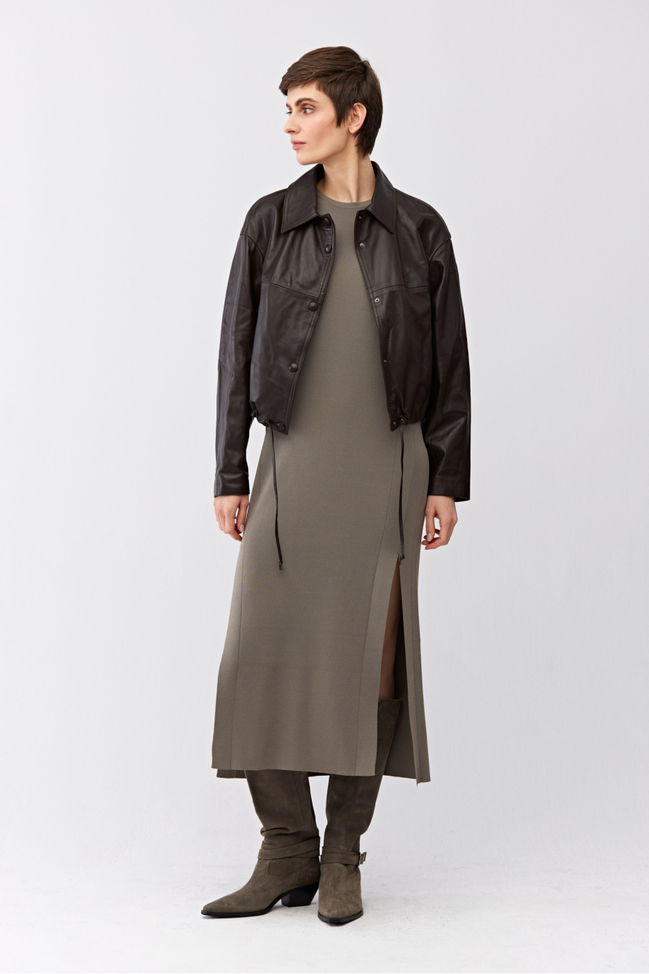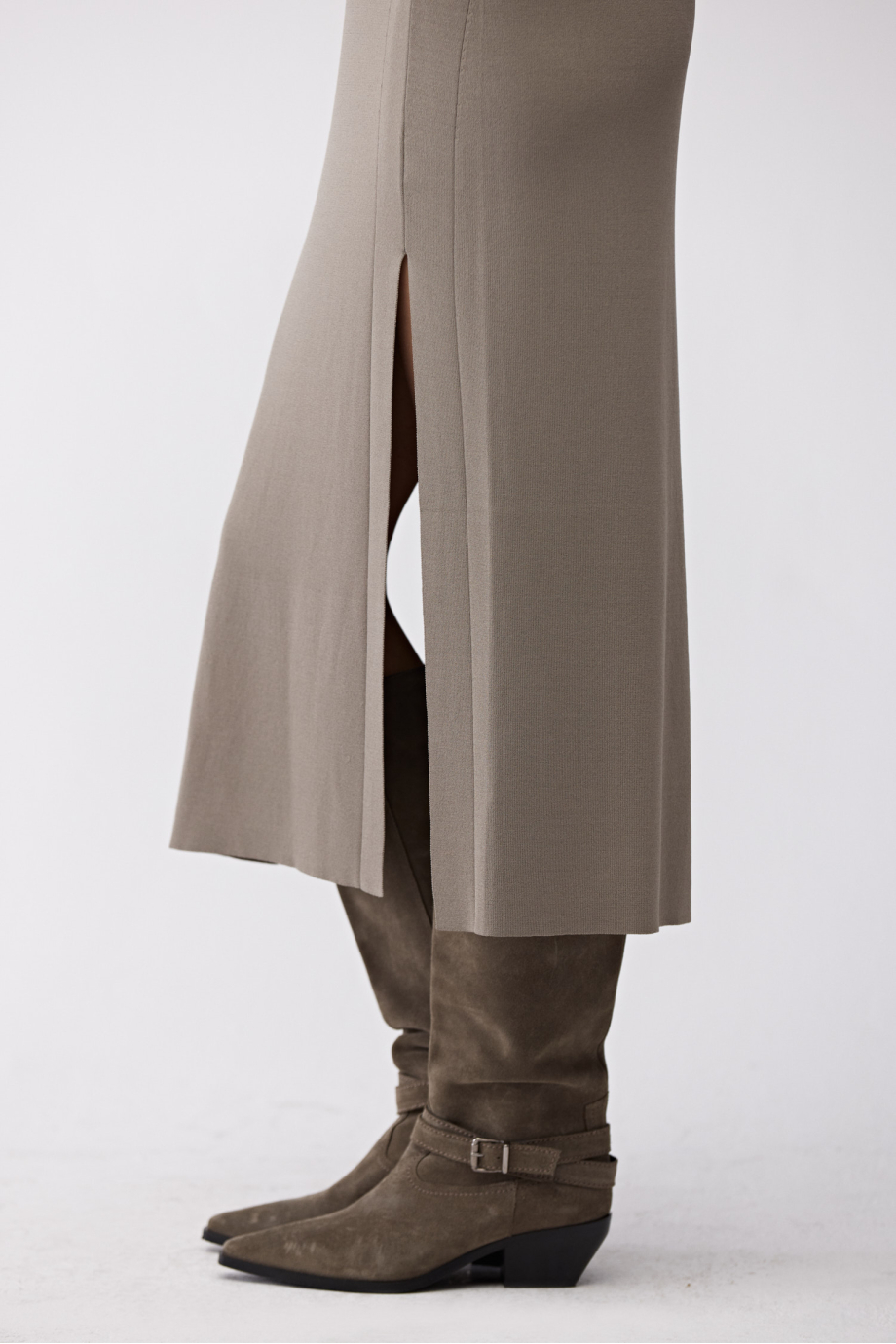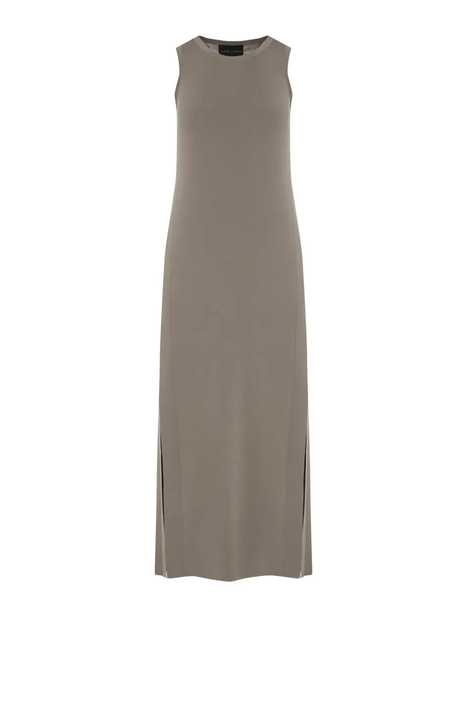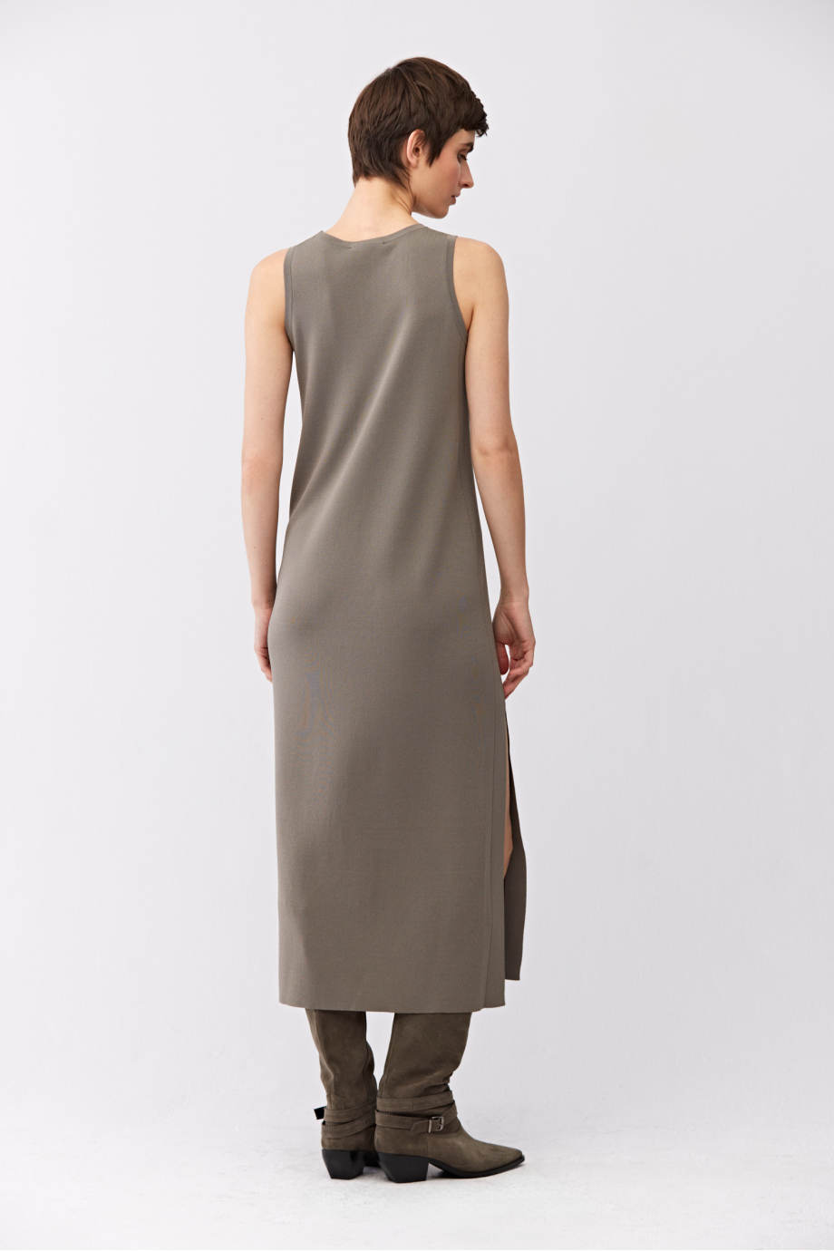 Zielona sukienka midi bez rękawów. Miękka, opływowa dzianina, wykonana splotem rib 1x1, na maszynie o uigleniu 14 GG. Po bokach rozcięcia.