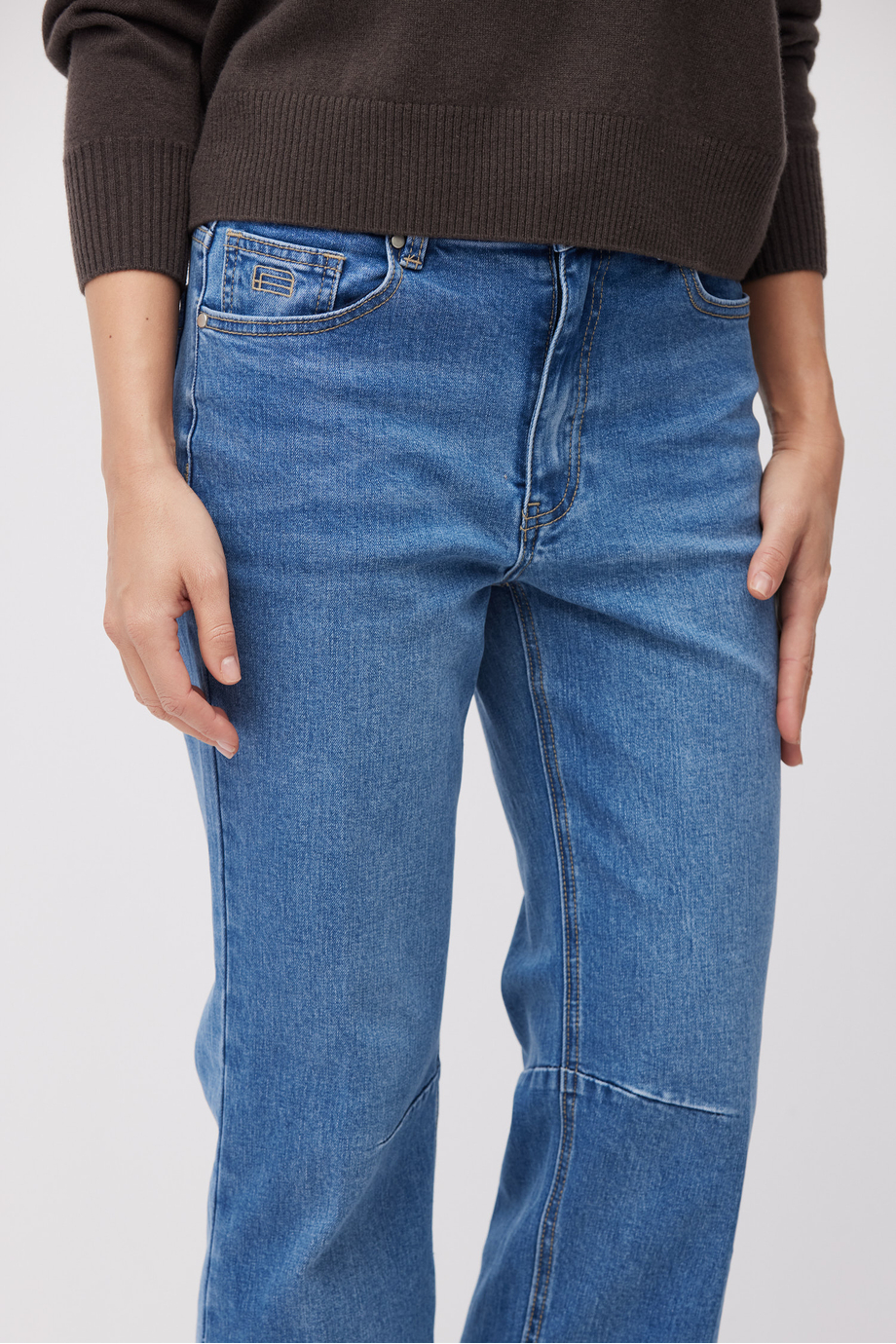 Jeansy o fasonie flare. Dopasowana góra, nogawki rozszerzane poniżej kolan. Wysoki stan. Zapięcie na suwak i metalowy guzik. Wykonane z bawełny i elastanu - miękkie i komfortowe w noszeniu. Długość do kostki.
