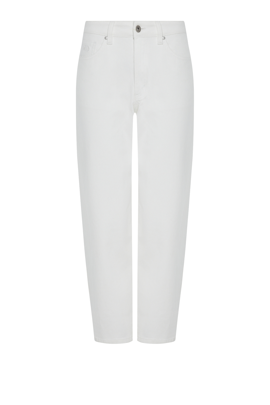 Jeansy o fasonie barrel. Klasyczny pięciokieszeniowy krój. Wysoki stan. Zapięcie na suwak i metalowy guzik. Wykonane z bawełny z dodatkiem elastanu– miękkie i komfortowe w noszeniu. Kolor biały.