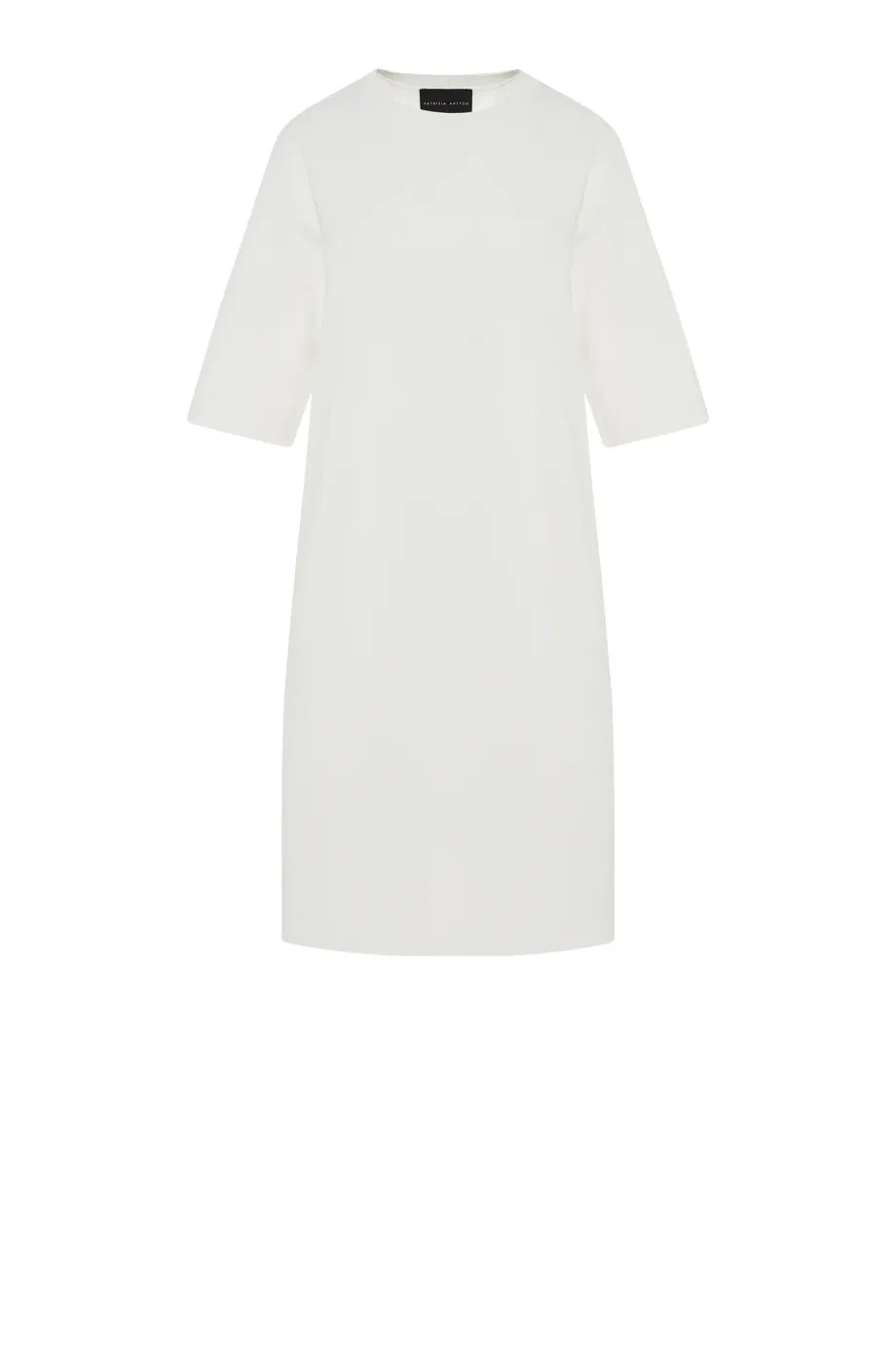 Biała sukienka z krótkim rękawem. Prosta, luźna forma. Miękka dzianina, opływowa - o drobnym, gęstym splocie wykonanym na maszynie o uigleniu 16 GG. Do uzupełninia zestawu spodnie z tej samej dzianiny.