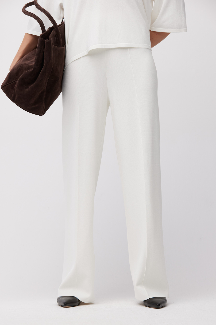 Białe spodnie z szeroką nogawką. Miękka dzianina o drobnym splocie wykonana na maszynie o uigleniu 16 GG. Do uzupełnienia zestawu bluza z tej samej dzianiny.