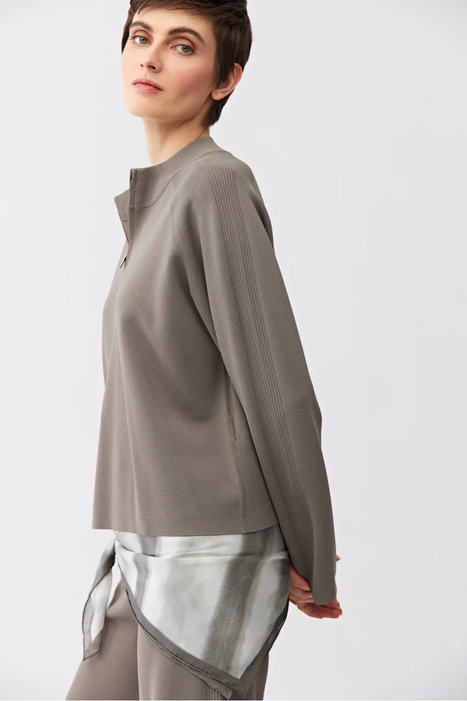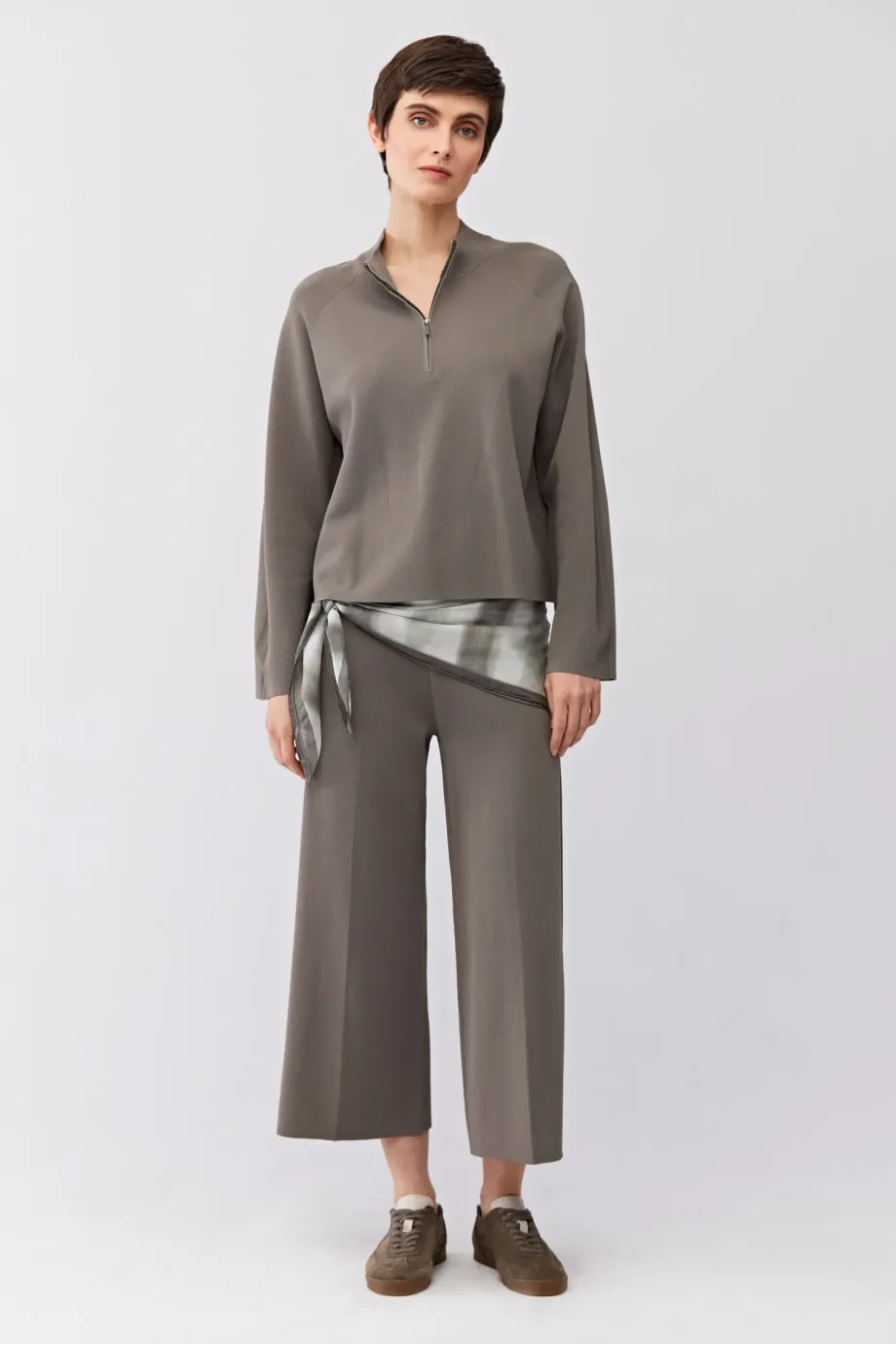 Bluza z dzianiny o drobnym splocie, wykonana na maszynie o uigleniu 16 GG. Prosta, luźna forma. Długi rękaw. Zapięcie pod szyją. Do uzupełninia zestawu spodnie z tej samej dzianiny. Kolor zielony.