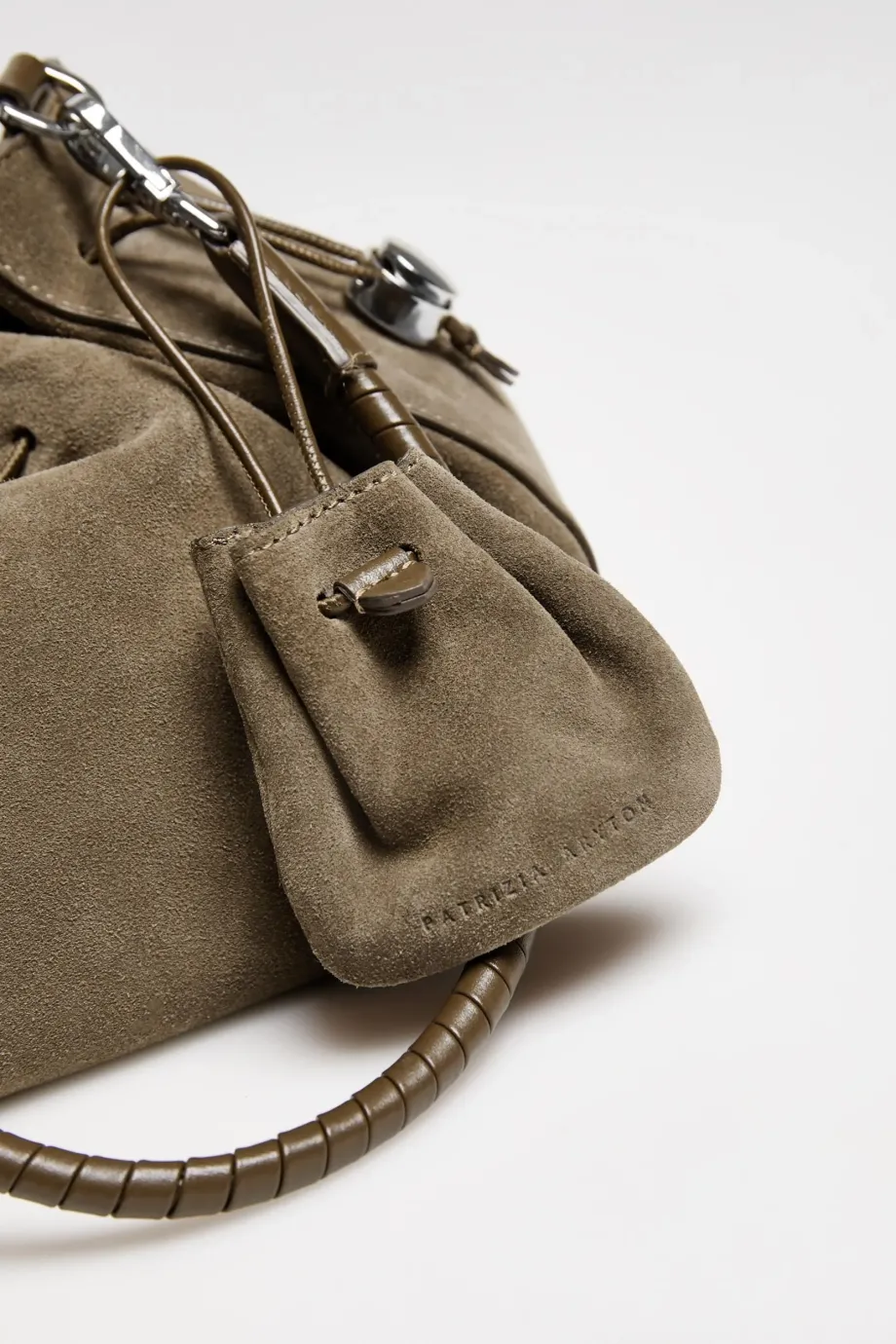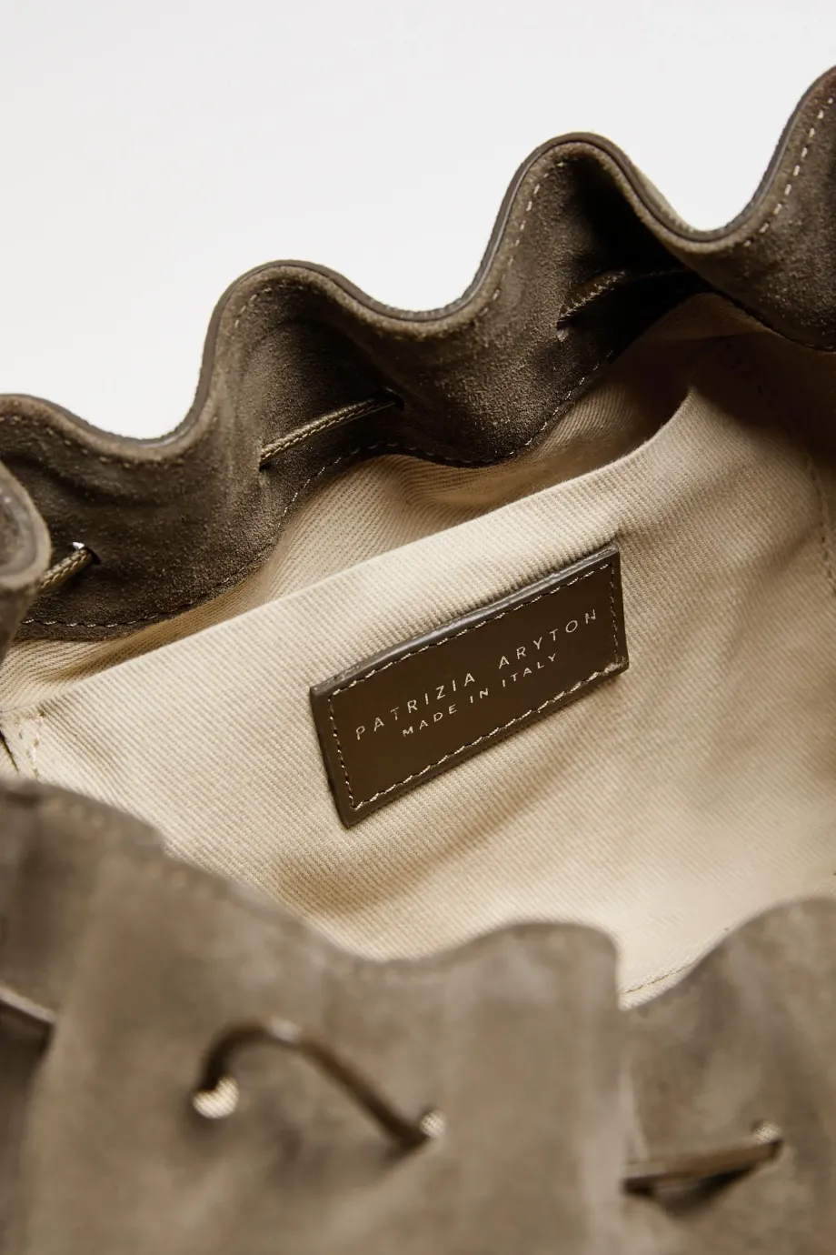 Zielona torebka na ramię wykonana z naturalnej skóry zamszowej. Model o półokrągłej formie, z zapięciem w formie marszczenia. Torebka ręcznie uszyta we włoskiej manufakturze, z dbałością o detale i jakość wykończenia. Wnętrze wyposażone w kieszonkę na suwak oraz odpinaną zamszową saszetkę.