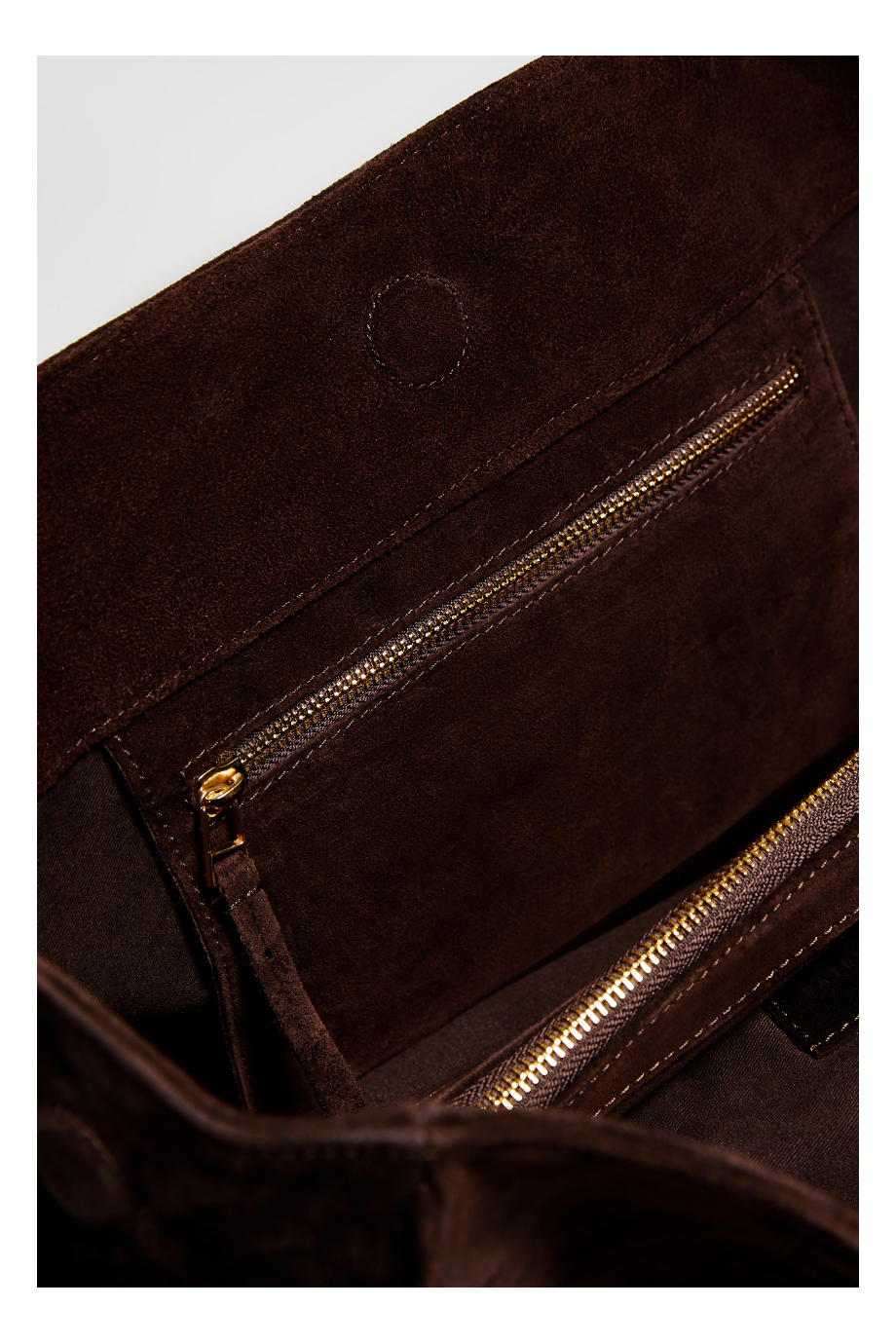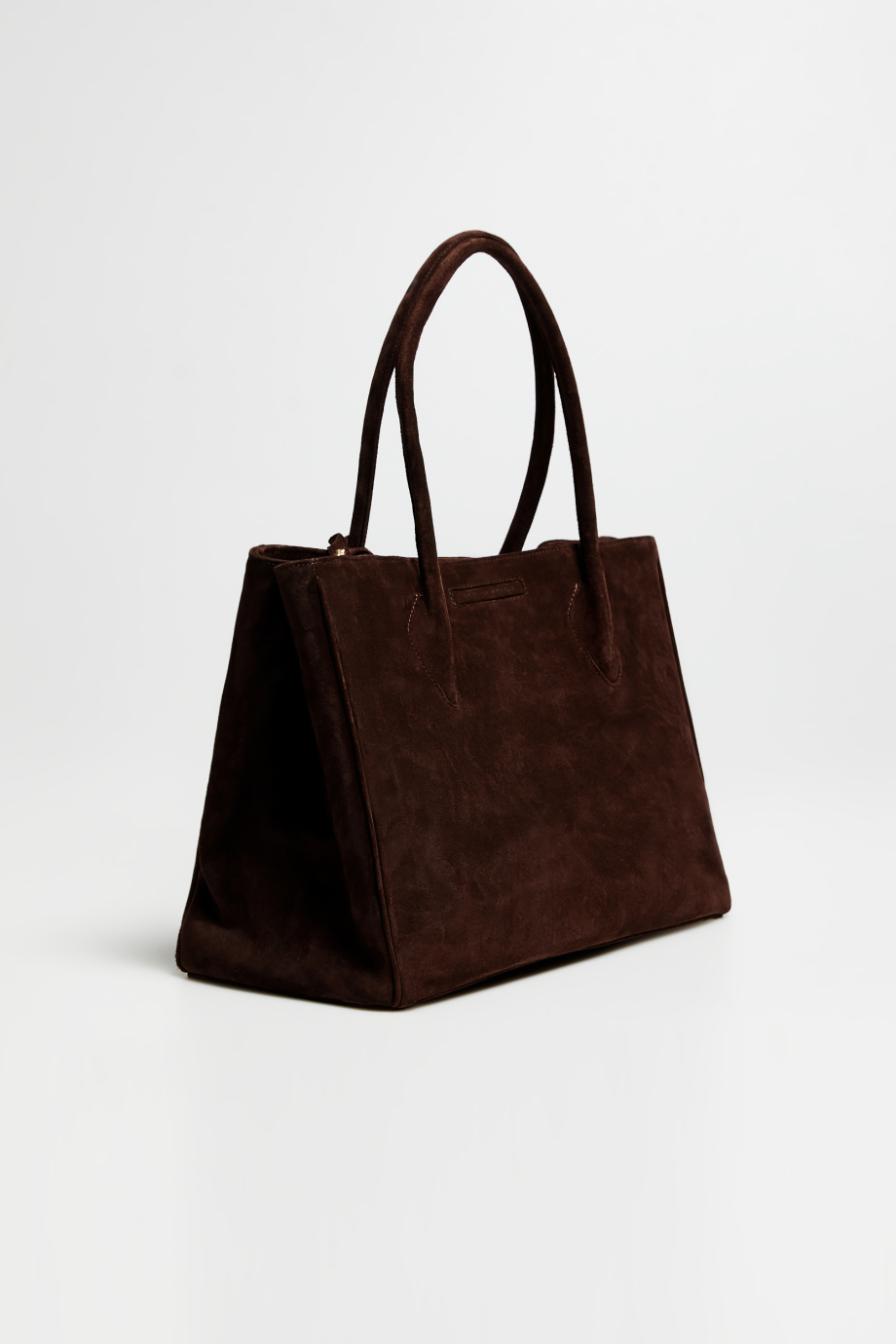 Torba typu shopper wykonana z naturalnej, brązowej skóry zamszowej. Ręcznie uszyta w polskiej manufakturze. Wnętrze wyposażone w odpinaną saszetkę na suwak. Solidne rączki.