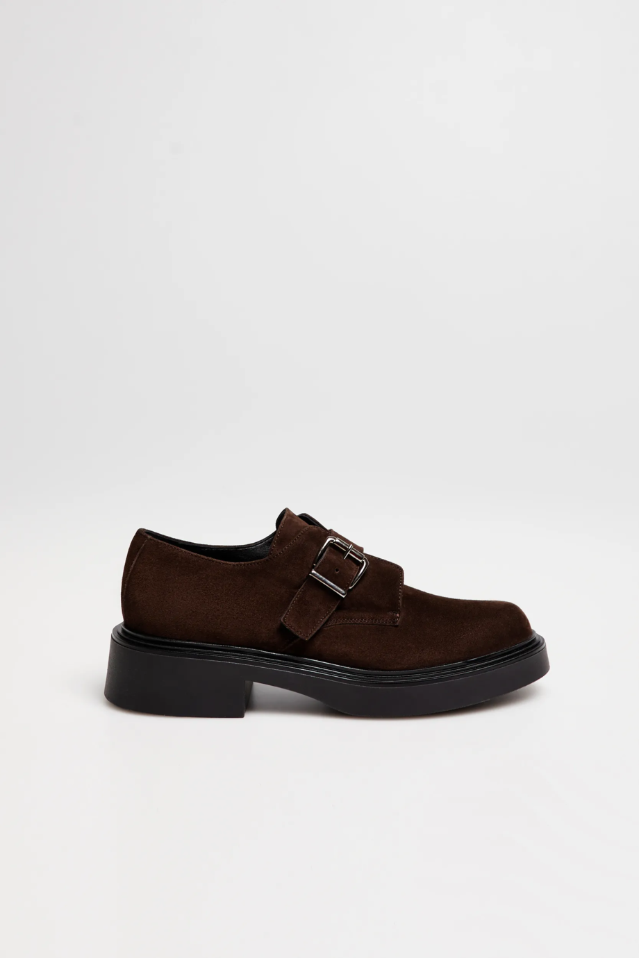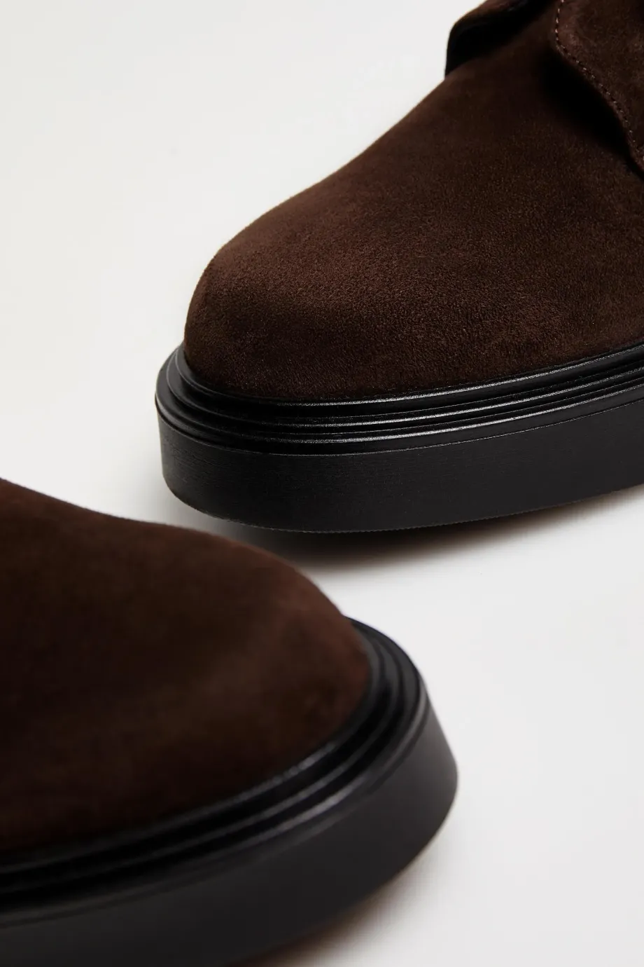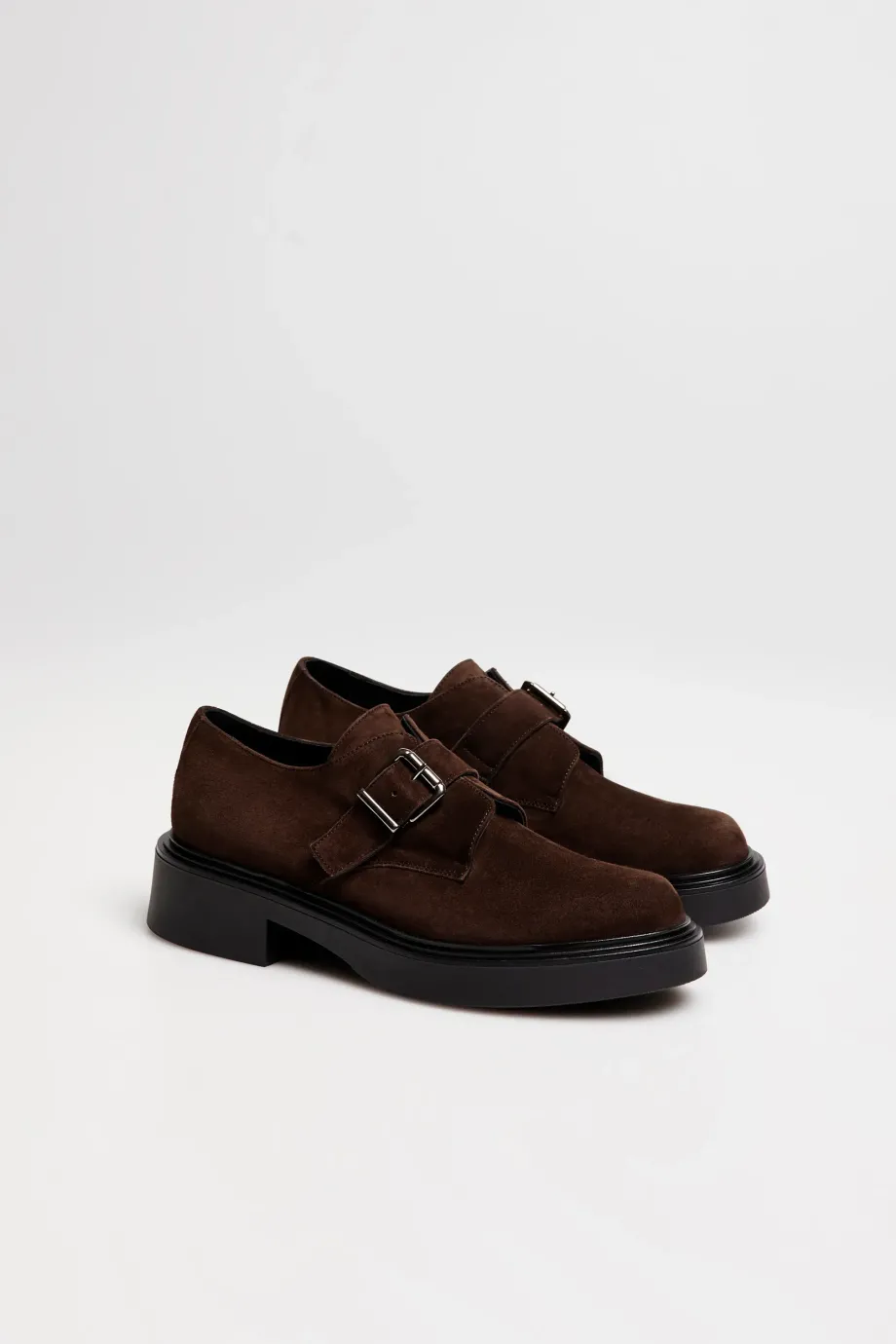Brązowe monk shoes z miękkiej zamszowej skóry koziej i owczej, ręcznie szyte we Włoszech. Klasyczny fason z klamrą i okrągłym noskiem na masywnej podeszwie.
