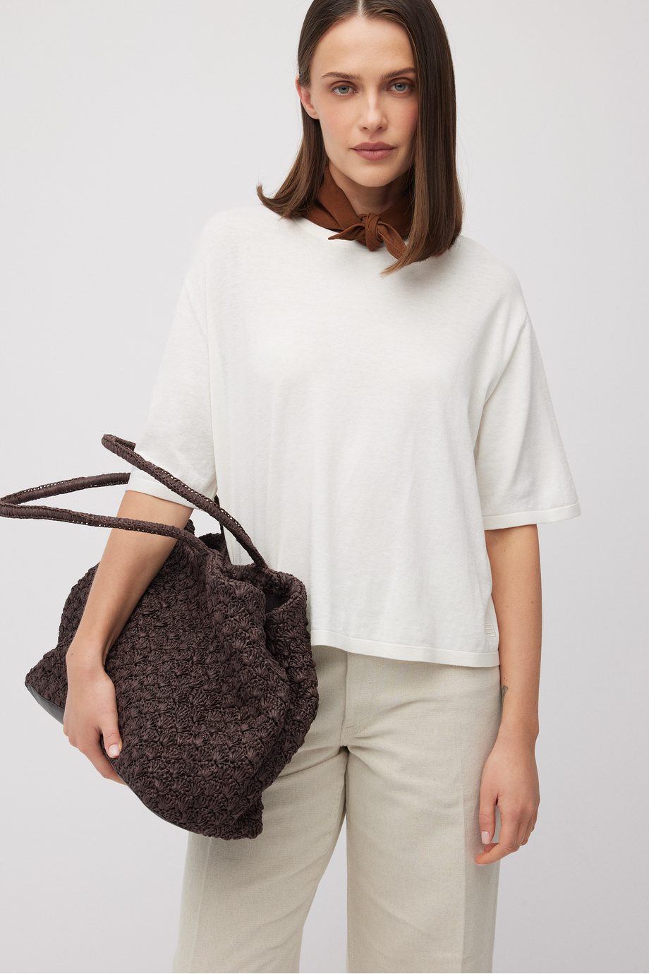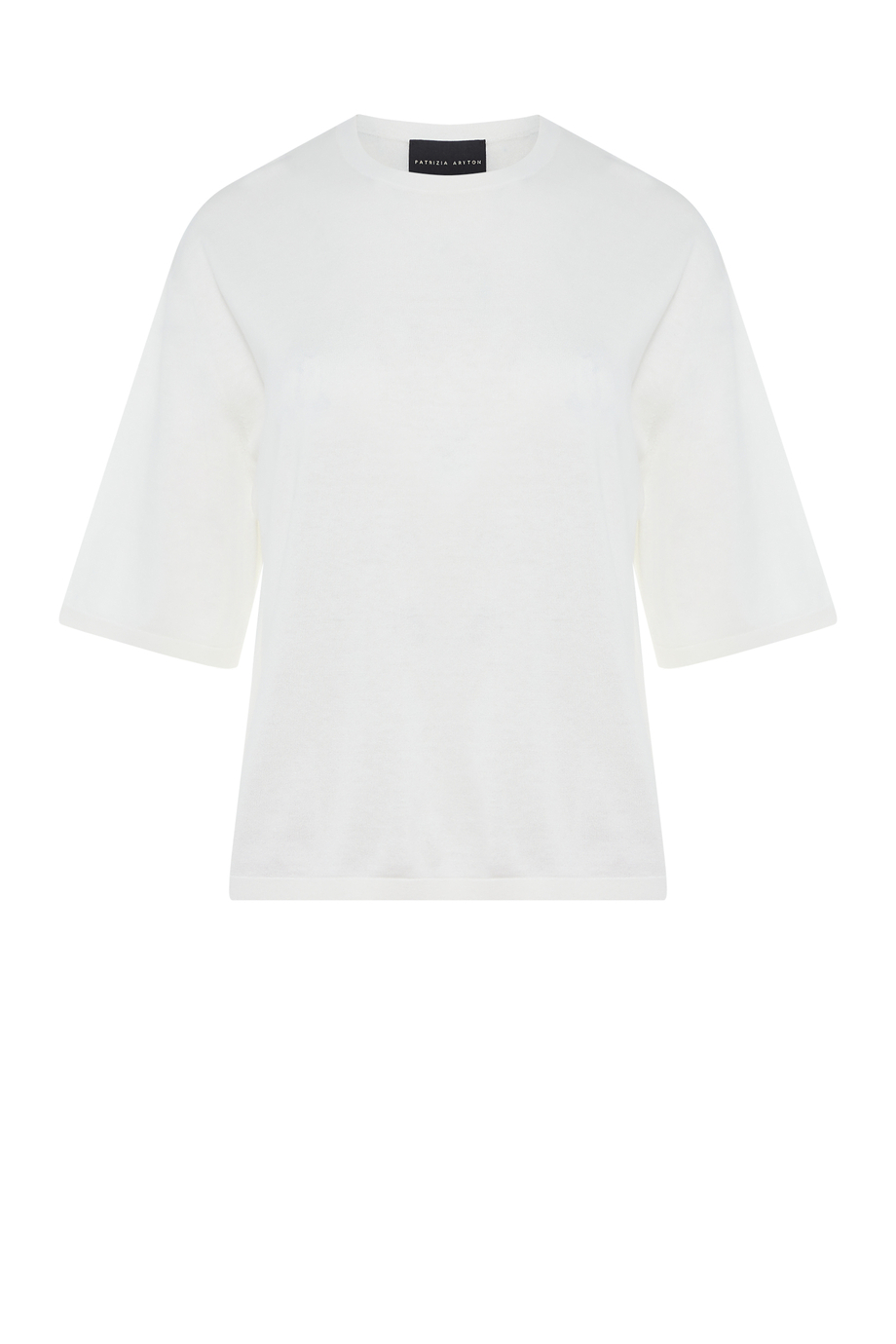 Bluzka z mieszanki bawełny i jedwabiu. Okrągły dekolt, krótki rękaw. Luźna, pudełkowa forma. Miękka dzianina o drobnym splocie single jersey, wykonanym na maszynie o uigleniu 18 GG. Kolor biały.