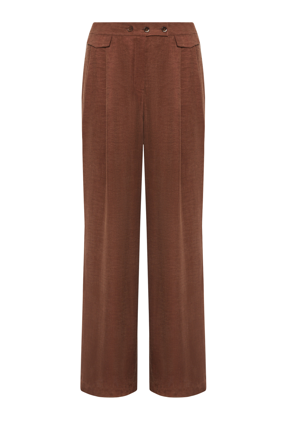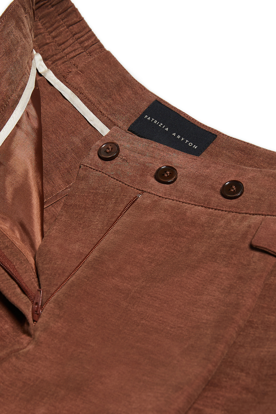 Spodnie z wysokim stanem uszyte z mieszanki lyocellu i lnu. Szeroka nogawka, zakładki, zapięcie na suwak, haczyk i guzik corozo od środka. Wnętrze z ozdobną lamówką. Kieszenie. Kolor brązowy. Do uzupełnienia zestawu płaszcz z tej samej tkaniny.