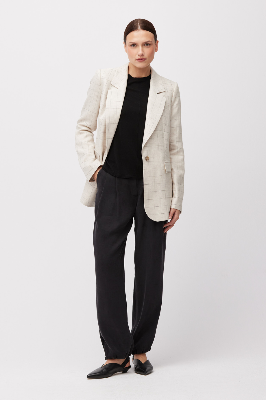Czarne spodnie z mieszanki lyocellu i lnu. Kieszenie, zapięcie na haczyk i guzik z orzecha. Szeroka nogawka z zakładkami, zwężana na dole. Wnętrze z ozdobną lamówką. Kolor czarny.
