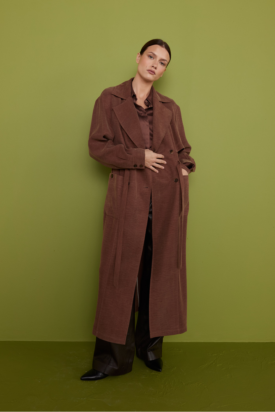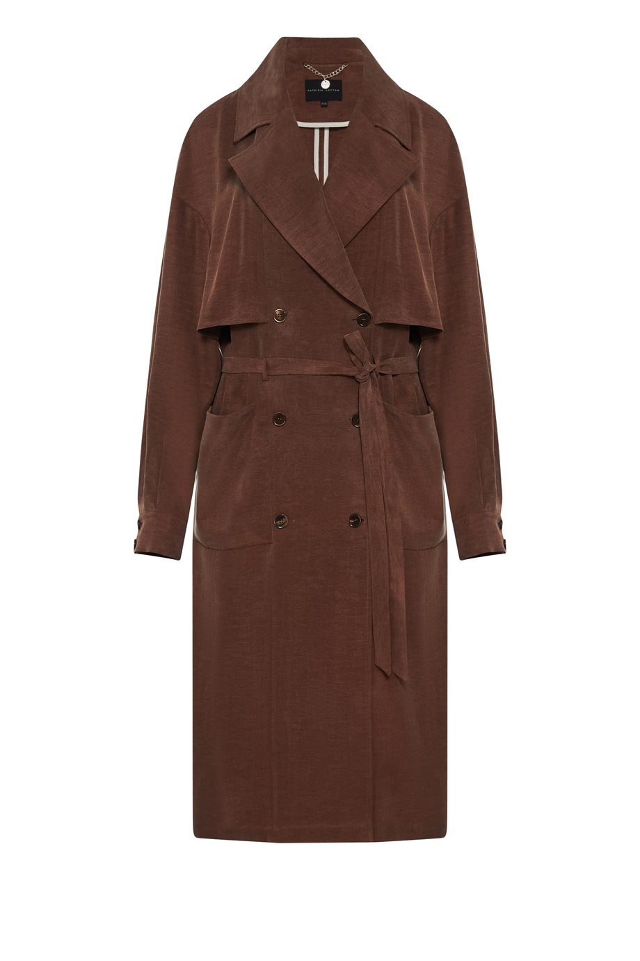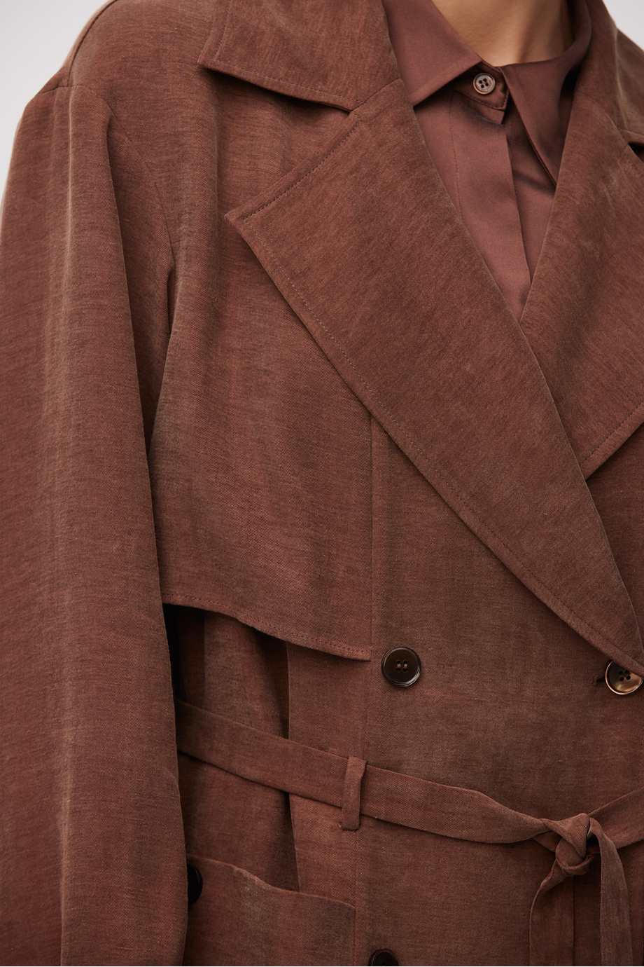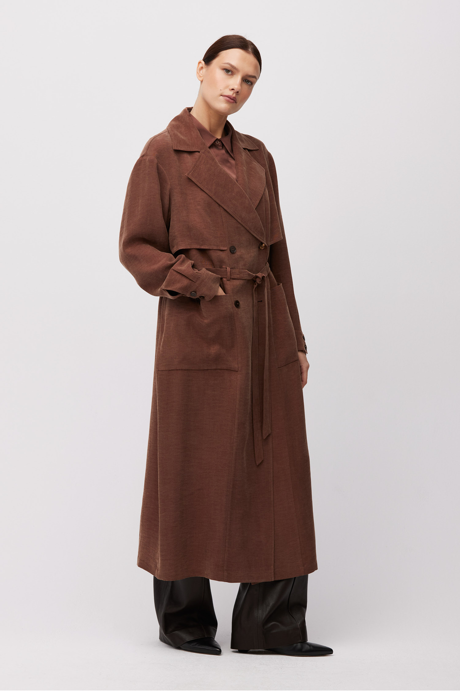 Brązowy płaszcz z lekkiej tkaniny - mieszanki lyocellu i lnu. Długi rękaw, kołnierz, kieszenie. Zapięcie na guzik i pasek. Na półpodszewce, z ozdobnymi wykończeniem. Z tyłu rozcięcie.