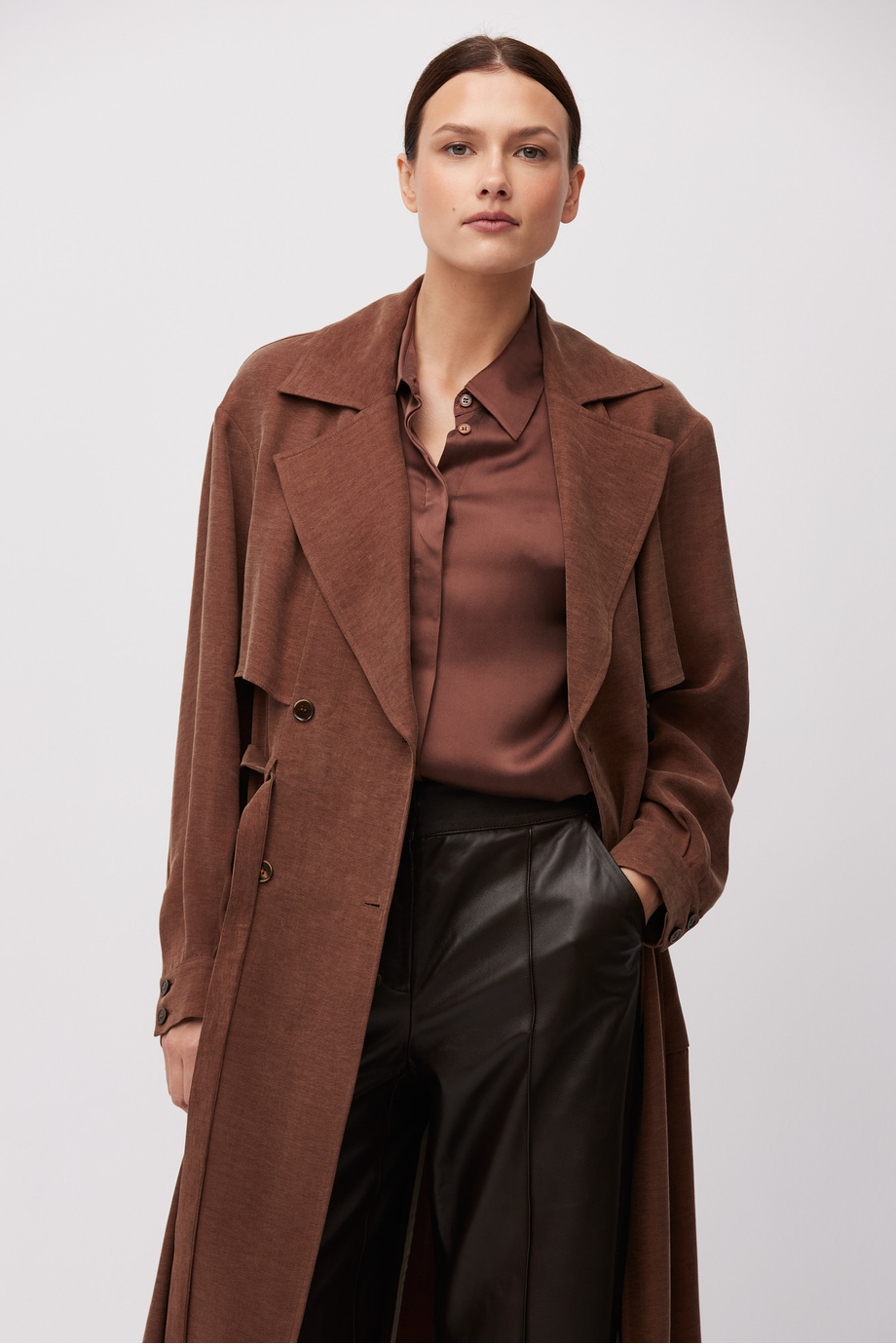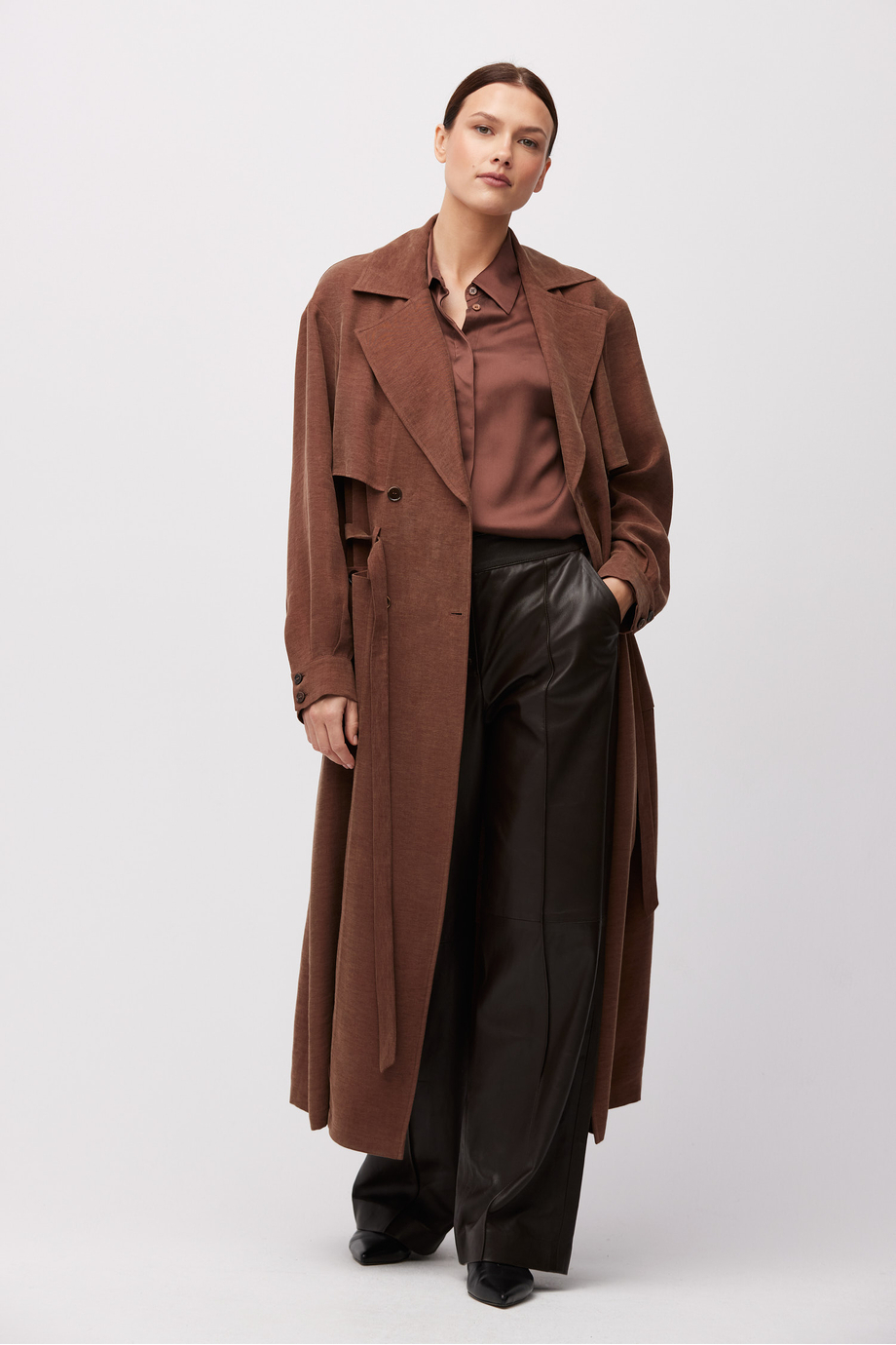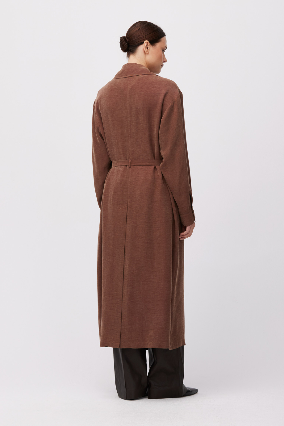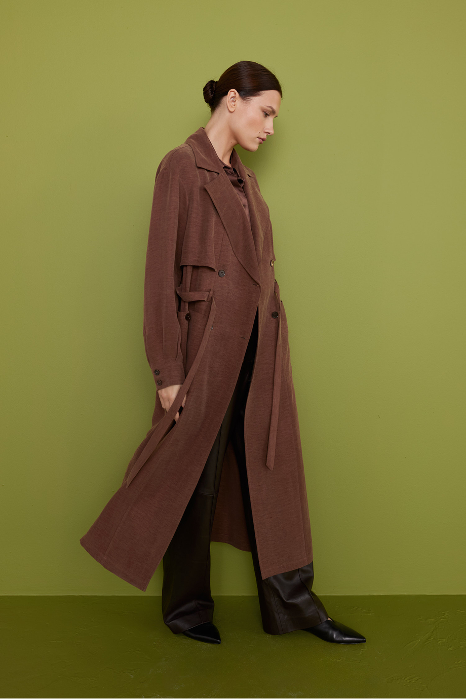 Brązowy płaszcz z lekkiej tkaniny - mieszanki lyocellu i lnu. Długi rękaw, kołnierz, kieszenie. Zapięcie na guzik i pasek. Na półpodszewce, z ozdobnymi wykończeniem. Z tyłu rozcięcie.