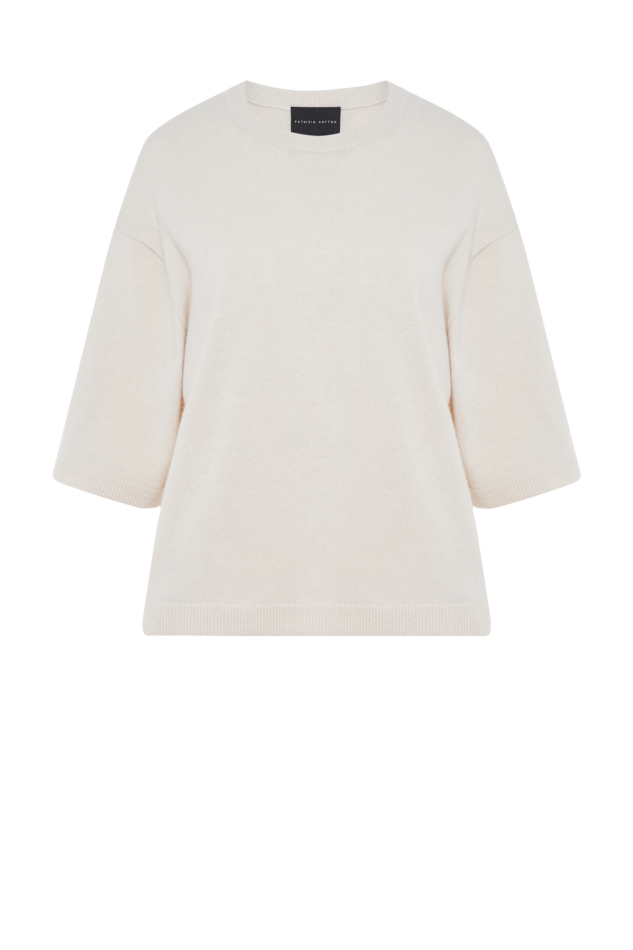 Bluzka z wełny merynosowej. Okrągły dekolt, krótki rękaw. Luźna, pudełkowa forma. Miękka dzianina o drobnym splocie single jersey, wykonanym na maszynie o uigleniu 12 GG. Kolor szary.