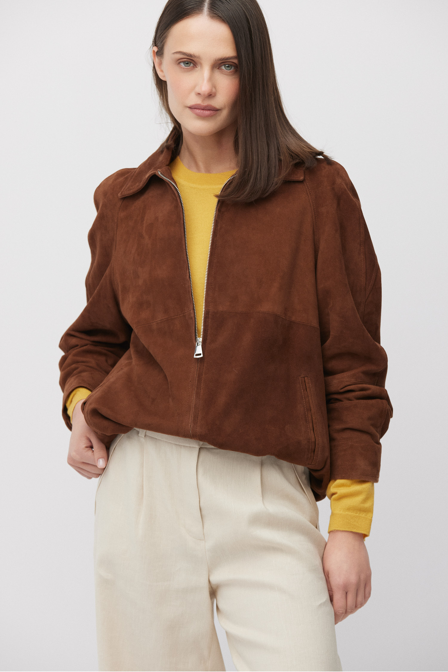 Kurtka z naturalnej, miękkiej skóry koziej. Zapinana na suwak. Podszewka. Kieszenie. Luźna forma. Kolor brązowy.