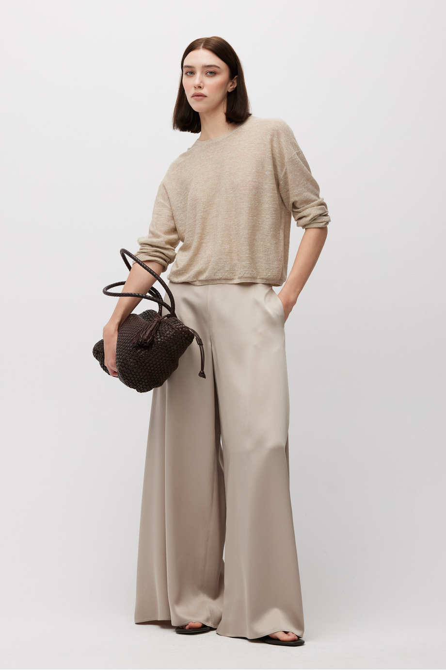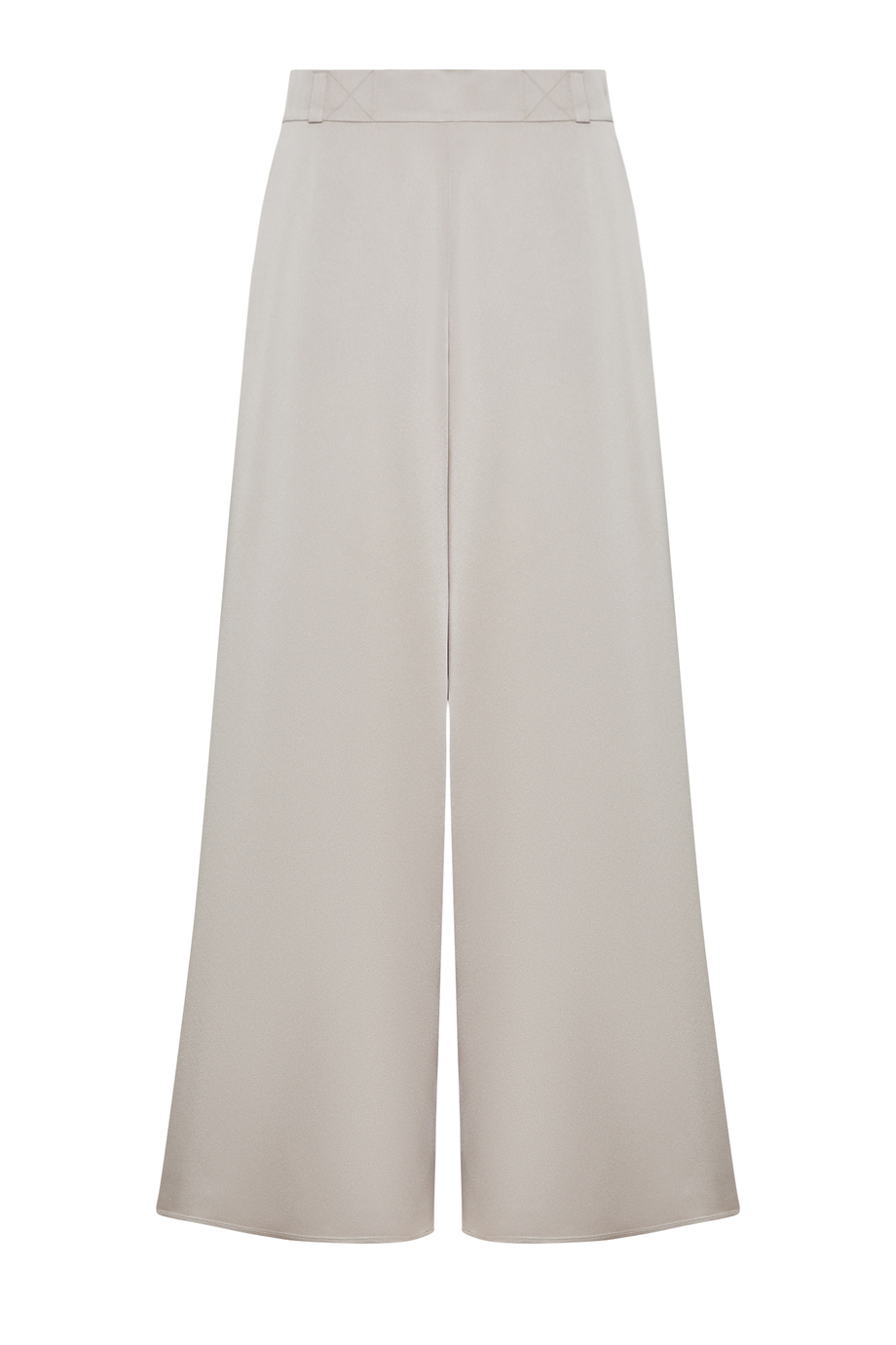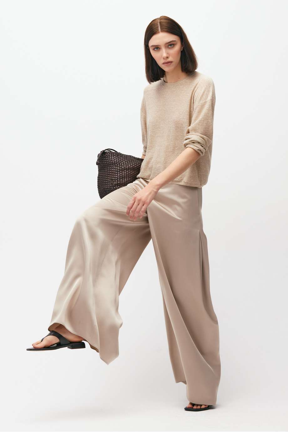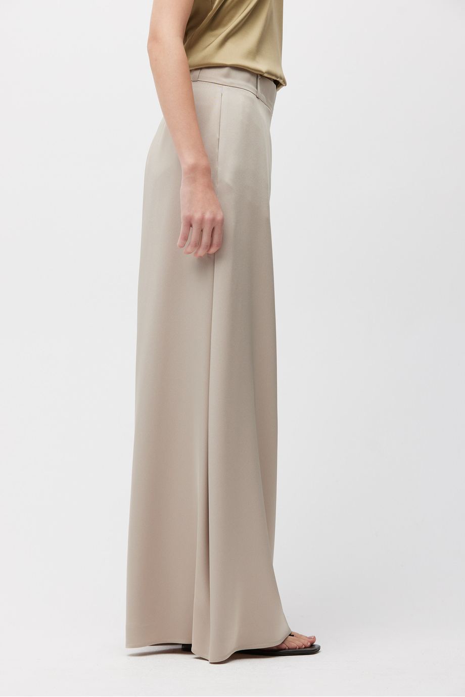 Beżowe spodnie uszyte z opływowej tkaniny-mieszanki acetatu i wiskozy. Zapięcie na suwak z boku. Kieszenie. Szeroka nogawka.
