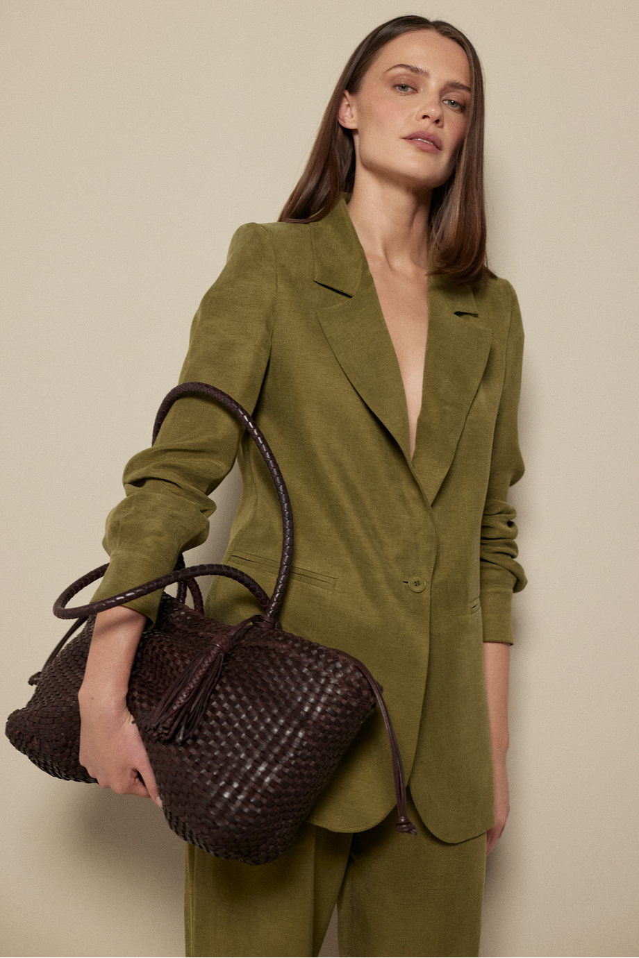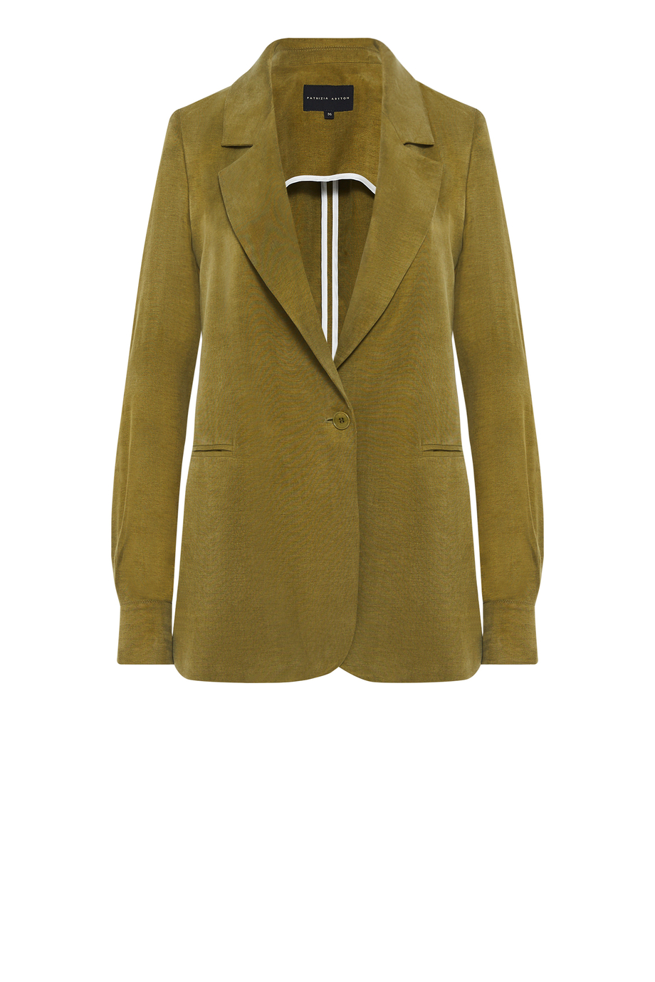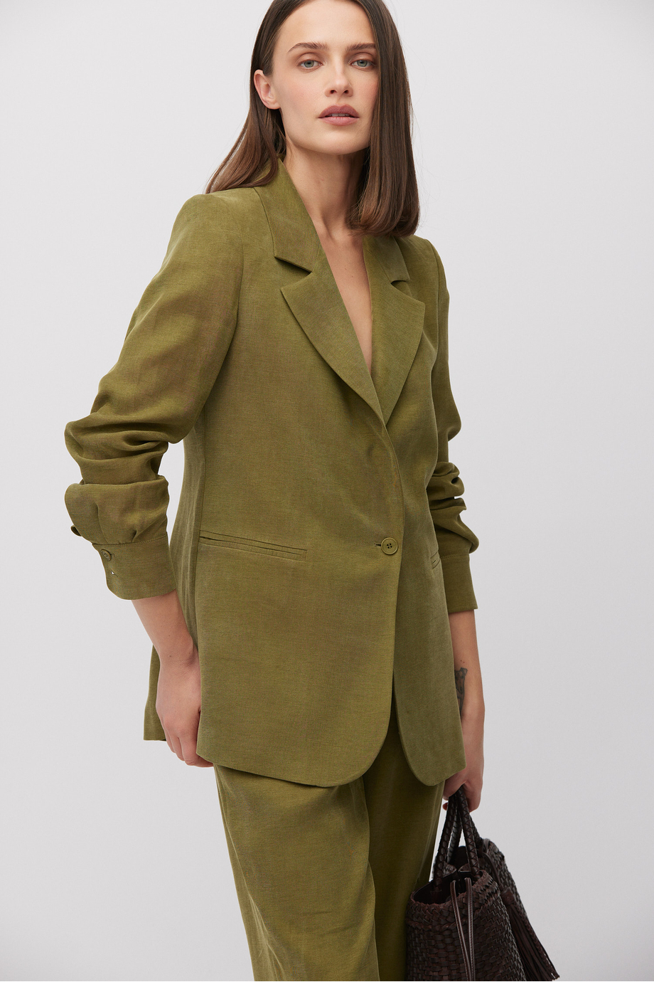 Zielony żakiet z mieszanki lnu i lyocellu. Prosta, luźna forma. Kołnierz, długi rękaw, zapięcie na guzik z orzecha naturalnego. Model na półpodszewce, z ozdobnym pipingiem. Do uzupełninia zestawu spodnie z tej samej tkaniny.