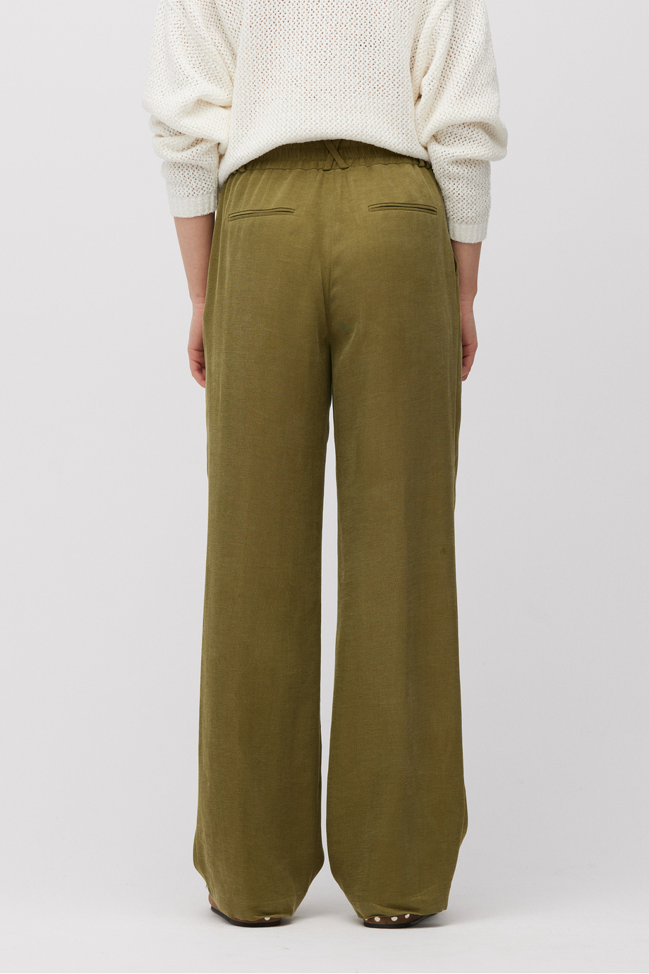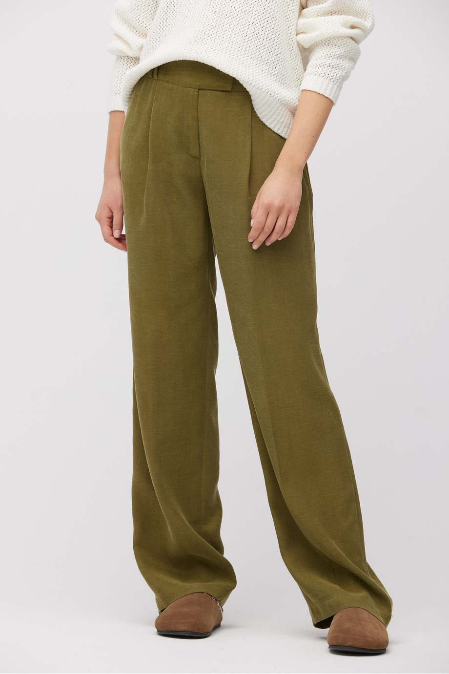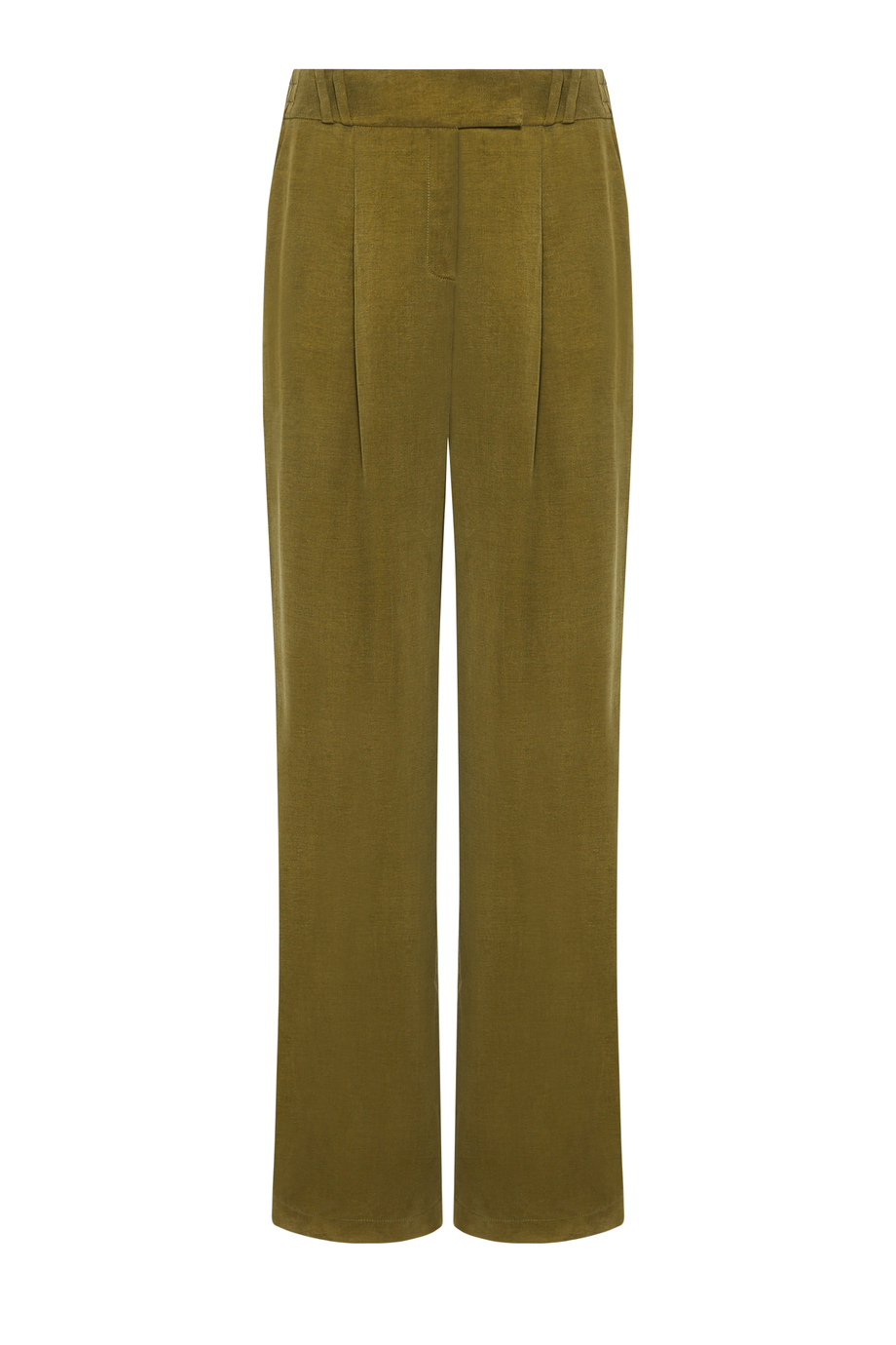 Spodnie z wysokim stanem uszyte z mieszanki lyocellu i lnu. Szeroka nogawka, zakładki, zapięcie na suwak, haczyk i guzik corozo od środka. Wnętrze z ozdobną lamówką. Kieszenie. Kolor zielony. Do uzupełnienia zestawu żakiet z tej samej tkaniny.