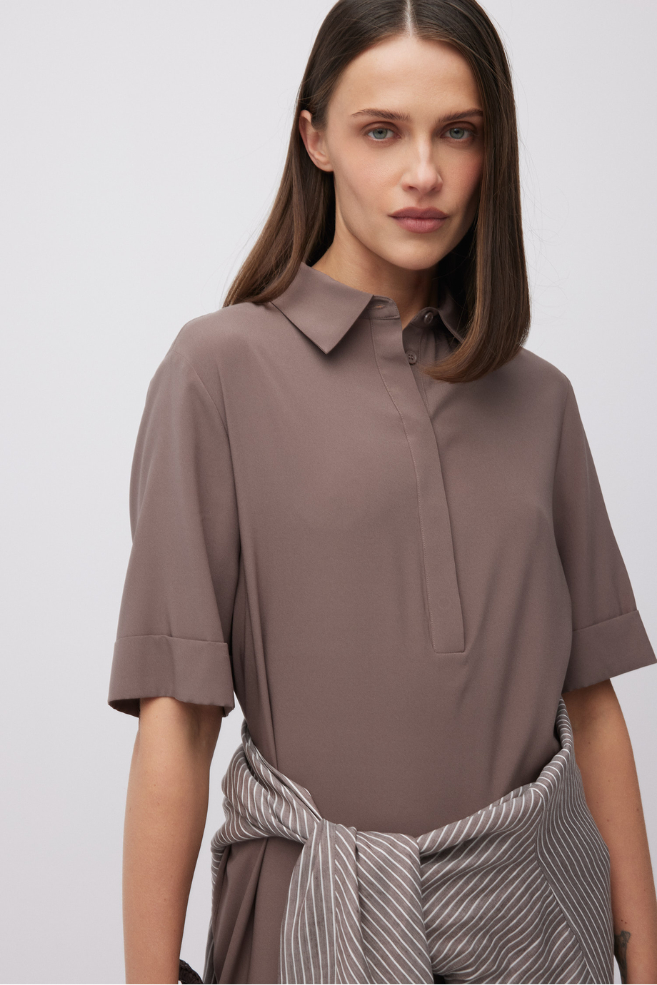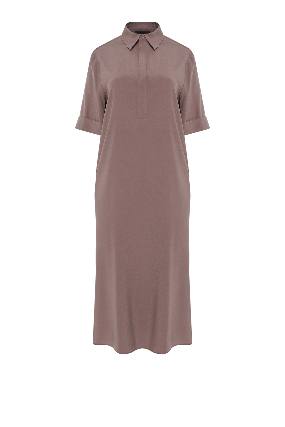 Koszulowa sukienka z jedwabiu. Fason prosty, luźny. Góra zapinana na guziki z macicy perłowej, w krytej listwie. Kołnierz, krótki rękaw.