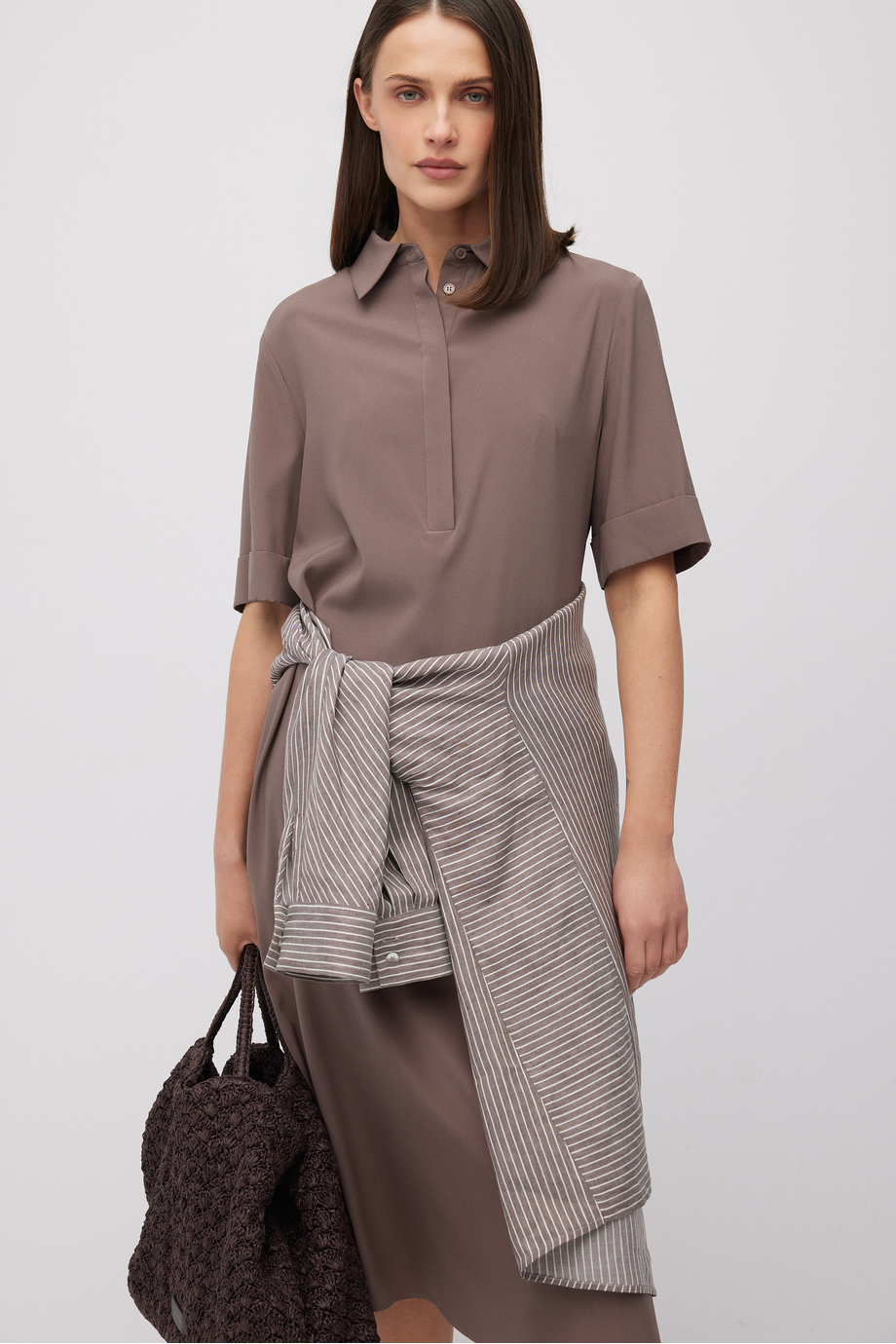 Beżowa midi sukienka koszulowa z jedwabiu
