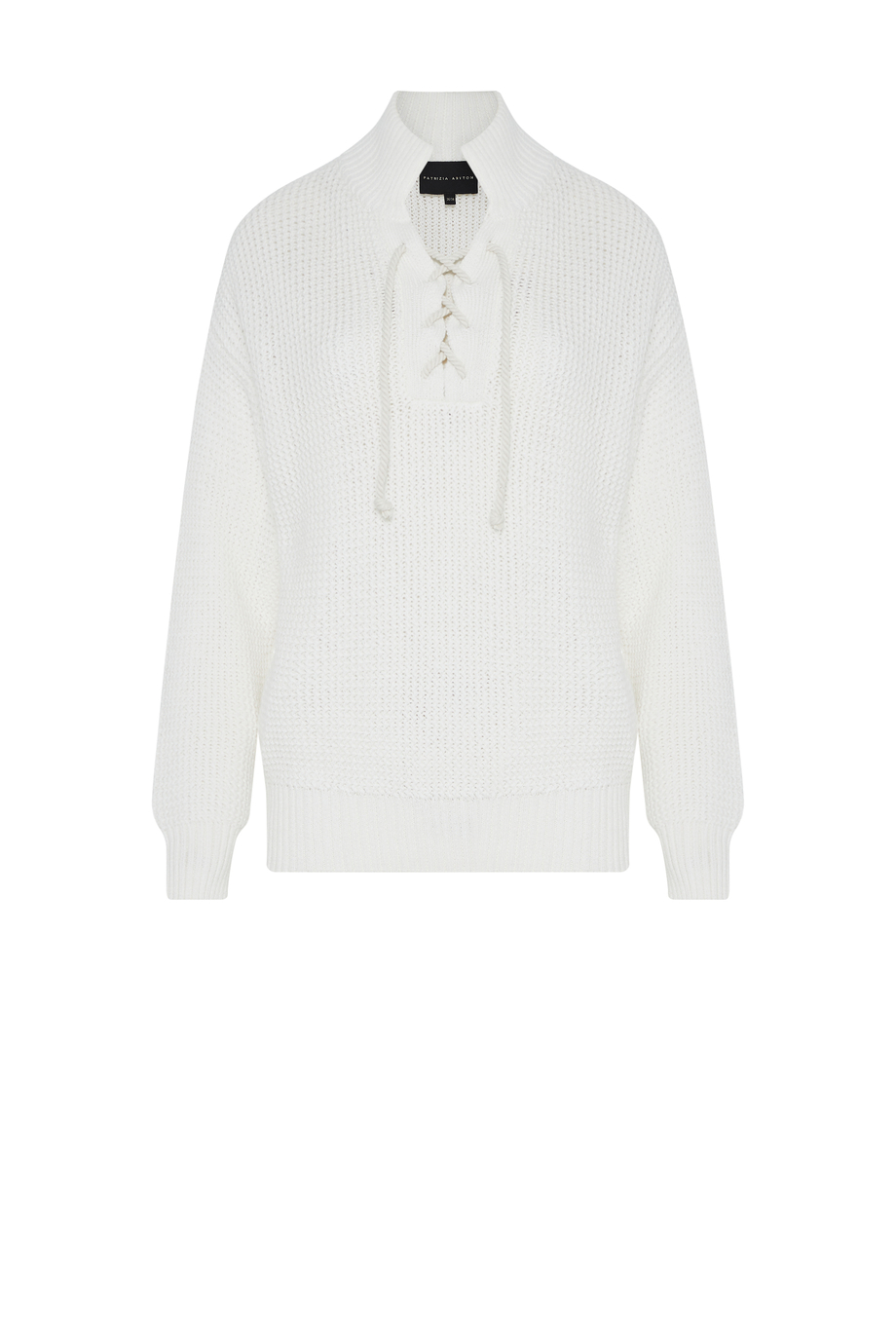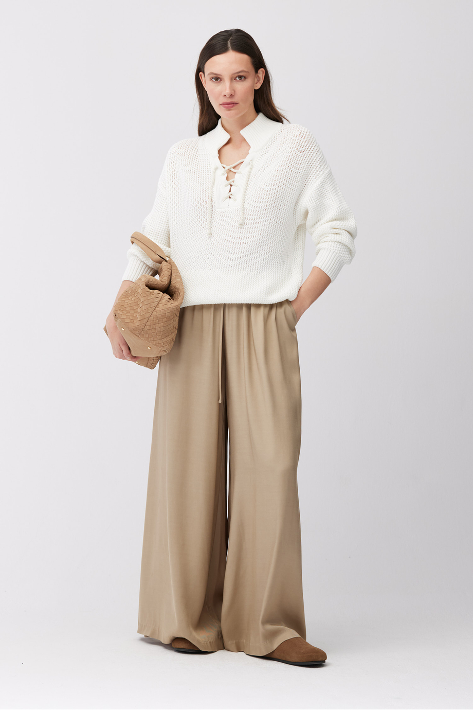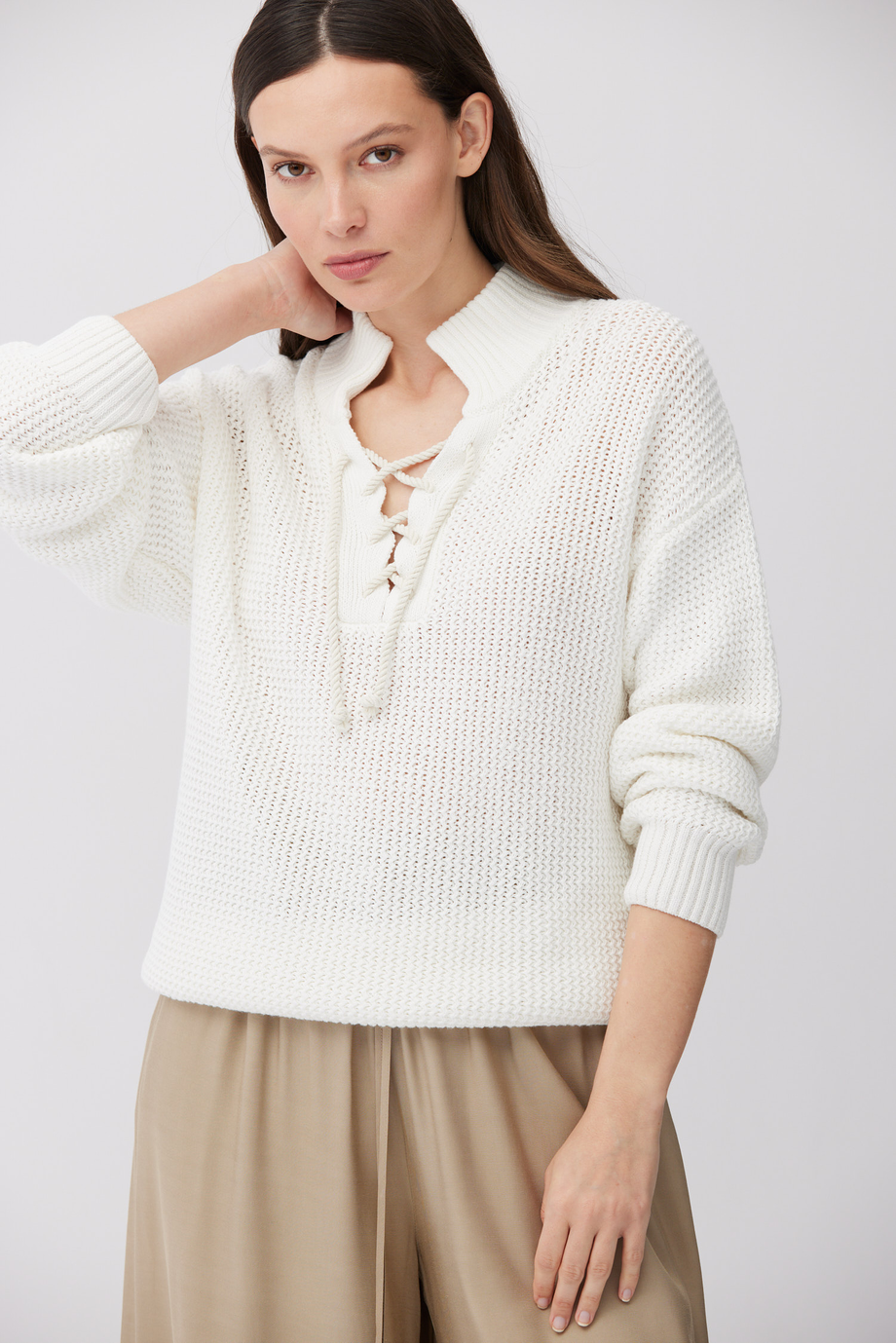 Ażurowy sweter z wiązaniem przy szyi. Luźna forma, długi rękaw. Miękka bawełniana dzianina o luźnym splocie, przygotowanym na maszynie o uigleniu 5 GG.