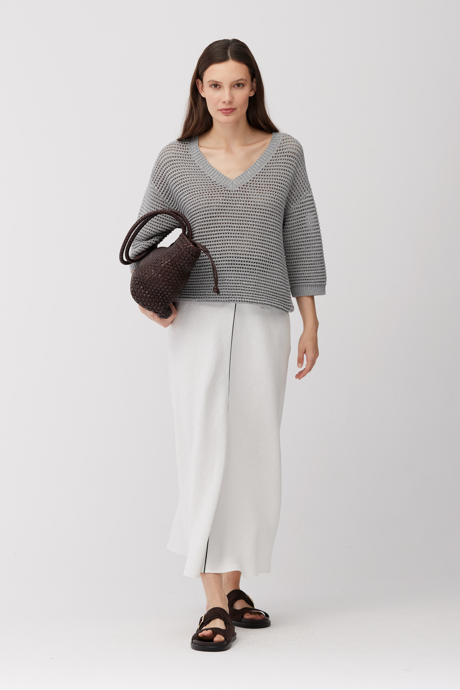 Sweter z bawełną i lnem. Dekolt w szpic, rękaw 3/4, swobodny fason. Dzianina o luźnym, ażurowym splocie, wykonana na maszynie o uigleniu 5 GG. Kolor szary.