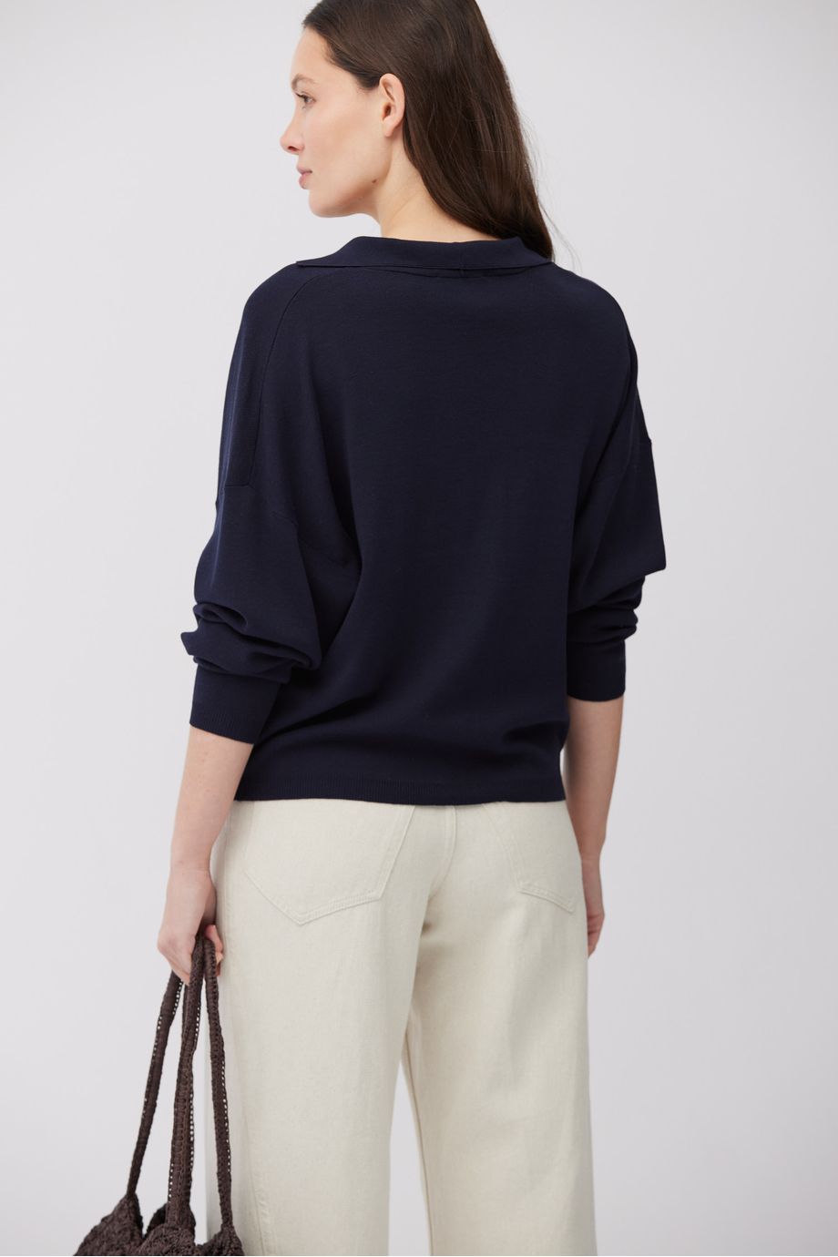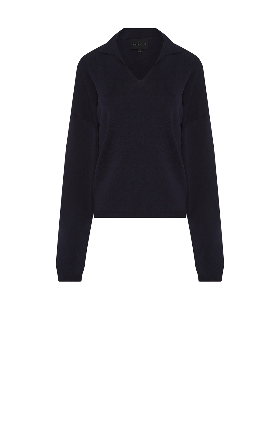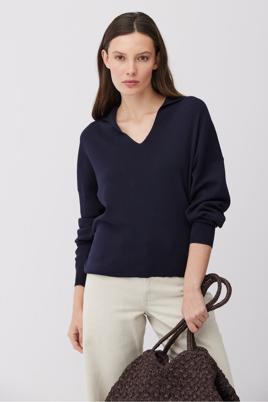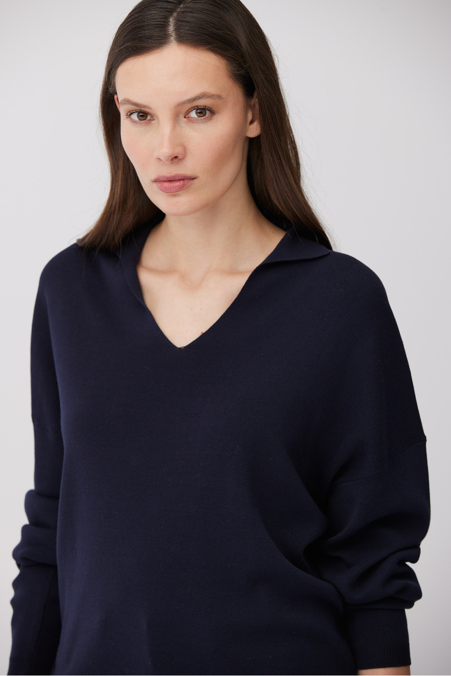 Granatowa bluzka z mieszanki bawełny i jedwabiu. Luźna forma, dekolt w szpic, kołnierz polo. Model z długi rękawem. Miękka dzianina o gęsty splocie, przygotowanym na maszynie o uigleniu 16 GG.