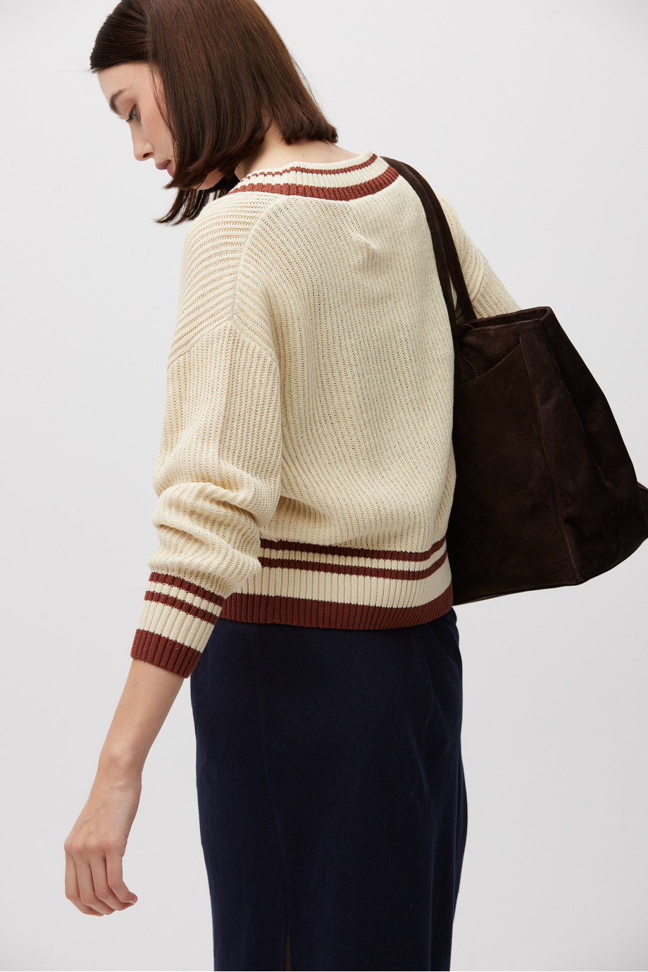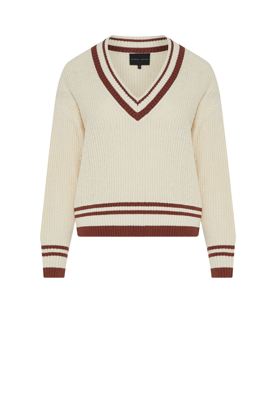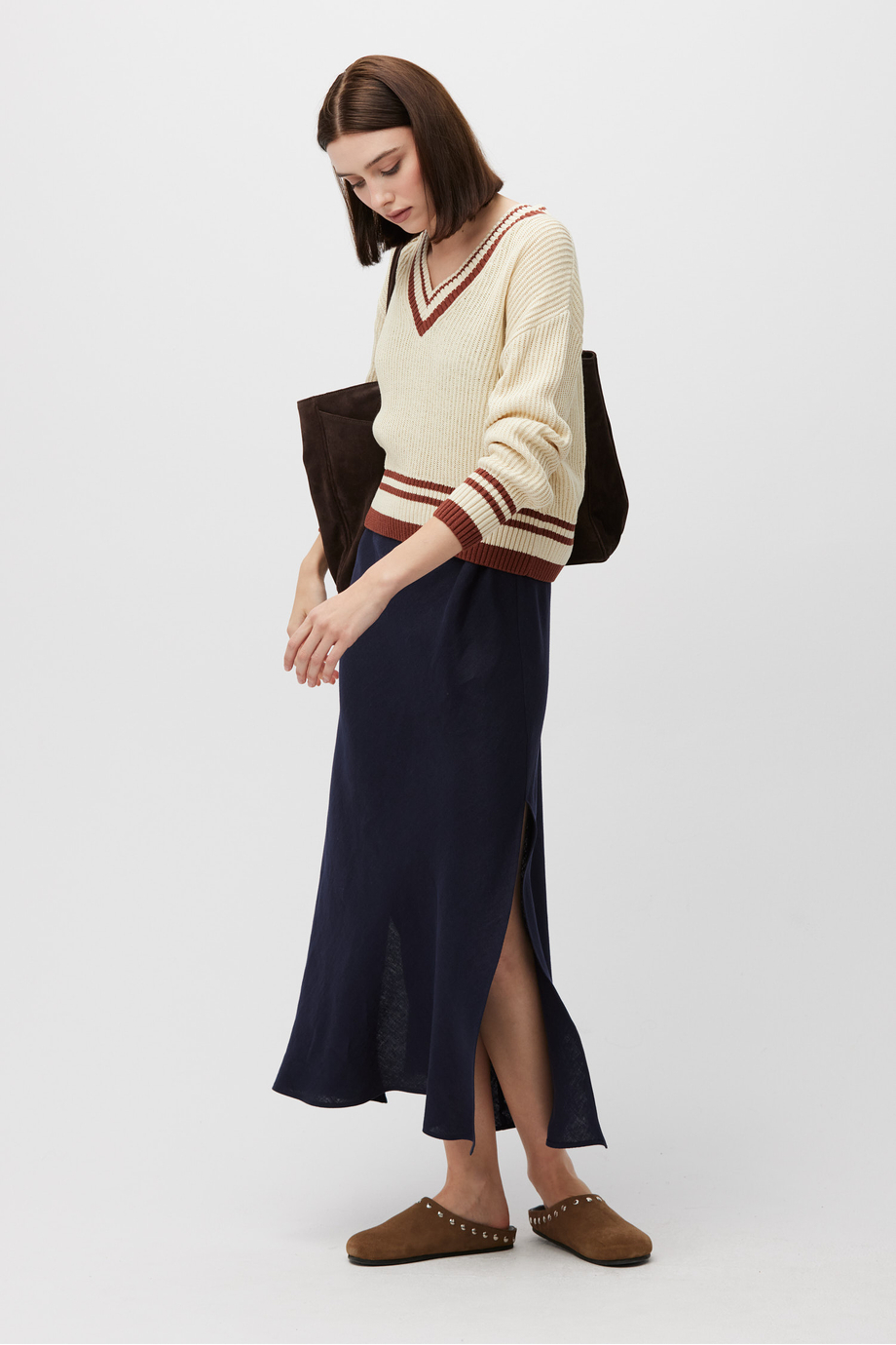 Sweter z dekoltem w szpic z mieszanki bawełny z lnem. Luźny fason, długi rękaw. Miękka dzianina o luźnym splocie wykonana na maszynie o uigleniu 5 GG.