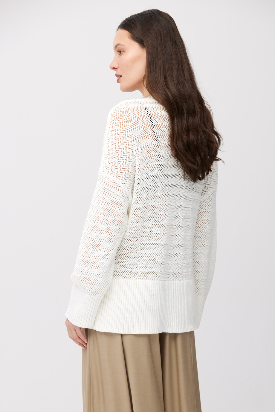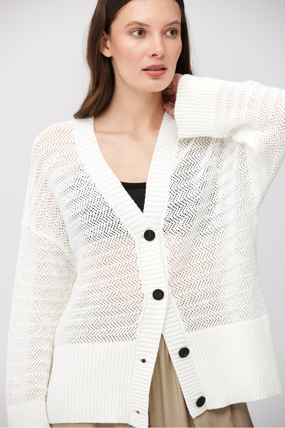 Ażurowy kardigan zapinany na guziki. Luźna forma, dekolt w szpic, długi rękaw. Miękka bawełniana dzianina o luźnym splocie przygotowana na maszynie o uigleniu 5 GG.