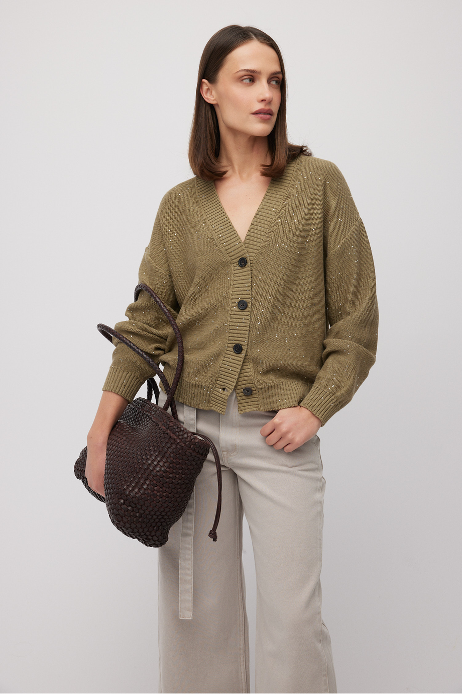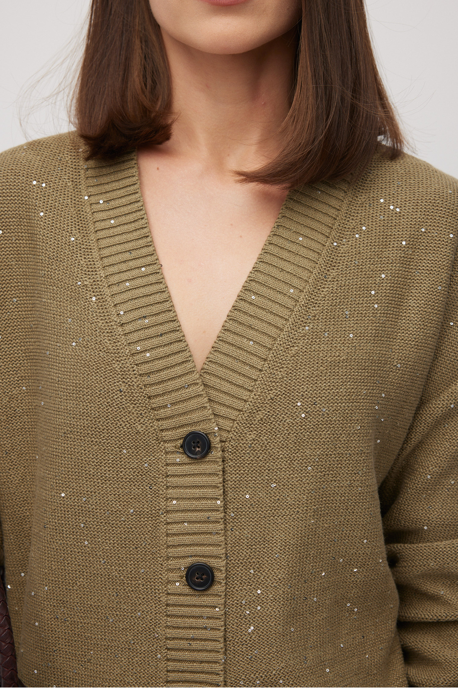 Oliwkowy kardigan z mieszanki bawełny i lnu. Dzianina o luźnym splocie single jersey, z wplecionymi cekinami, wykonana na maszynie o uigleniu 5 GG. Zapięcie na naturalne guziki z rogu bawolego.