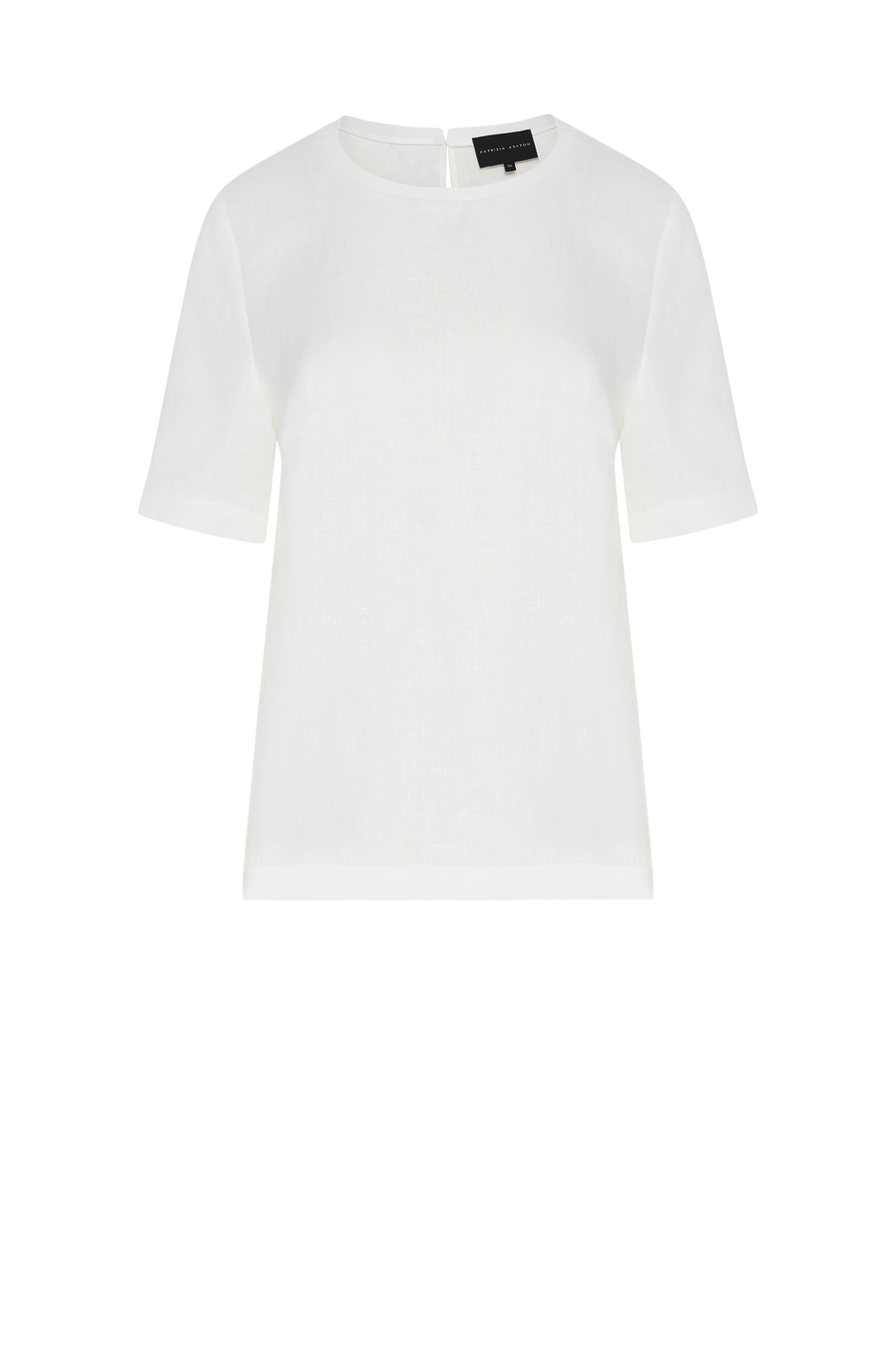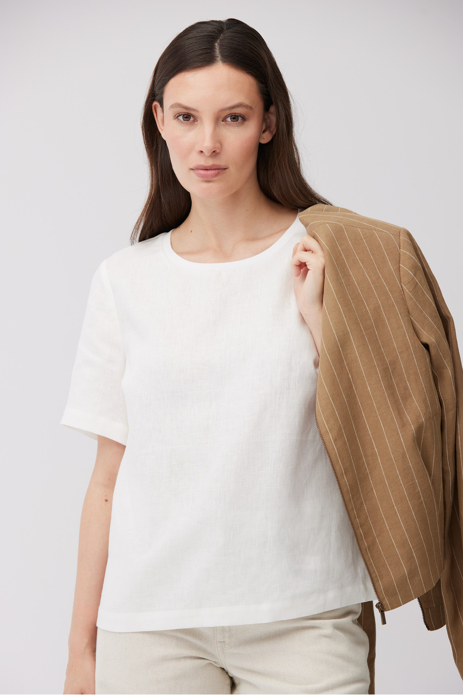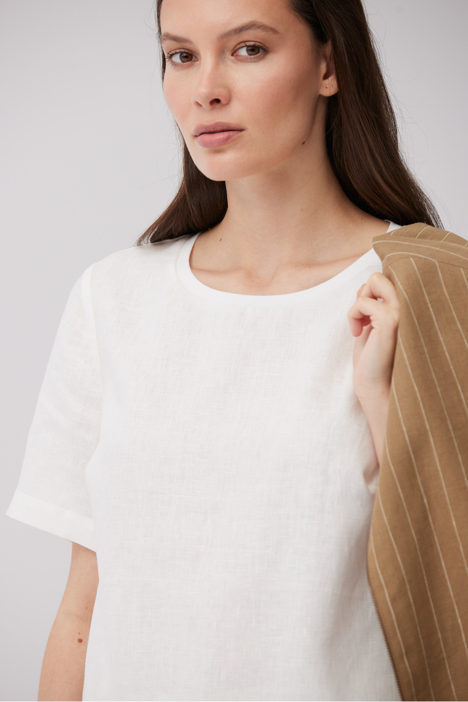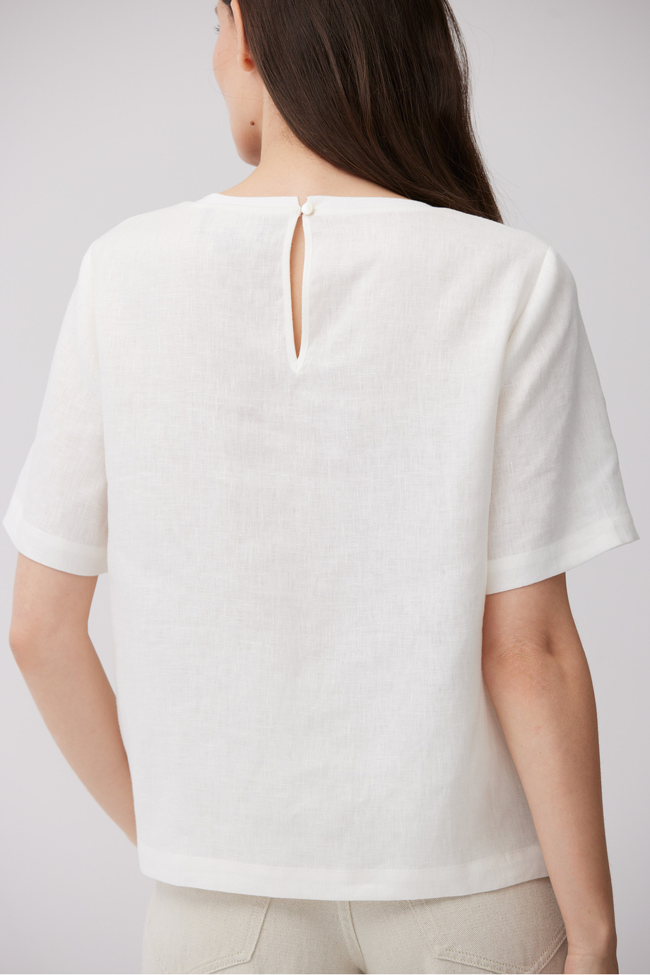 Biała bluzka z lnu. Okrągły dekolt, krótki rękaw, fason pudełkowy. Z tyłu zapięcie na guzik.