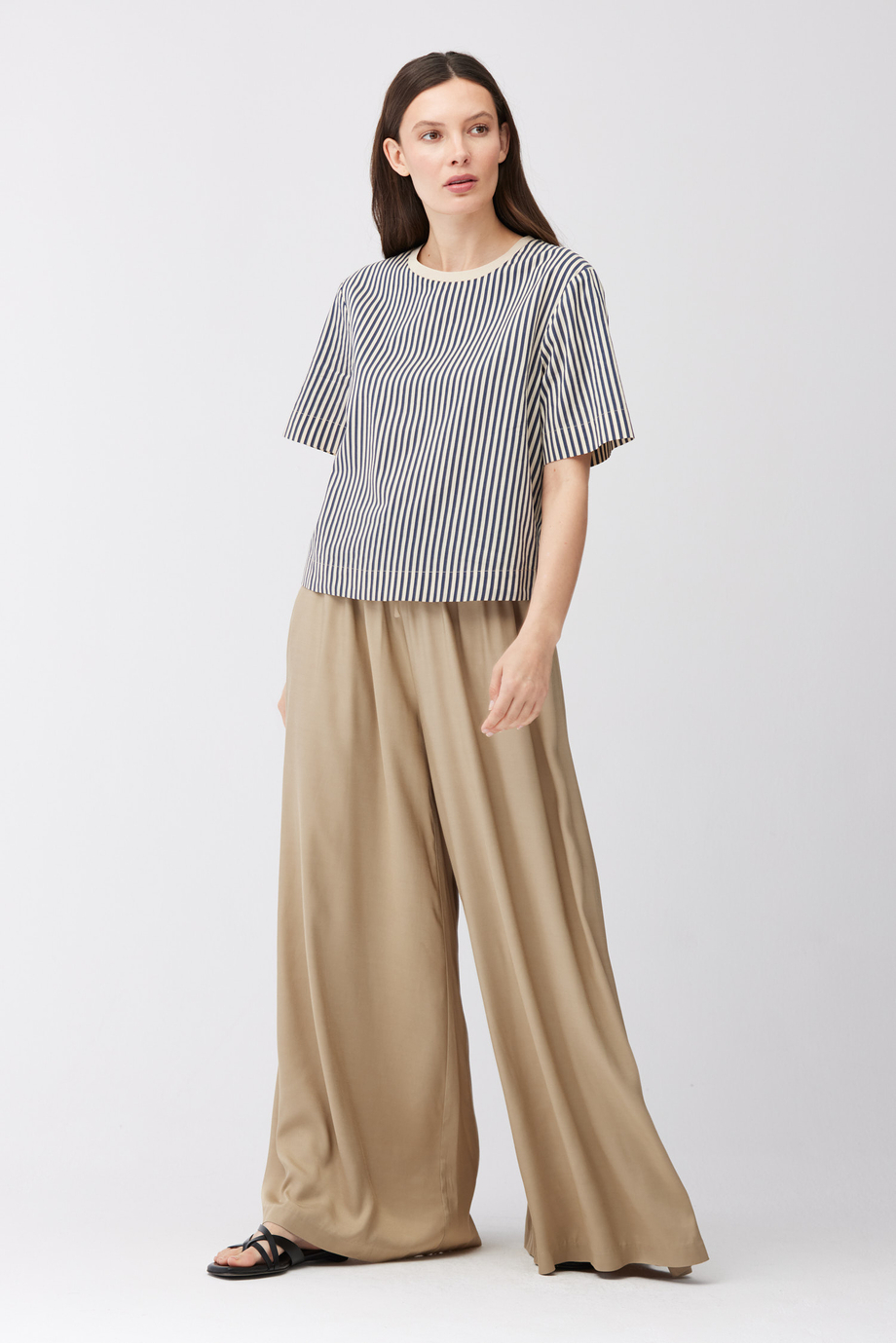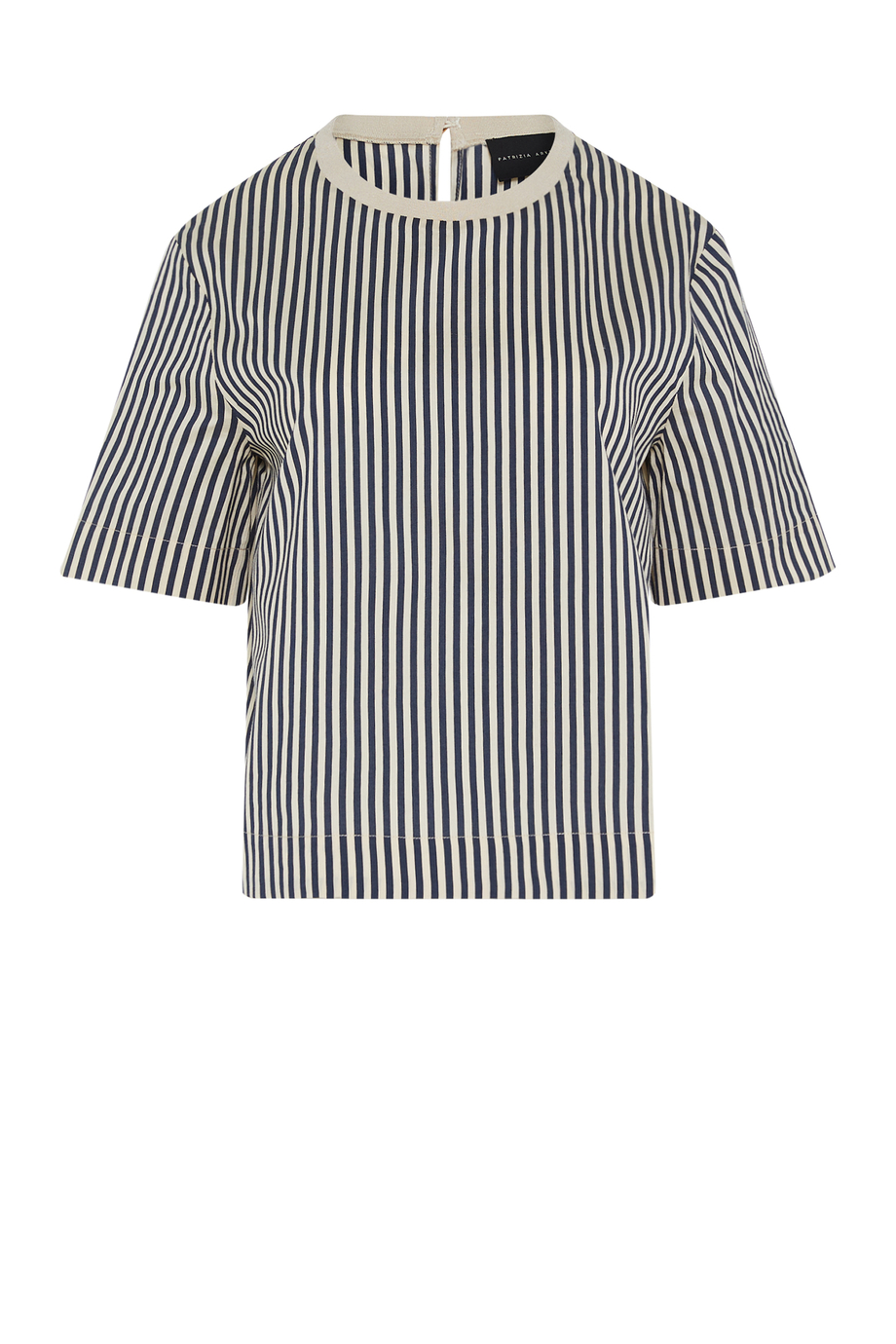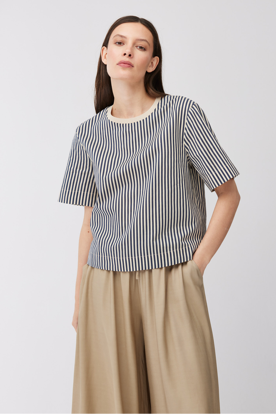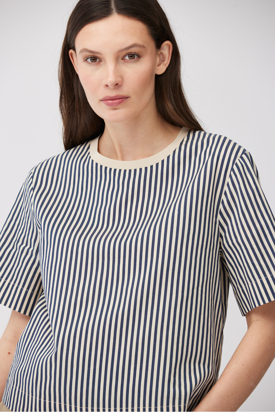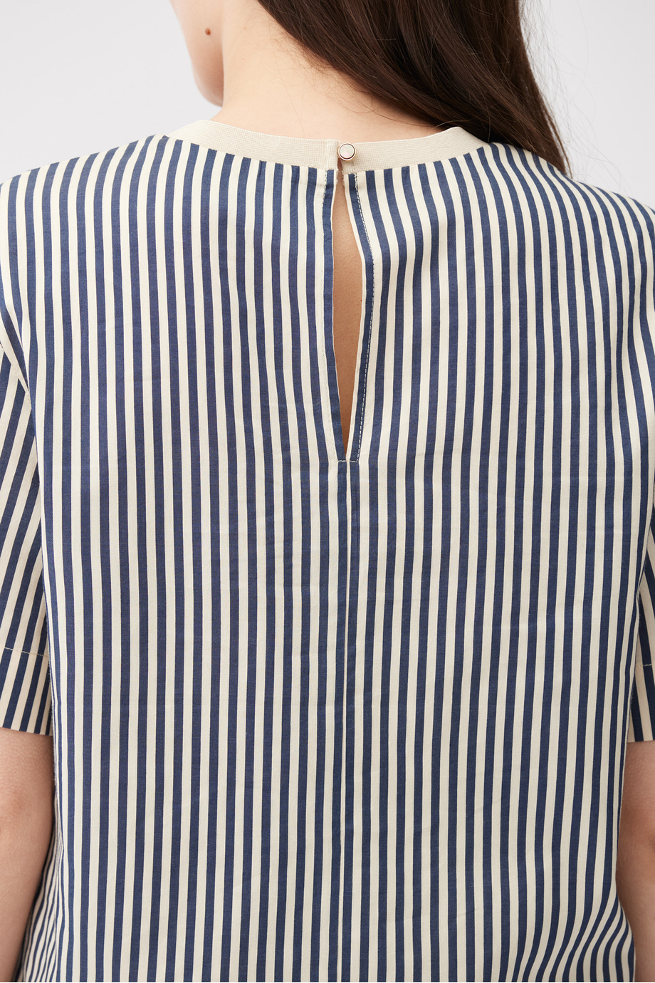 Bluzka w paski z mieszanki bawełny i jedwabiu. Okrągły dekolt, krótki rękaw, fason pudełkowy. Z tyłu zapięcie na guzik.