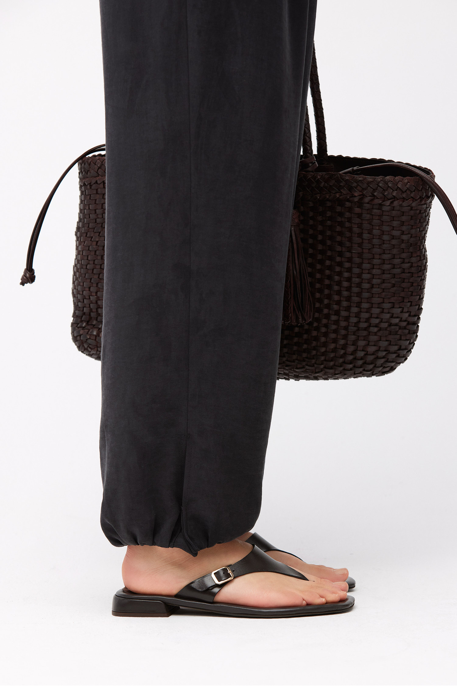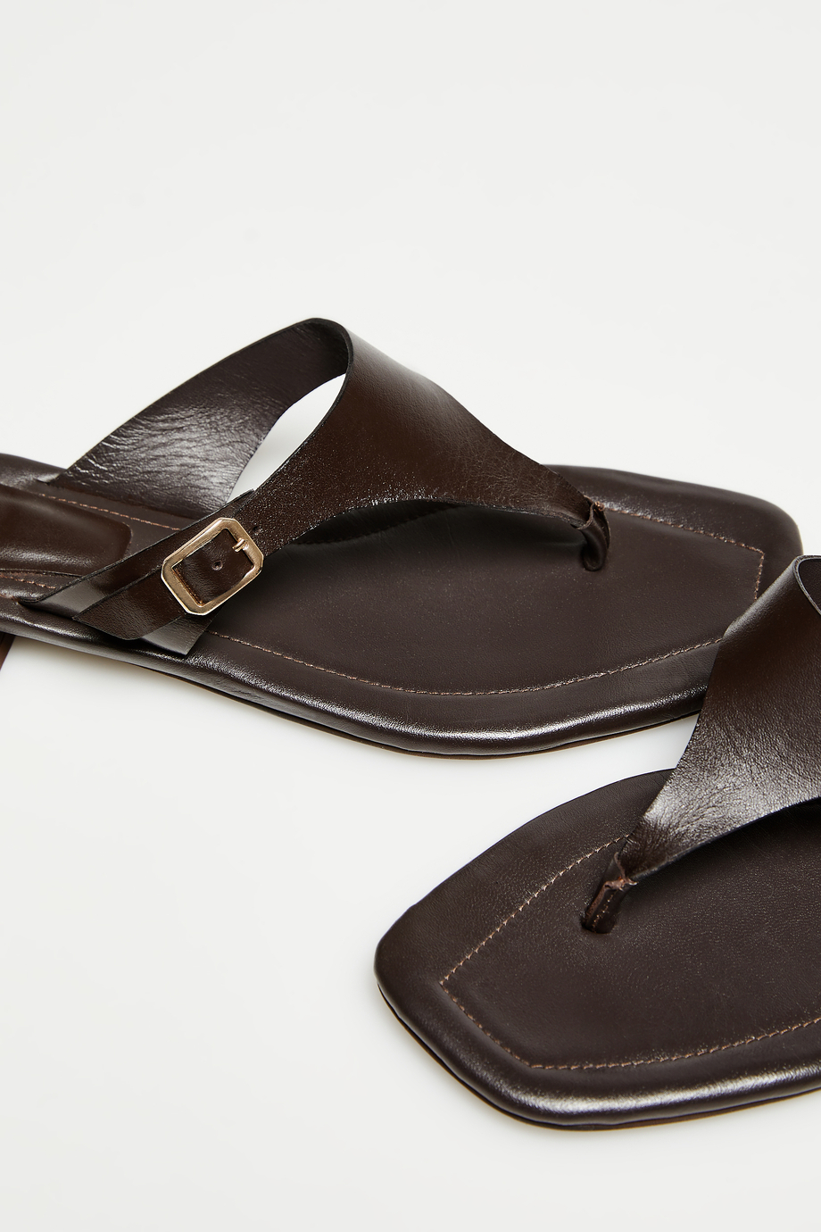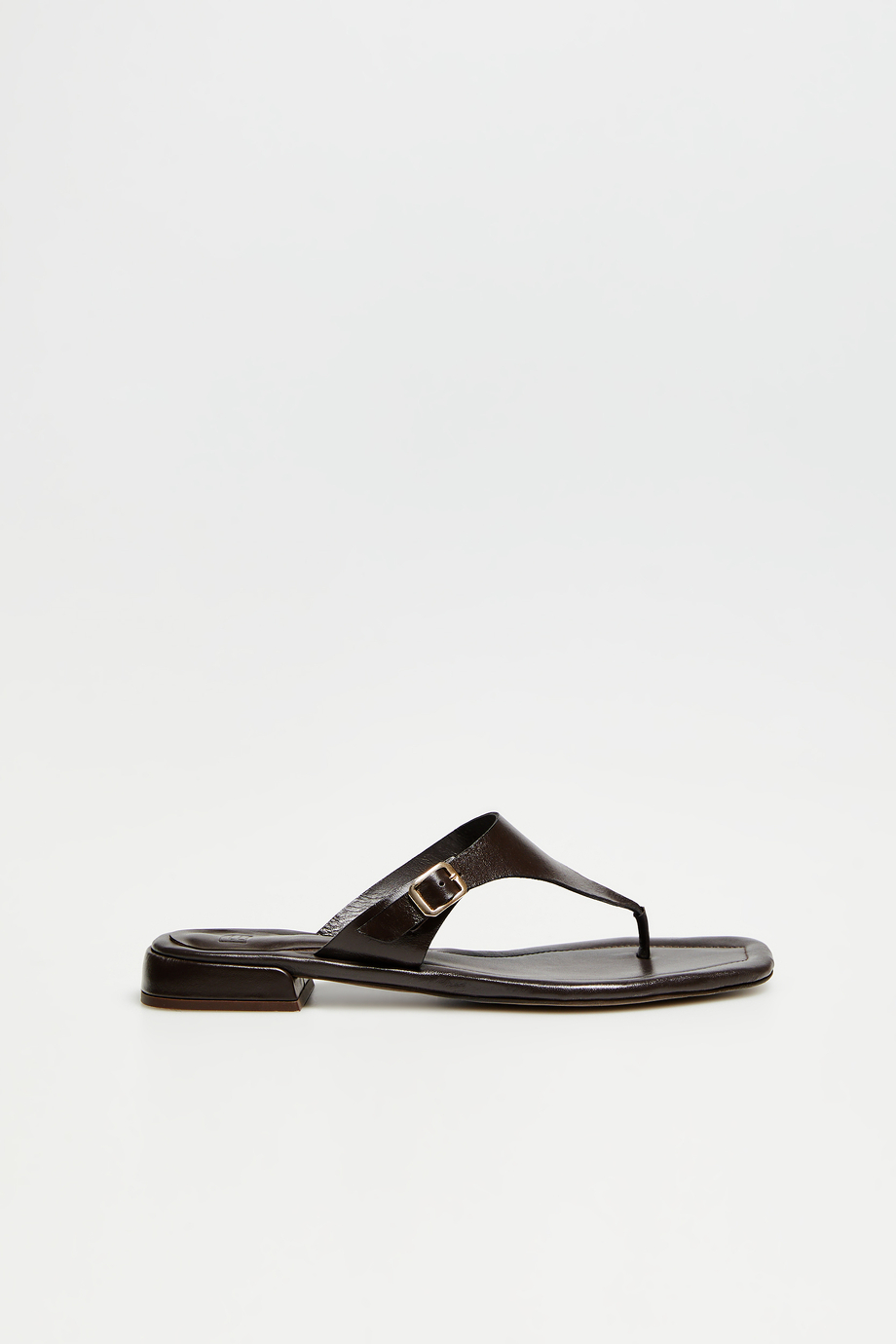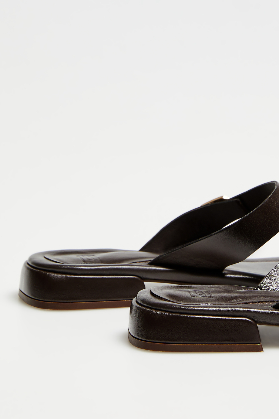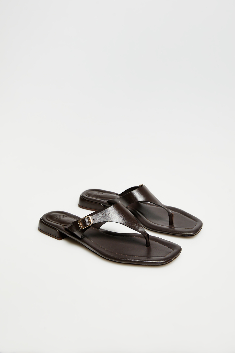 Brązowe klapki z klamerką w kolorze złota. Wykonane z miękkiej skóry cielęcej. Uszyte ręcznie w polskiej manufakturze.