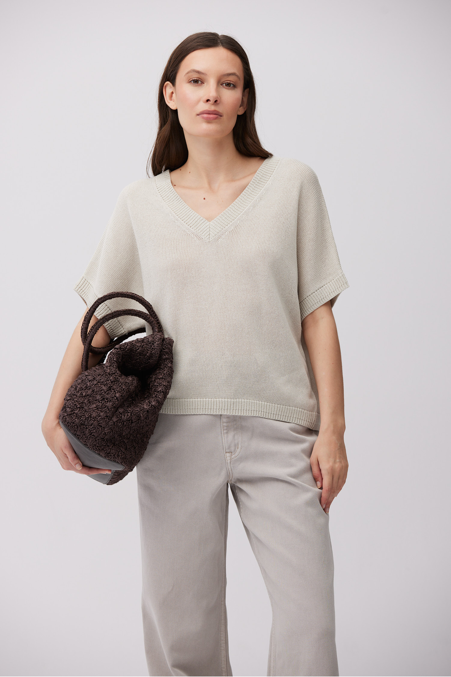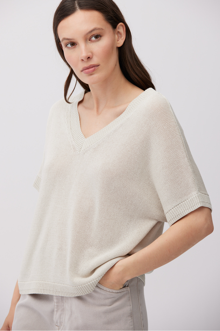 Sweter z mieszanki lnu i lyocellu. Krótki rękaw, dekolt w szpic. Miękka, chłodna w dotyku dzianina. Luźny splot wykonany na maszynie o uigleniu 7 GG. Fason prosty, swobodny. Kolor beżowy.