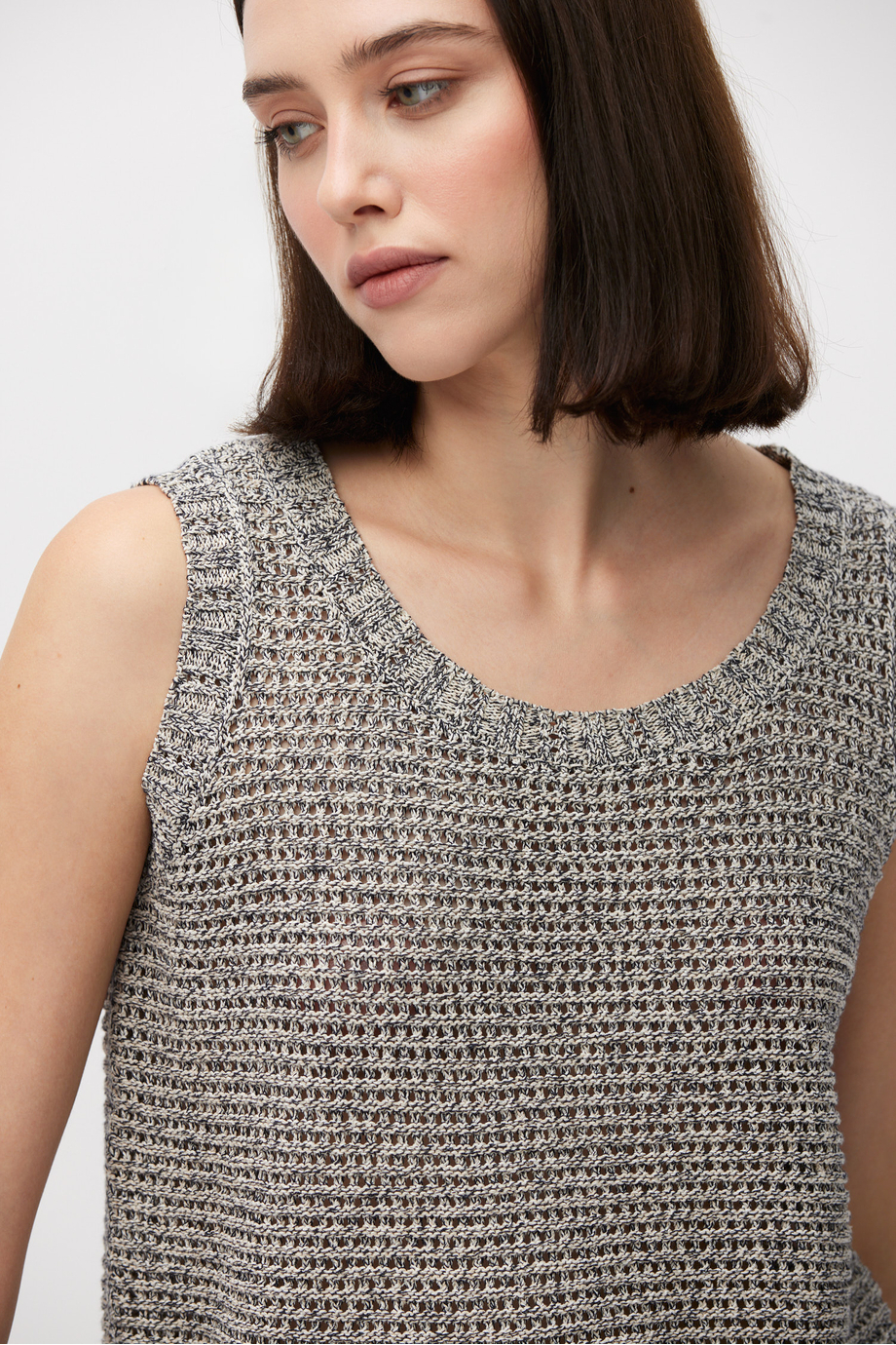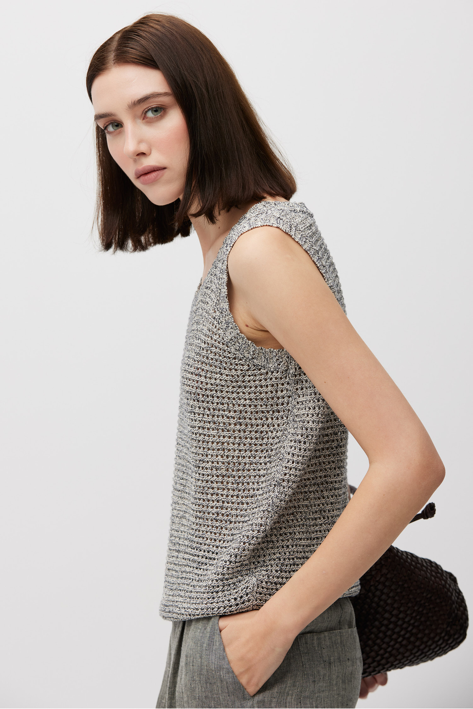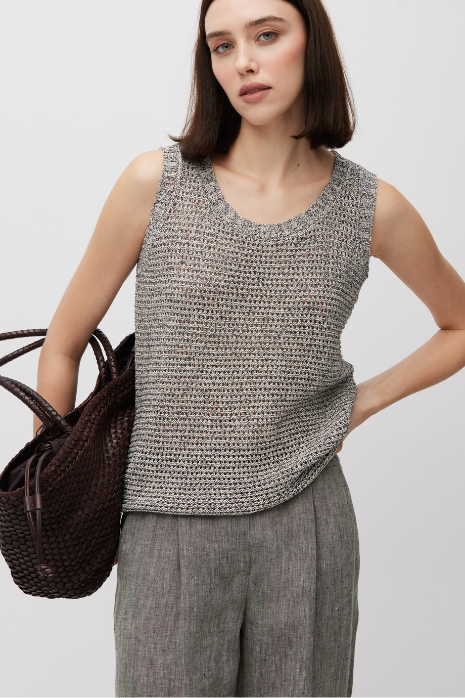 Top z mieszanki bawełny, lnu i lyocellu. Szerokie ramiączka, okrągły dekolt, fason swobodny. Dzianina o luźnym splocie. Kolor szary melanż.