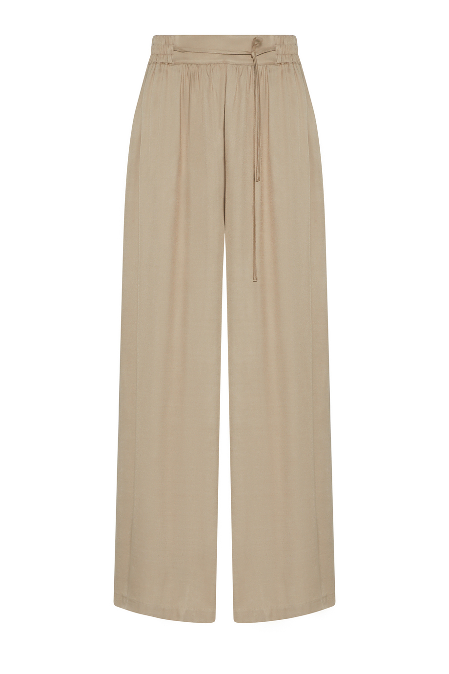 Beżowe spodnie z szeroką nogawką. Opływowa tkanina z delikatnym połyskiem. Wnętrze z ozdobną lamówką. Wiązanie i gumka w talii. Kieszenie.