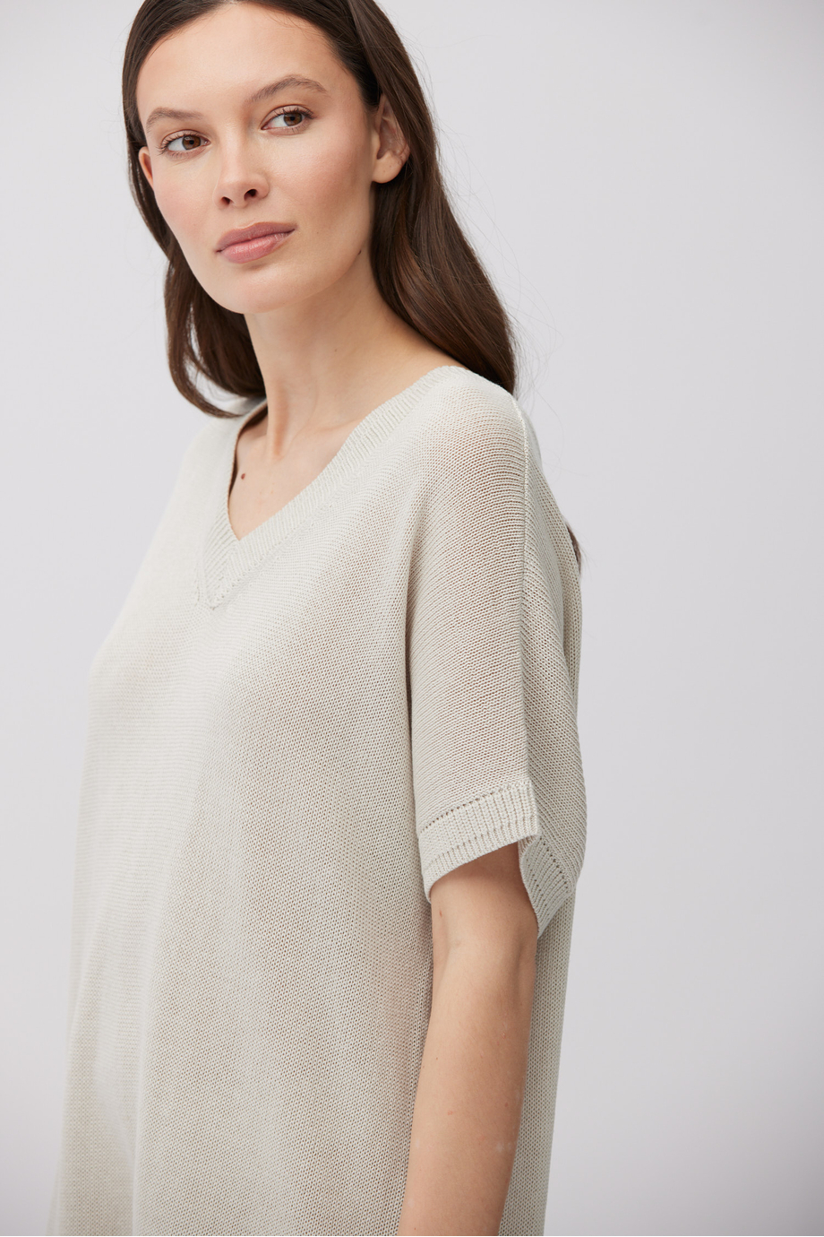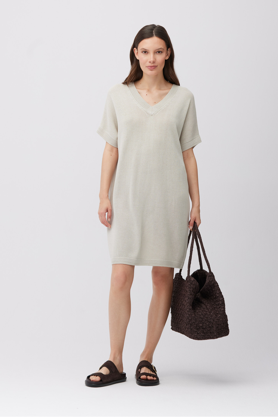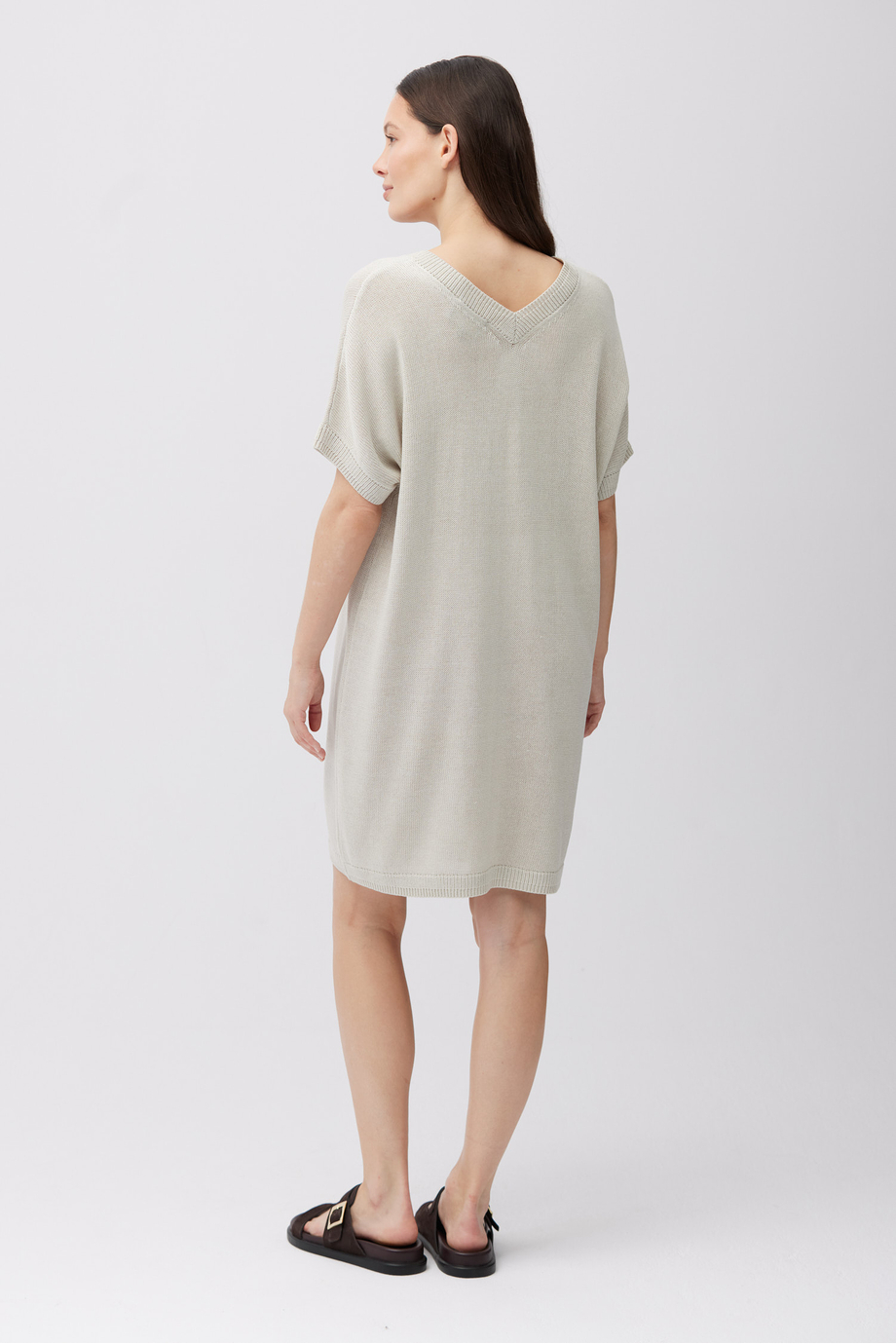 Luźna sukienka z mieszanki lnu i lyocellu. Prosta forma, krótki rękaw, dekolt w szpic. Miękka, chłodna w dotyku dzianina o luźnym splocie wykonanym na maszynie o uigleniu 7 GG.