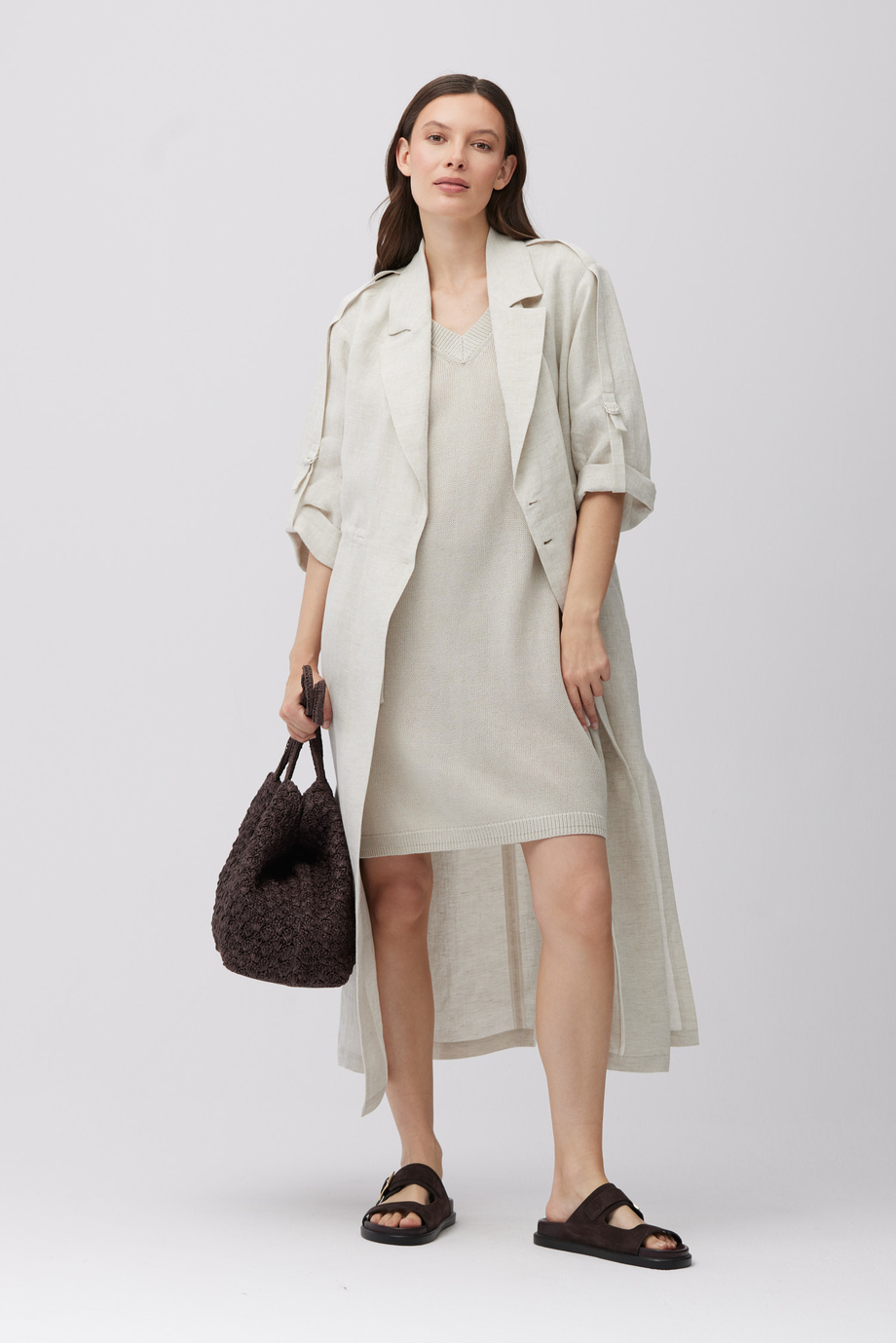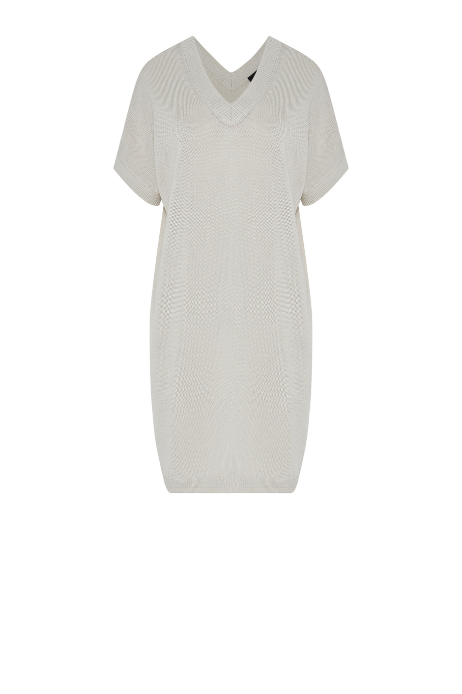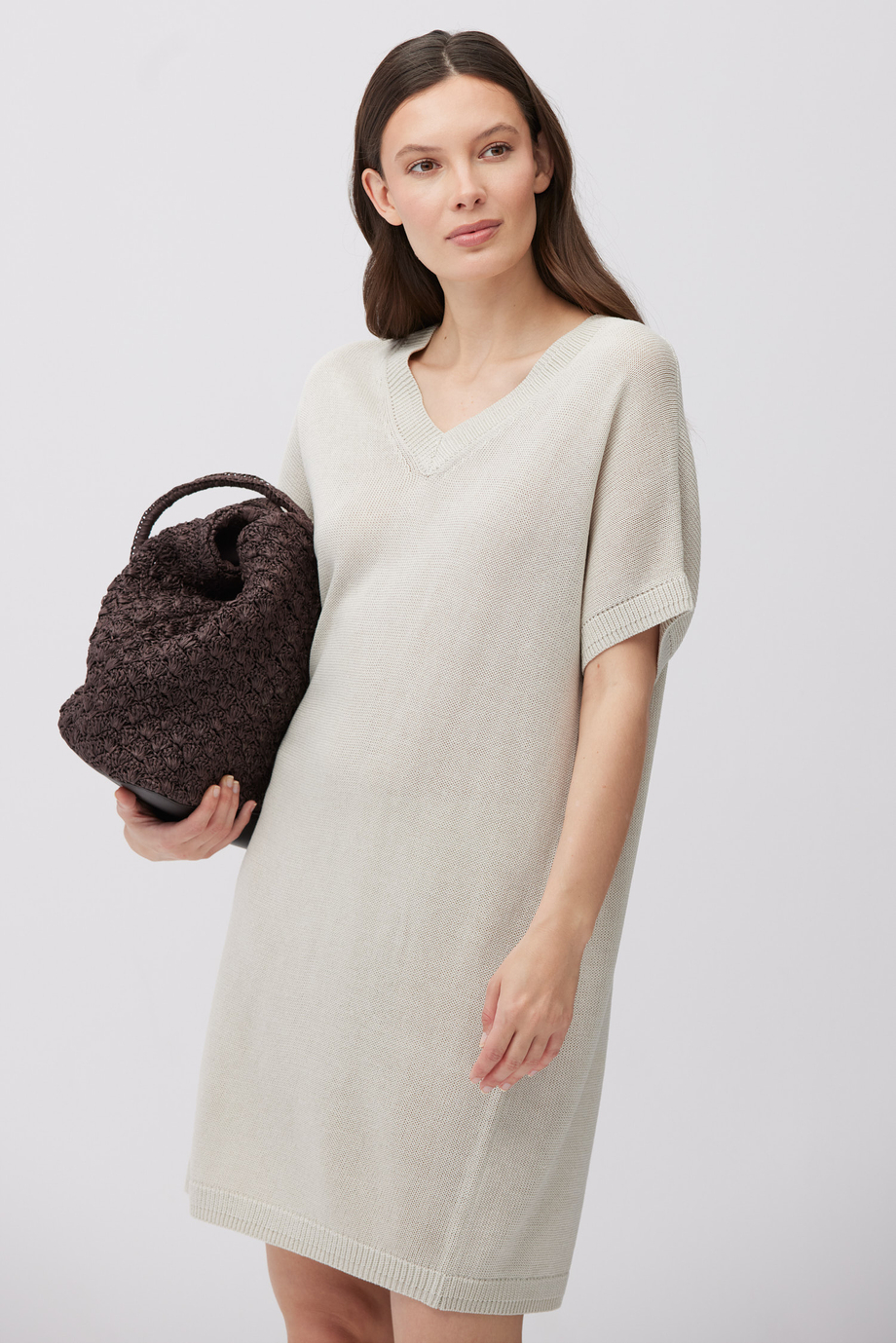 Luźna sukienka z mieszanki lnu i lyocellu. Prosta forma, krótki rękaw, dekolt w szpic. Miękka, chłodna w dotyku dzianina o luźnym splocie wykonanym na maszynie o uigleniu 7 GG.