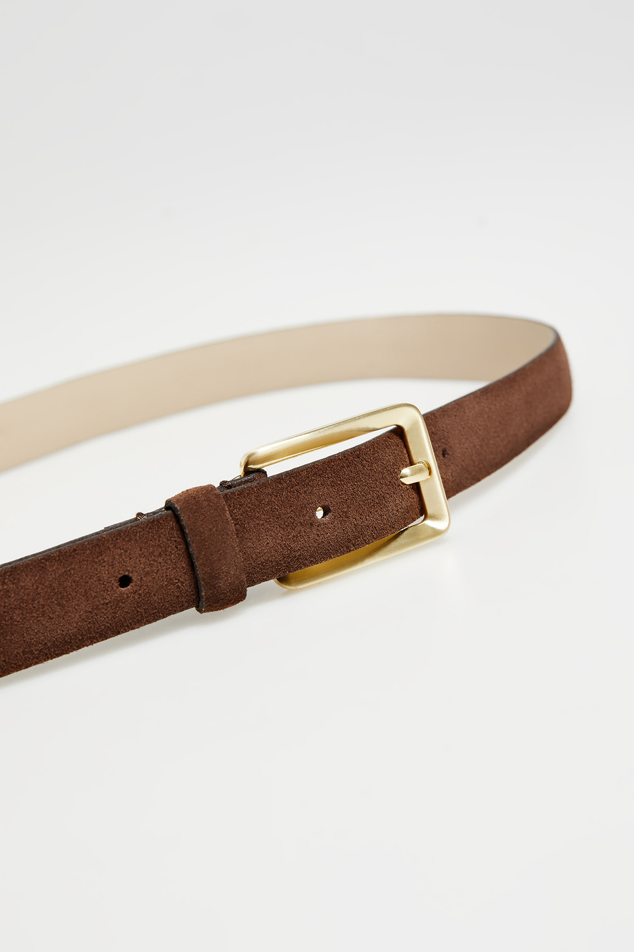 Cienki pasek ze skóry zamszowej. Klamra w kolorze złota. Kolor brązowy. Model uszyty ręcznie w portugalskiej manufakturze.