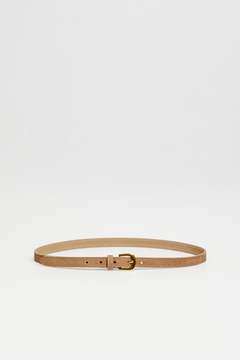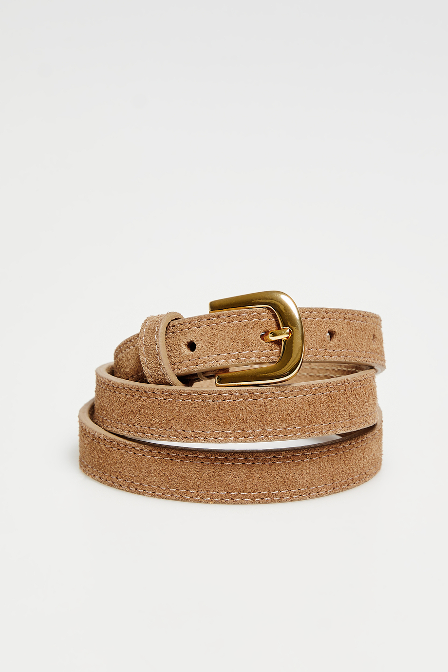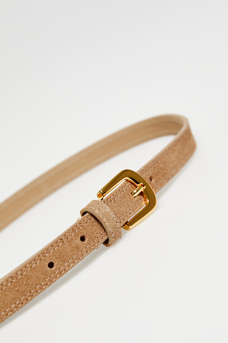Cienki pasek ze skóry zamszowej. Klamra w kolorze złota. Kolor koniakowy. Model uszyty w portugalskiej manufakturze.